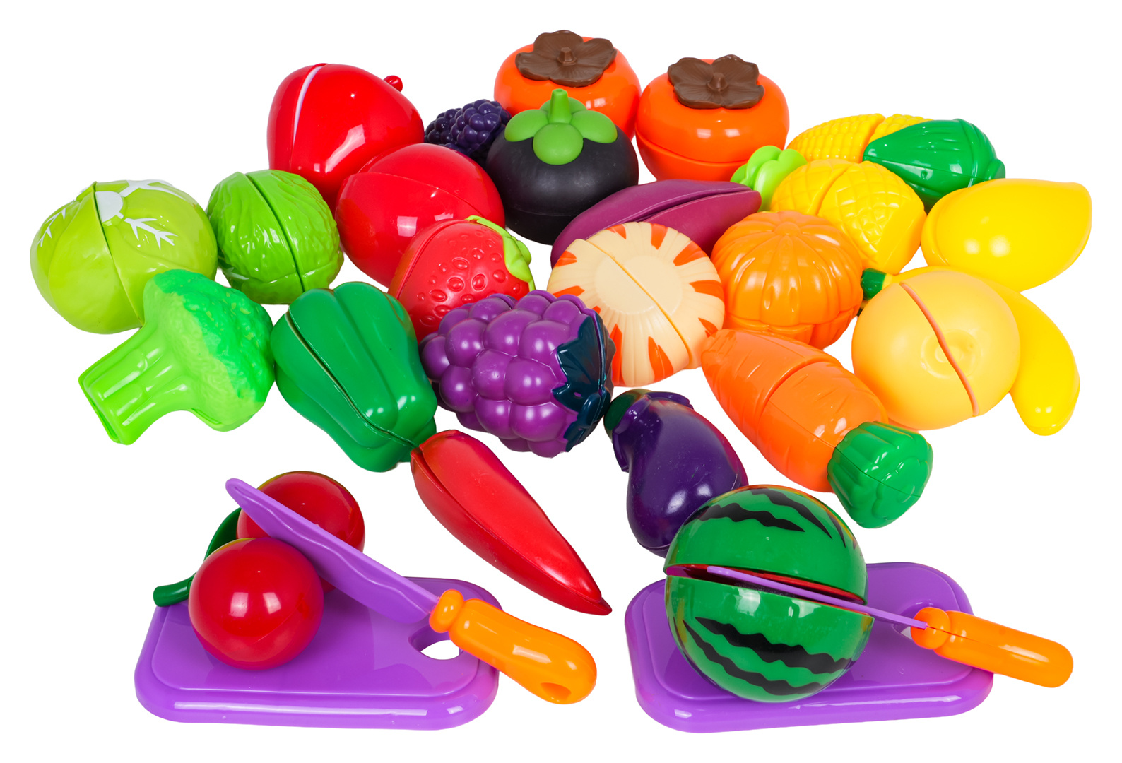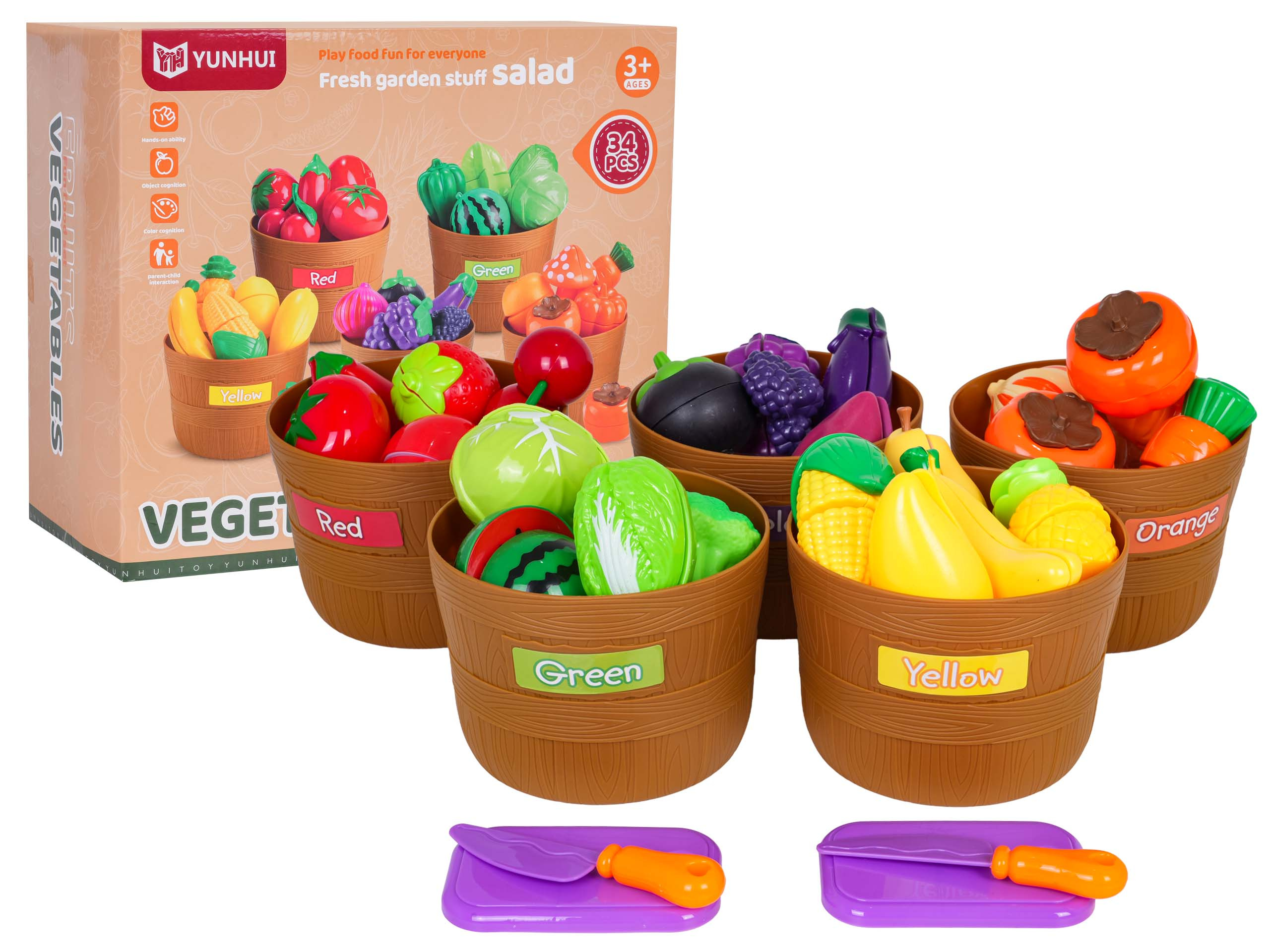 Barevná, bohatě vybavená sada ovoce a zeleniny pro děti od tří let. Prvky sady byly vyrobeny z nejkvalitnějšího plastu a bohatství barev přitahuje pozornost dítěte. V sadě se nachází až 34 prvků: zelenina, ovoce na suchý zip, koše na třídění ovoce a zeleniny, nože a prkénka na krájení.