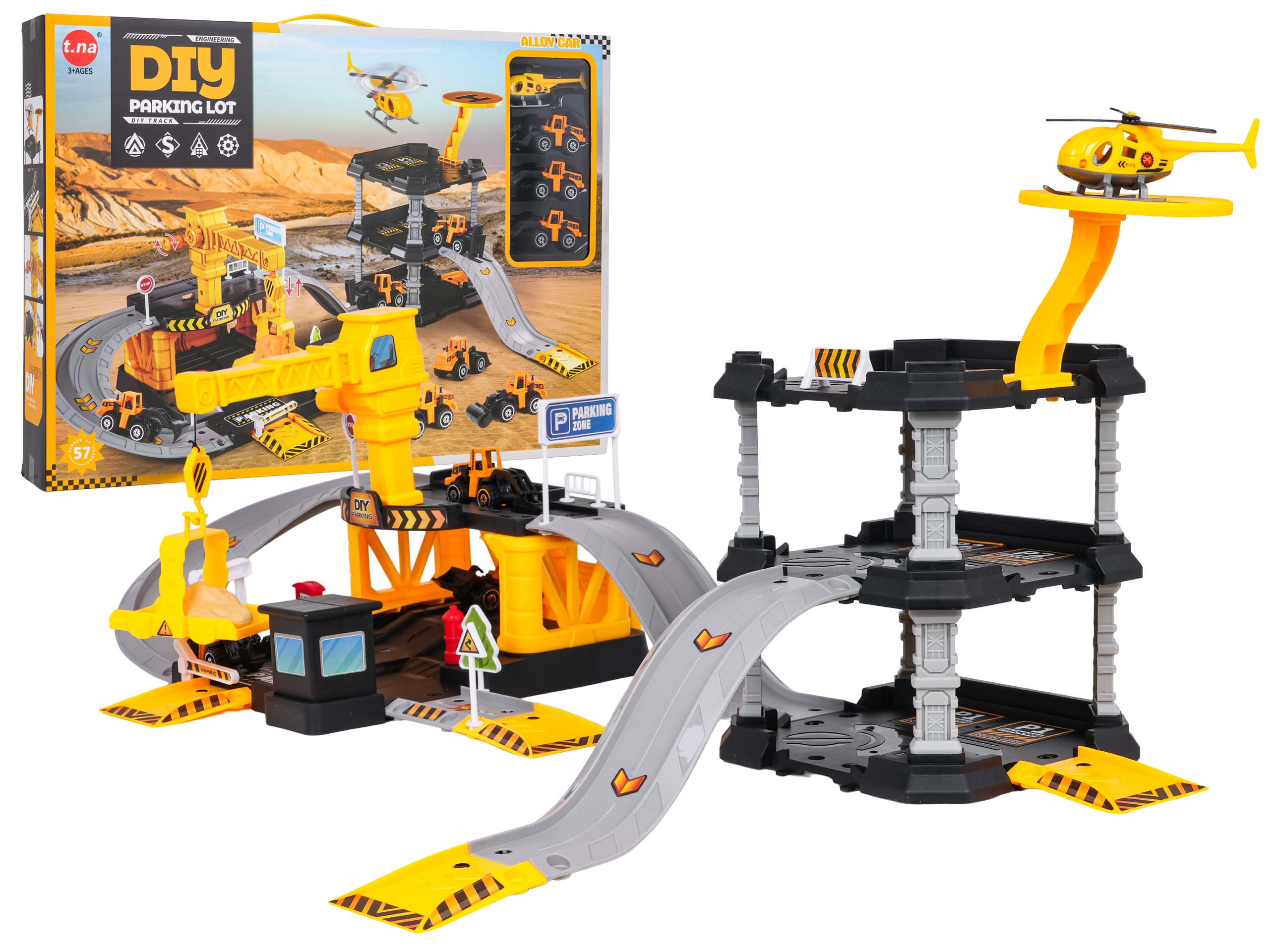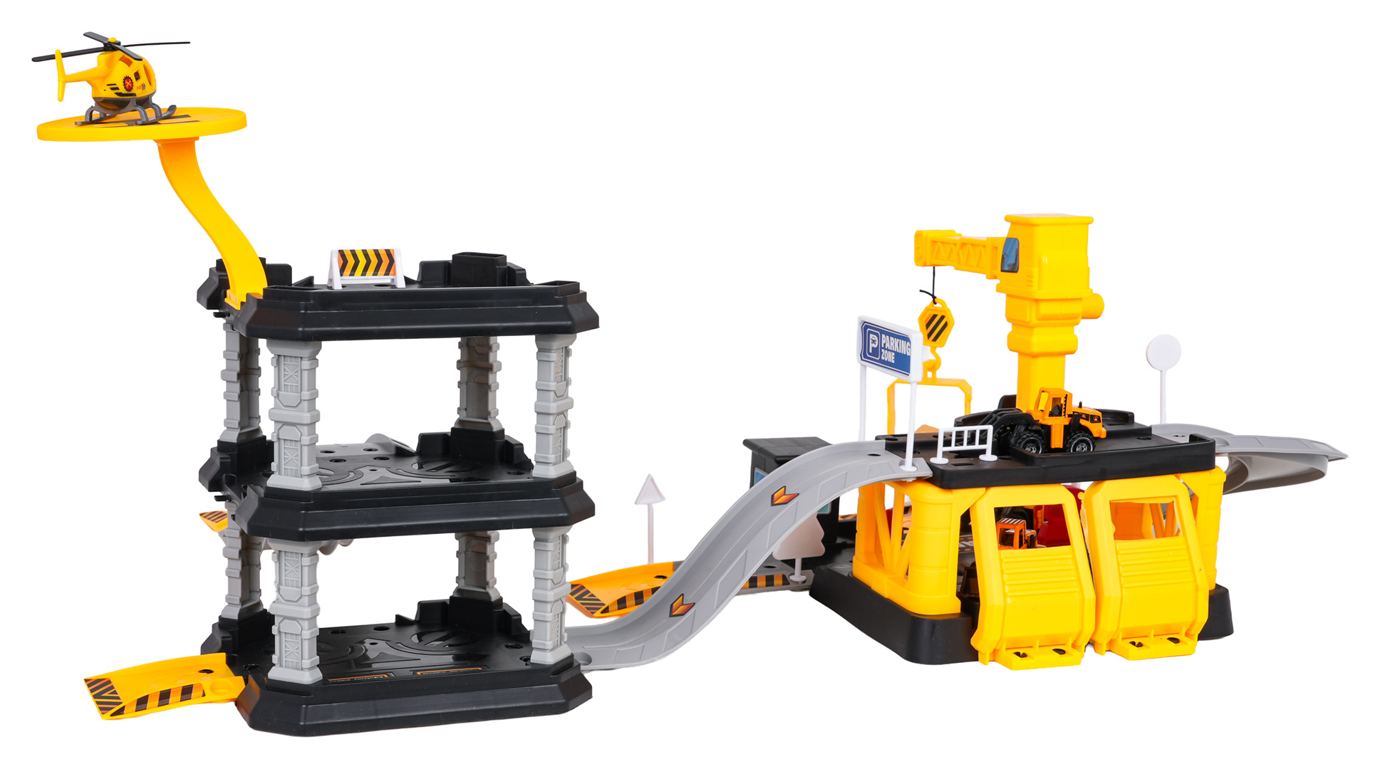 Sada parkoviště a staveniště se stavebními autíčky pro děti od tří let. Staveniště bylo vybaveno jeřábem se spouštěcím hákem a skluzavkou pro stavební vozidla. Z místa stavby mohou autíčka přejet na tříúrovňové parkoviště se skluzavkou. Na vrcholu parkoviště je také letiště. Sada obsahuje 3 stavební vozidla: auto s kladivem, nakladač a rypadlo, a také vrtulník. Ideální sada pro kreativní zábavu. Jednotlivé prvky se velmi snadno spojují a vytvářejí stabilní konstrukci.