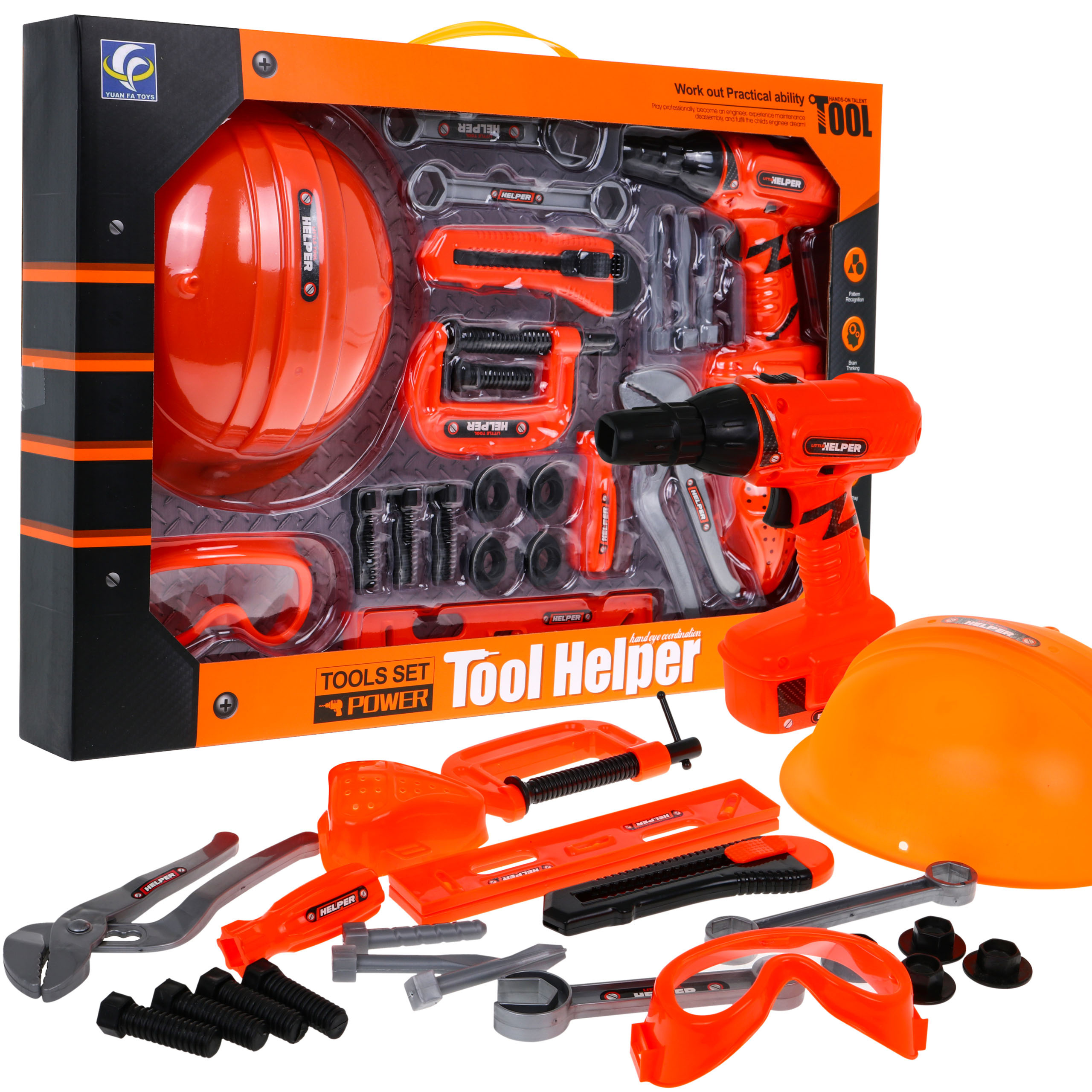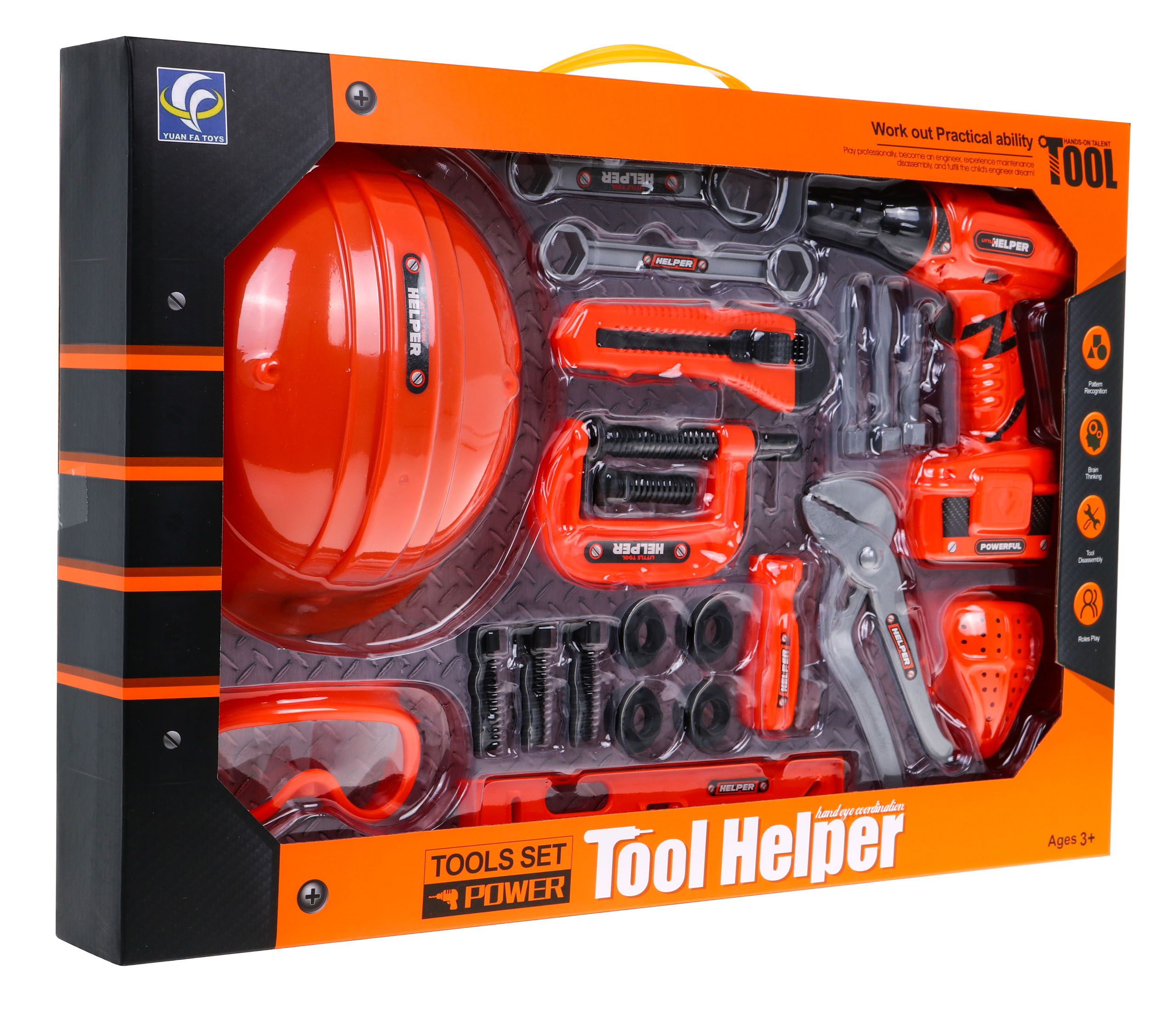 Dobře vybavená sada nářadí s akumulátorovou vrtačkou/šroubovákem, helmou a spoustou příslušenství je určena pro děti od 3 let. Šroubovák je napájen 2 bateriemi AA 1,5 V (nejsou součástí dodávky).