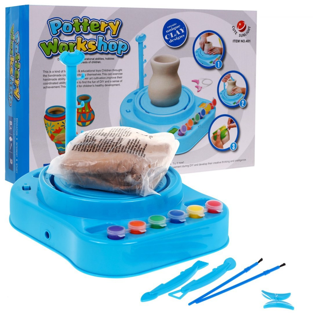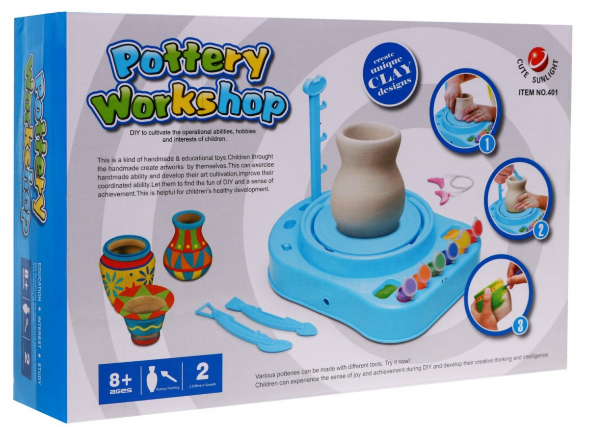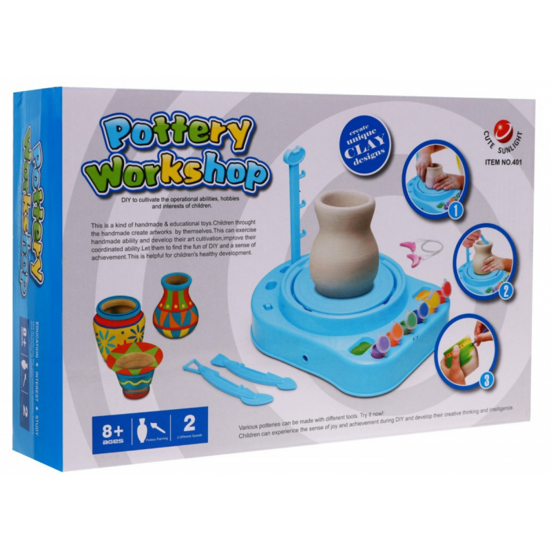 | | Sada malého hrnčíře je vzdělávací hračka pro vlastní výrobu a malování keramických nádob. Dítě si může vyrobit vlastní hrnce, hrnečky nebo džbány a poté je ozdobit barvami podle vlastních představ. Hrnčířský kruh se otáčí dvěma rychlostmi, pomaleji a rychleji. Hračka stimuluje představivost, rozvíjí zručnost, manuální a výtvarné dovednosti. Hračka je vhodná pro děti od 8 let a je certifikována CE. Hračka je napájena 3 bateriemi R14 (nejsou součástí balení). |