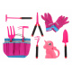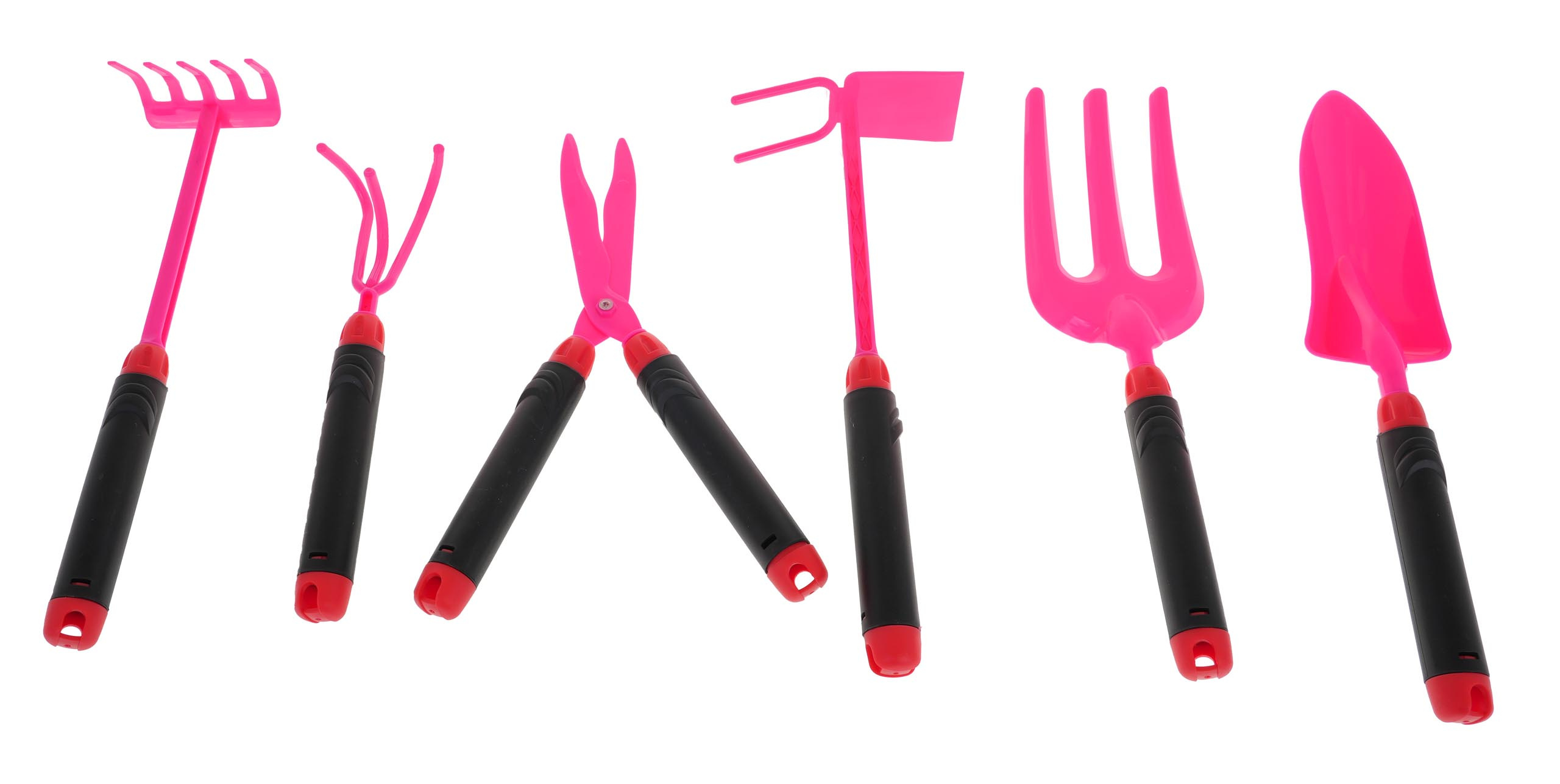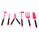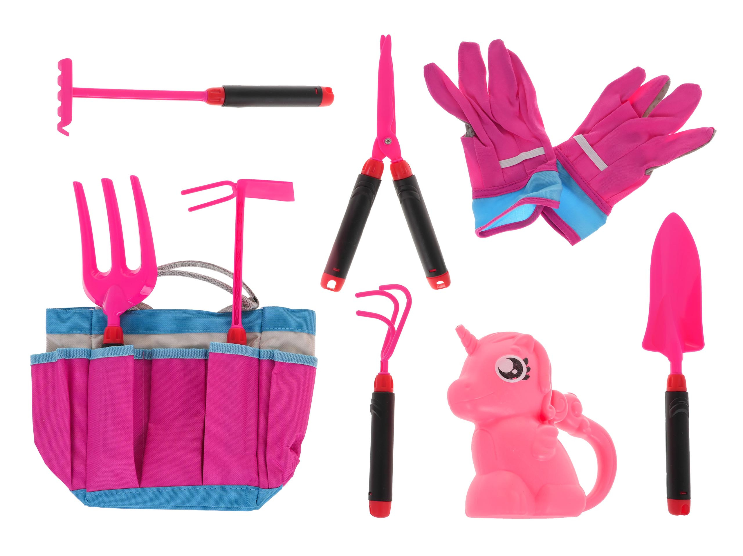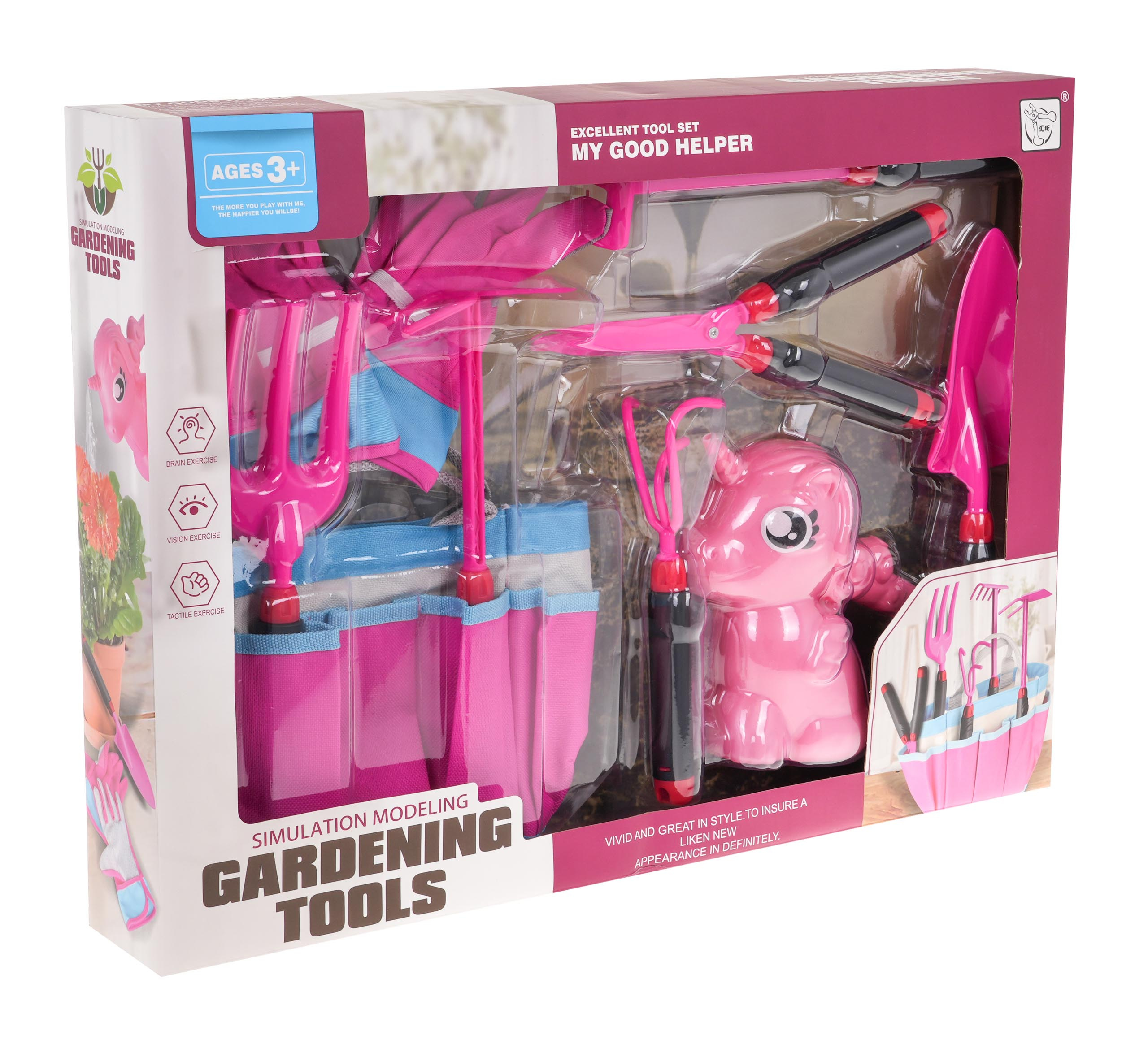 | - brašna na nářadí, - rukavice, - konev ve tvaru jednorožce, - nůžky, - vidlice - stěrka, - ruční kultivátor, - hrábě, - motyka |