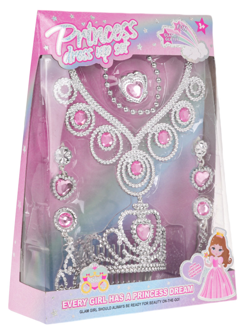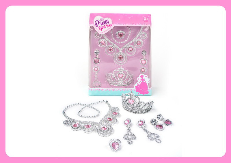 Tato sada princeznovských šperků je ideální pro malé milovnice pohádek od 3 let . Sada obsahuje šperky, jako je tiara , náhrdelník , náušnice a prsten . Vše v jemných stříbrných a růžových tónech .