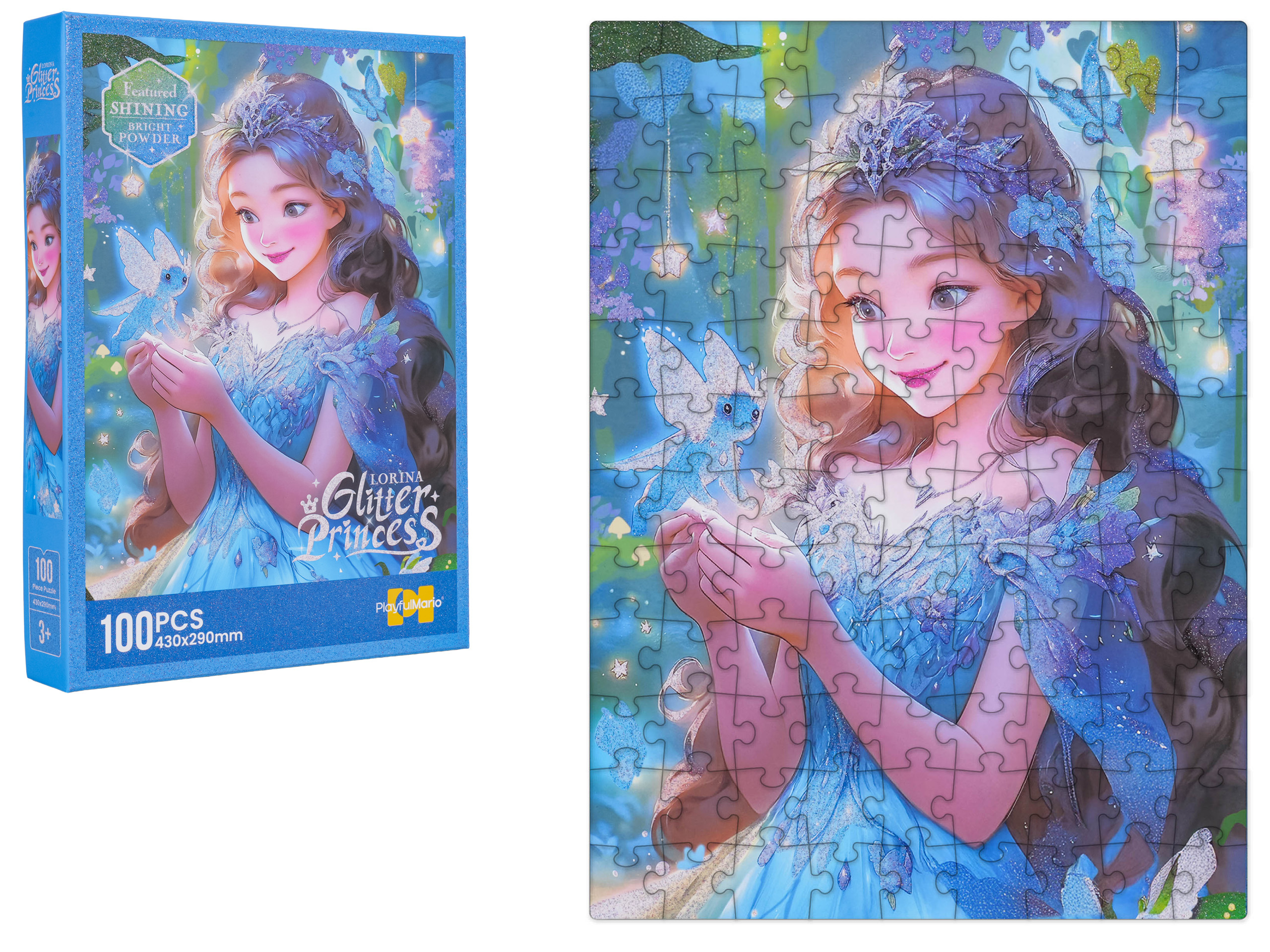 Sada puzzle 100 dílků s modrou vílou pro děti od tří let. Po složení vznikne obrázek s prvky třpytu, o rozměrech 43 cm x 29 cm. Skládání puzzle nás učí koncentraci a také zaměření na jednu věc. Umožňuje nám se odreagovat, zapomenout na problémy. Puzzle nás učí logickému myšlení, rozpoznávání tvarů a příznivě ovlivňují naši vizuální paměť.