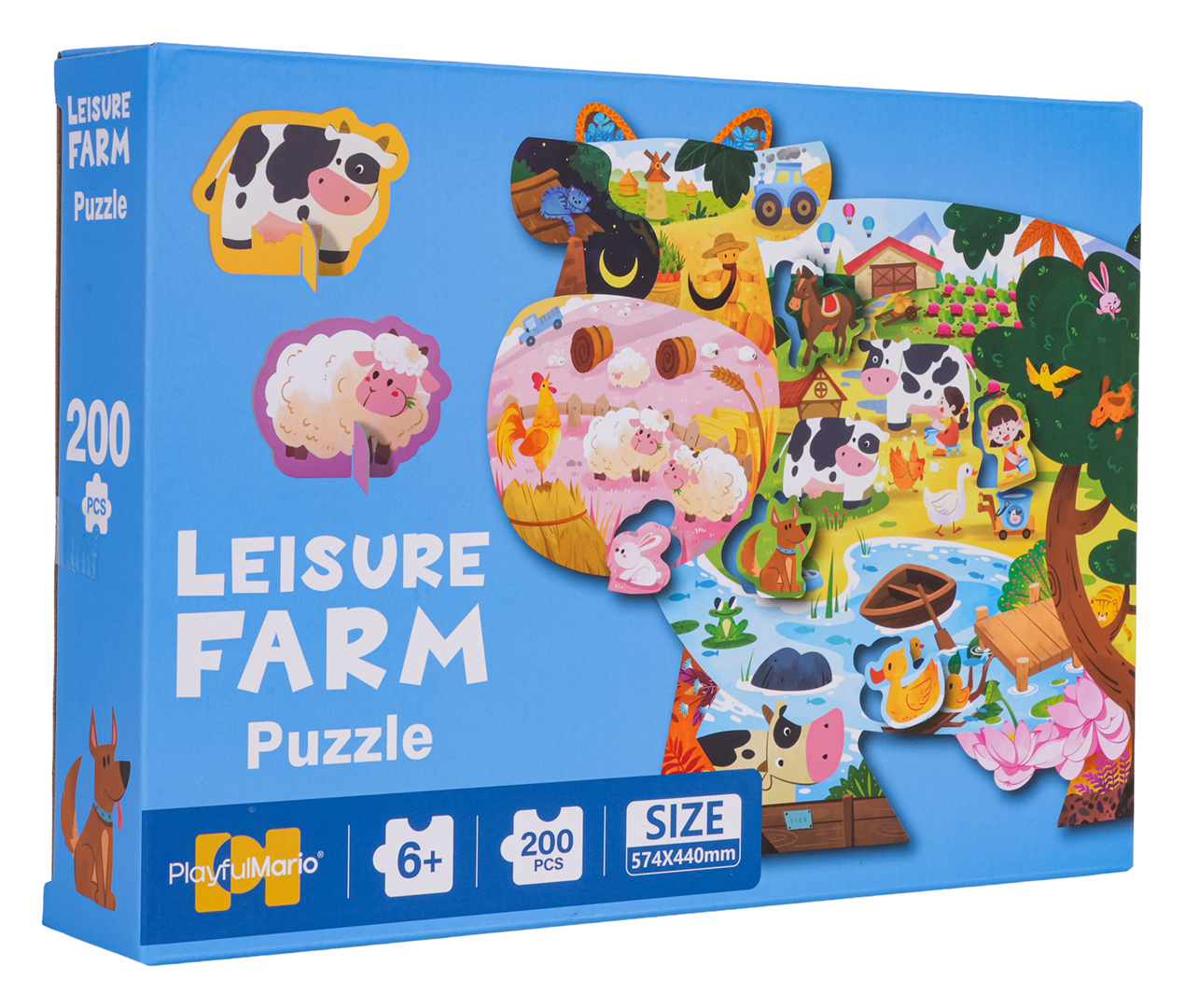 Sada puzzle 200 dílků s farmářskou tematikou pro děti od šesti let. Po složení vznikne obrázek ve tvaru kravičky s kresbami zvířátek, která se nacházejí na farmě, o rozměrech 57,4 cm x 44 cm. V sadě máme také dva prvky s opěrkami (ovečka, kravička). Skládání puzzle nás učí koncentraci a také zaměření na jednu věc. Umožňuje nám se odreagovat, zapomenout na problémy. Puzzle nás učí logickému myšlení, rozpoznávání tvarů a příznivě ovlivňují naši vizuální paměť.
