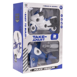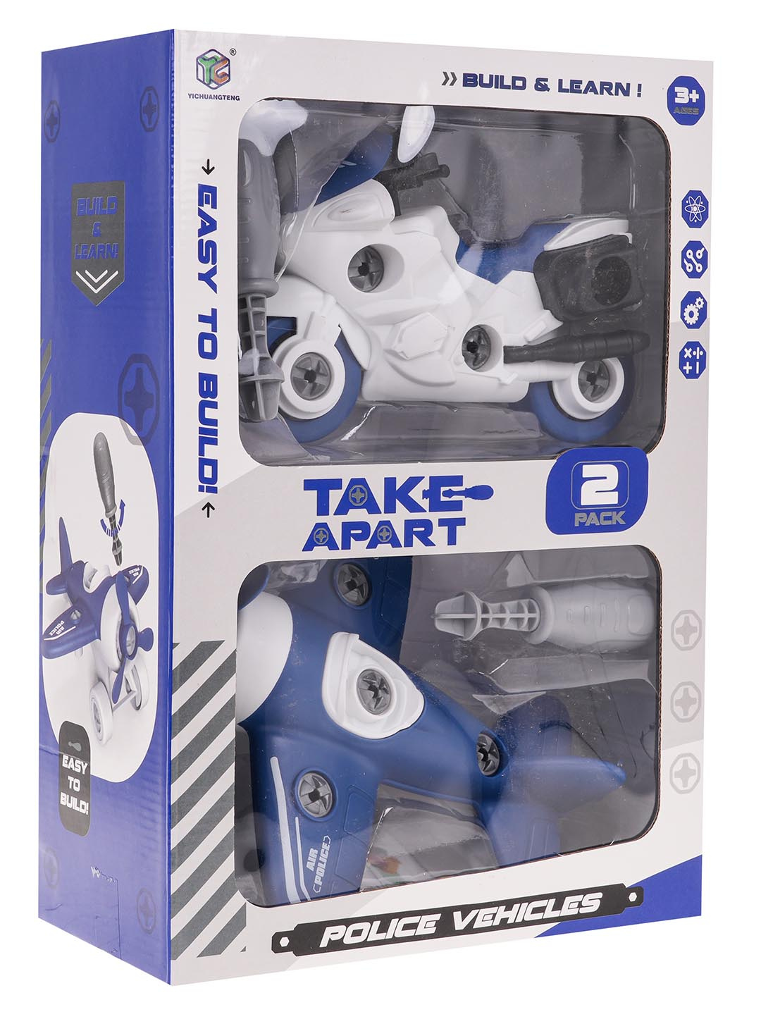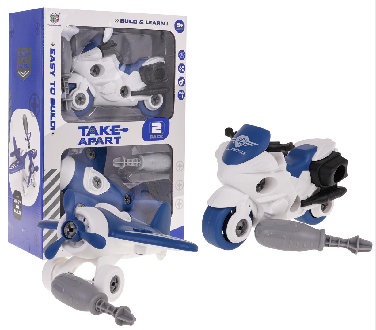 Sada rozebíratelných vozidel pro děti od 3 let. V sadě se nachází motocykl, letadlo a dva šroubováky. Vozidla malý může rozložit na prvočinitele a následně je samostatně složit. Z těchto dvou vozidel je možné sestavit loď. V sadě se nachází obrázkový návod k montáži.
