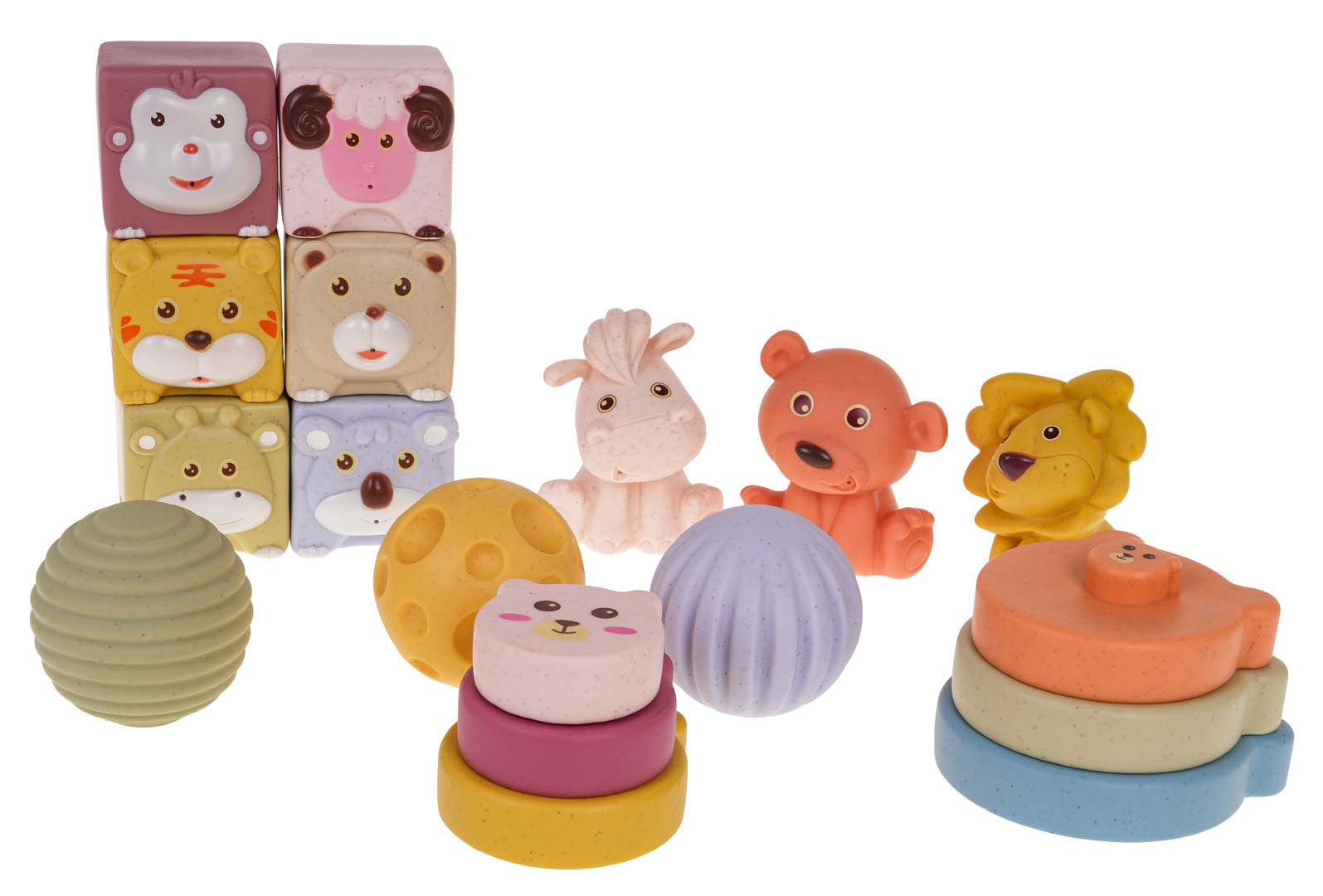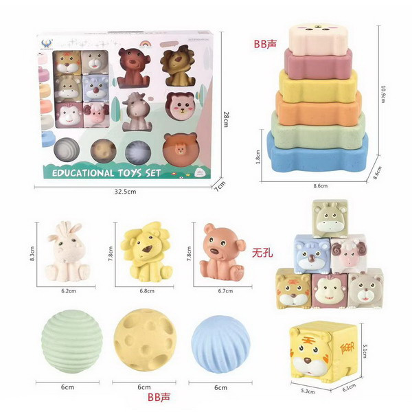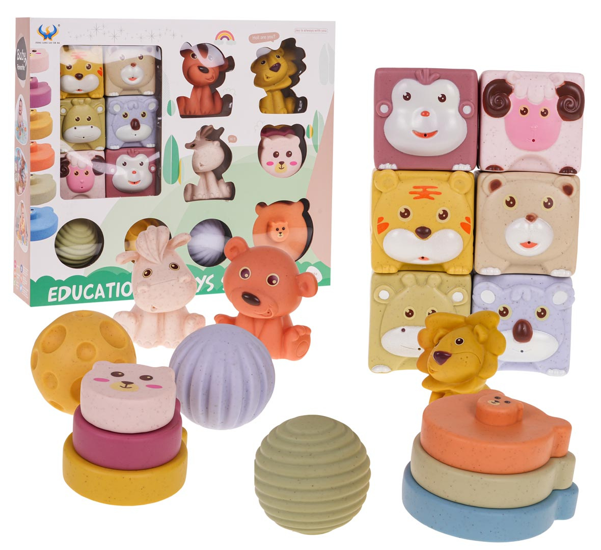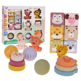 Hračky v sadě byly pečlivě navrženy tak, aby podporovaly senzorický a motorický vývoj malých dětí. Celkem šest měkkých kostek s obrázky zvířat pomáhá dětem naučit se je rozpoznávat a pojmenovávat, zatímco tři míčky s různými texturami poskytují hmatovou stimulaci.