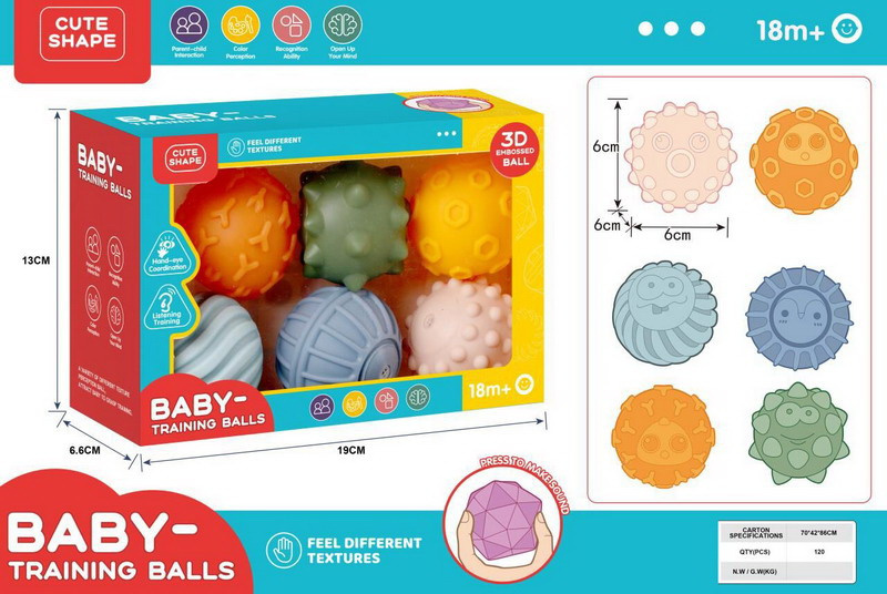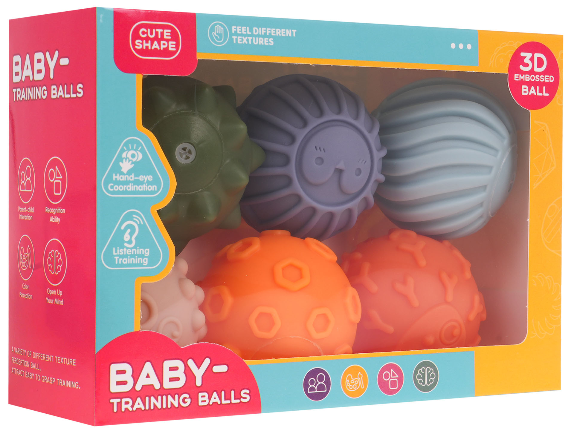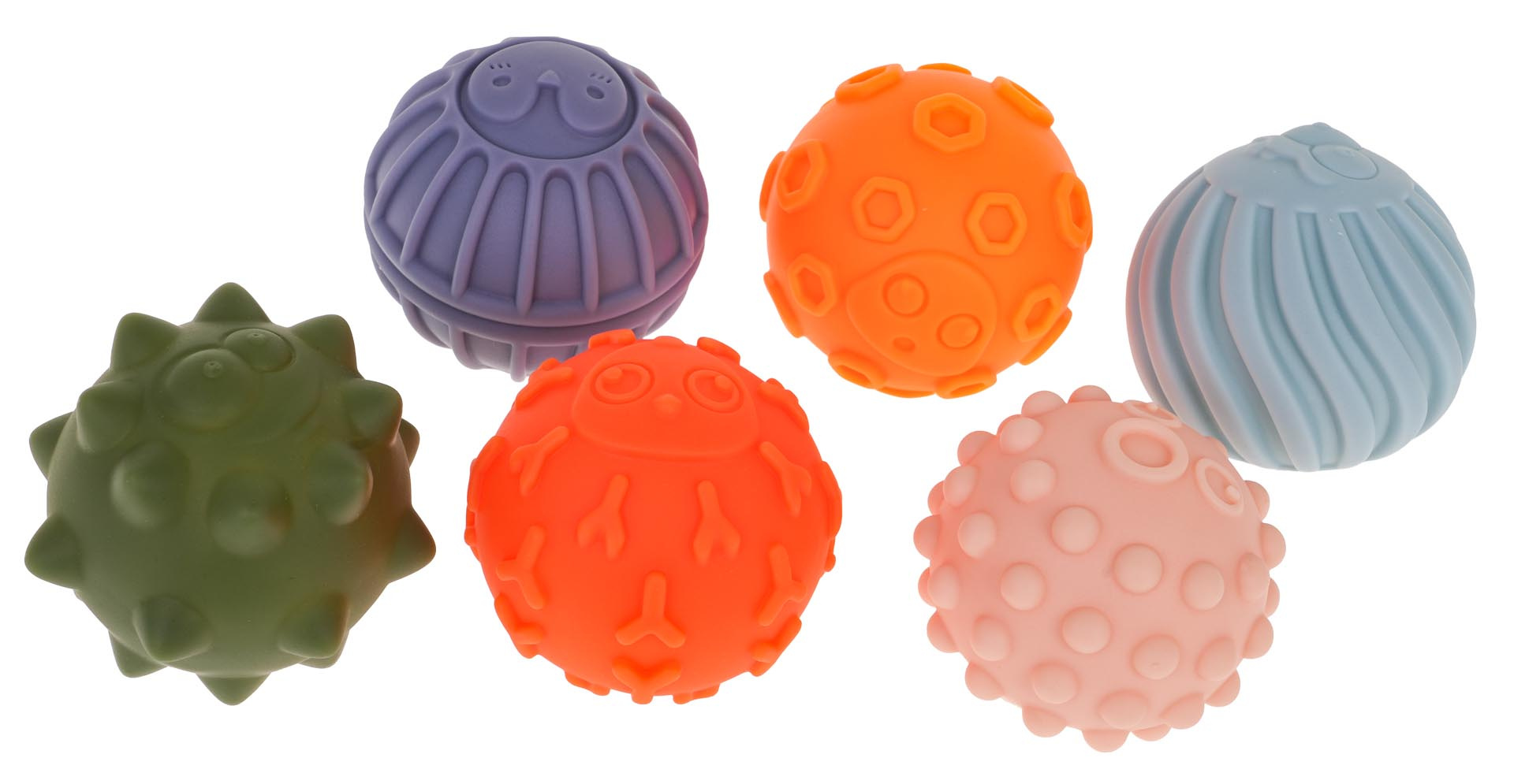 Sada 6 barevných senzorických míčků pro miminko od 18 měsíců. Různorodé barvy stimulují smysly dítěte a různé tvary povzbuzují ke kreativní hře. Díky různorodé struktuře každá kulička poskytuje dítěti jiné hmatové vjemy. Míčky mohou být používány k terapeutickým, vzdělávacím účelům nebo jako smyslové hračky pro děti. Při stisknutí míčku se z něj ozve zvuk.