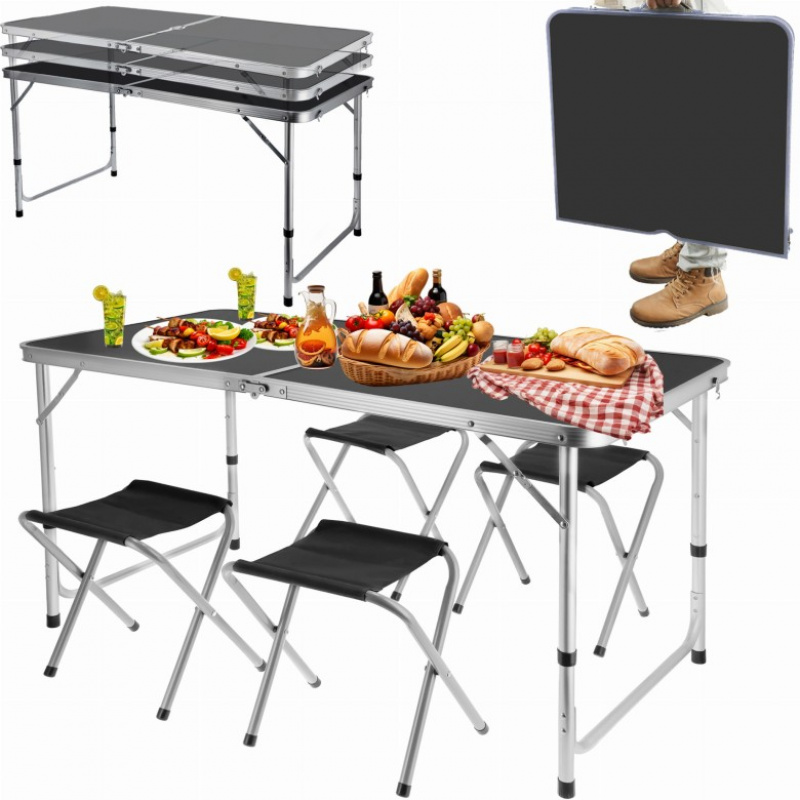 Nespornou výhodou je možnost složení židlí a stolu do kufru a jejich malé rozměry, což umožňuje bezproblémovou přepravu a skladování mimo sezónu Sada obsahuje stůl o rozměrech 120x60 cm a 4 židle o rozměrech 27x32x35 cm Nastavitelné nohy umožňují nastavit výšku stolu na 54, 62 nebo 70 cm