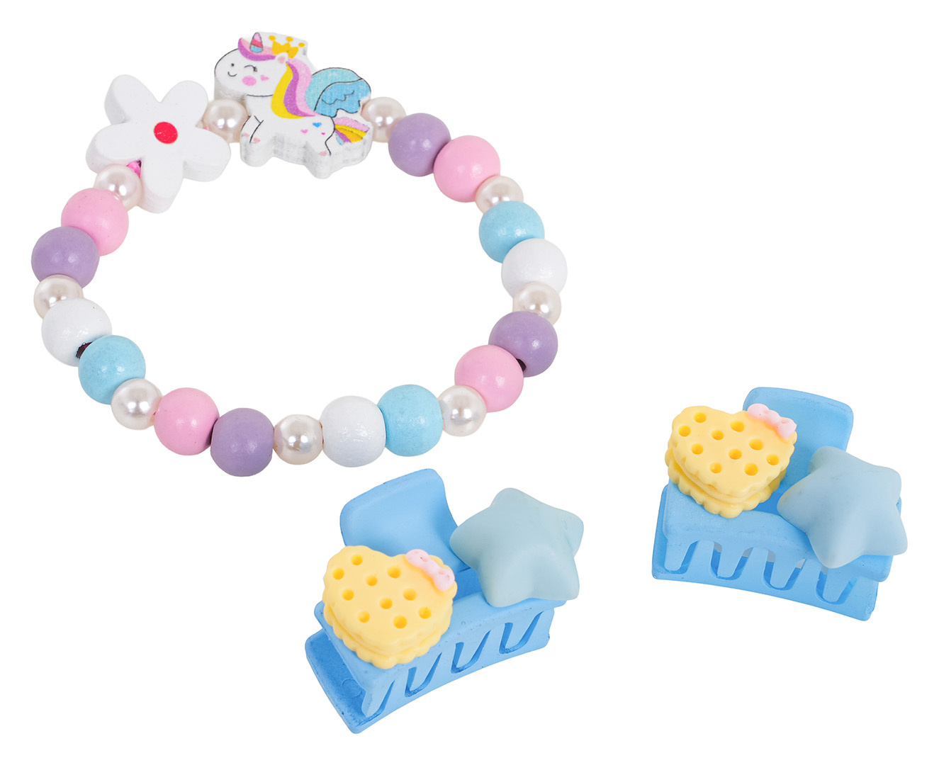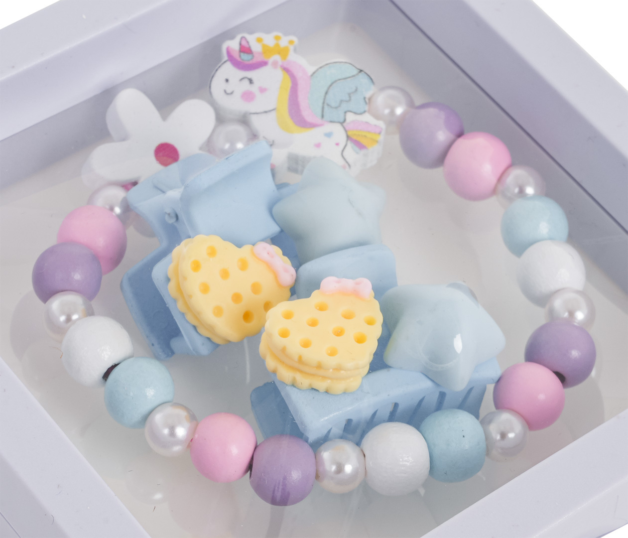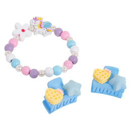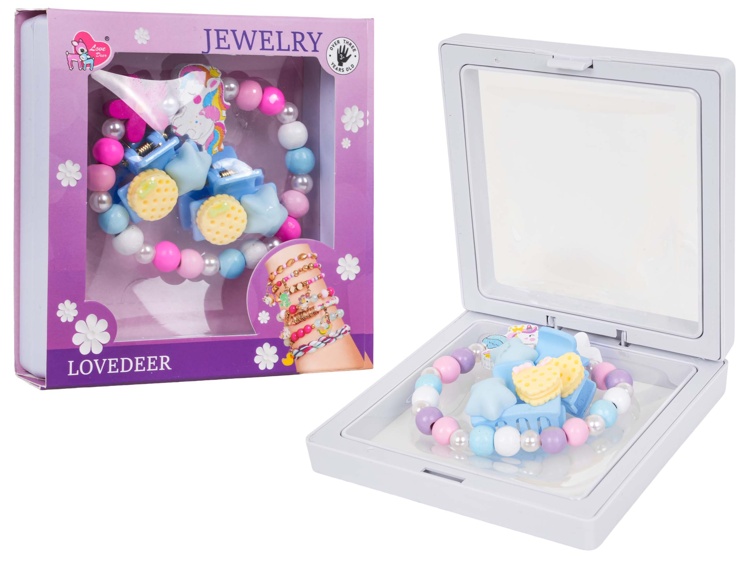 Sada šperků s jednorožcem pro děti od tří let. Sada se skládá z krásného náramku vyrobeného z různobarevných dřevěných korálků, perliček a prvku s jednorožcem, a také ze dvou sponek. Sada byla vyrobena s důrazem na detaily v živých barvách.