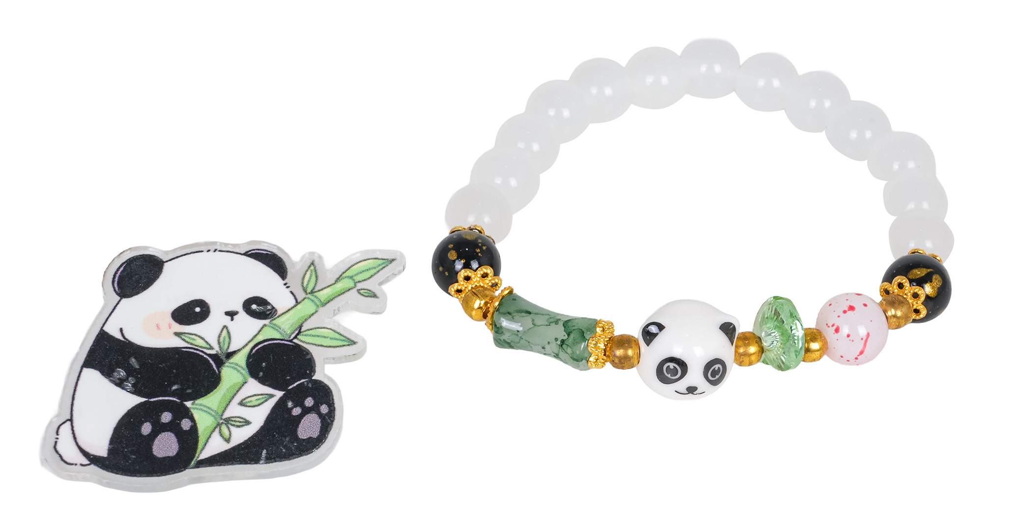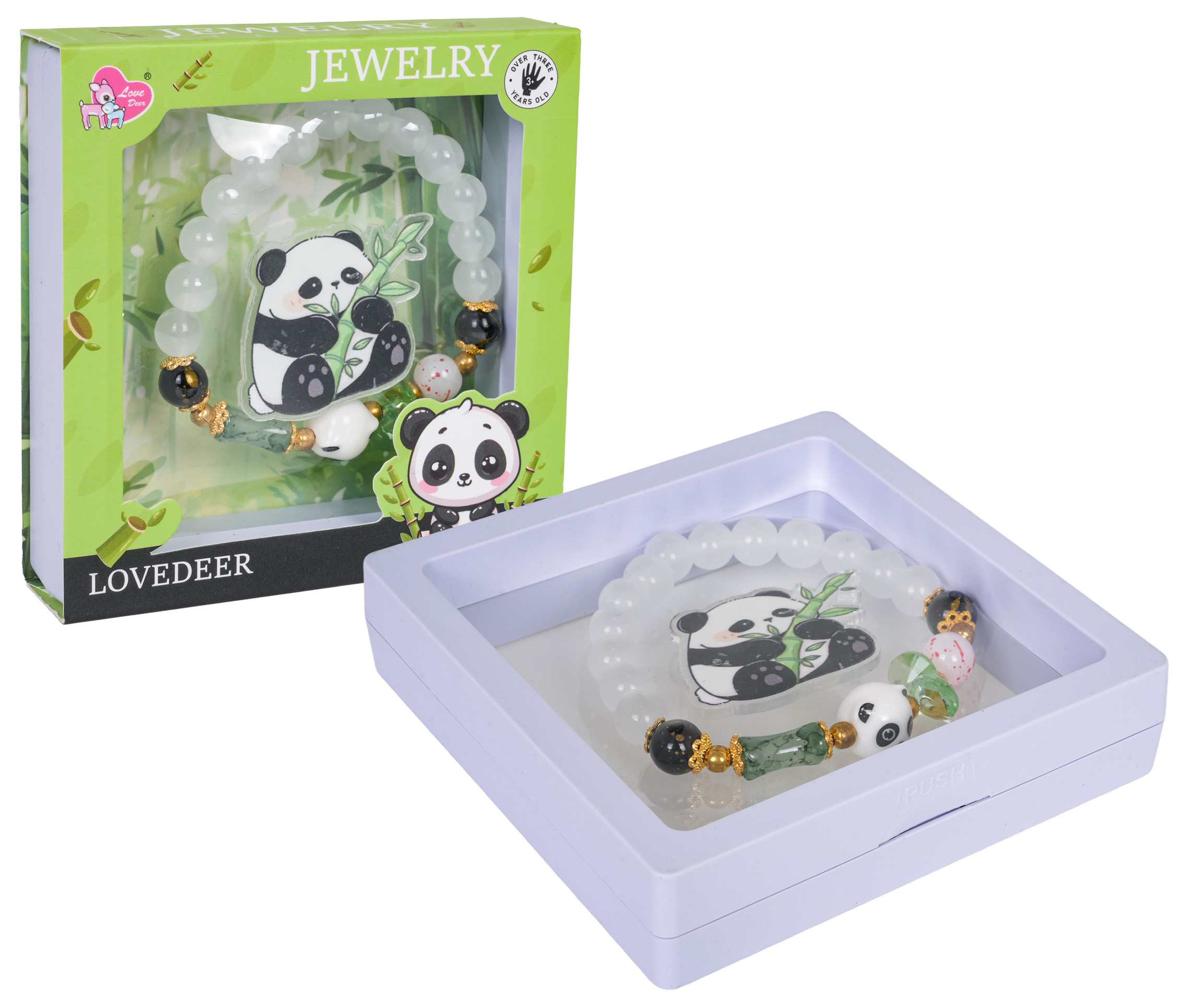 Sada šperků s pandou pro děti od tří let. Sada se skládá z krásného náramku vyrobeného z různobarevných korálků a prvku s hlavou pandy, a také sponky s pandou. Sada byla vyrobena s důrazem na detaily v živých barvách.
