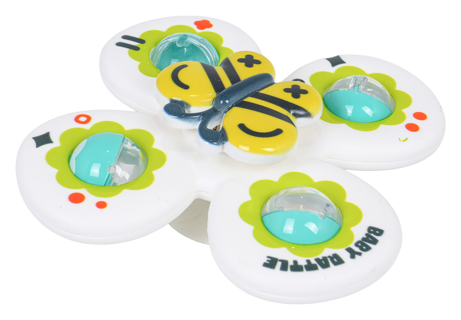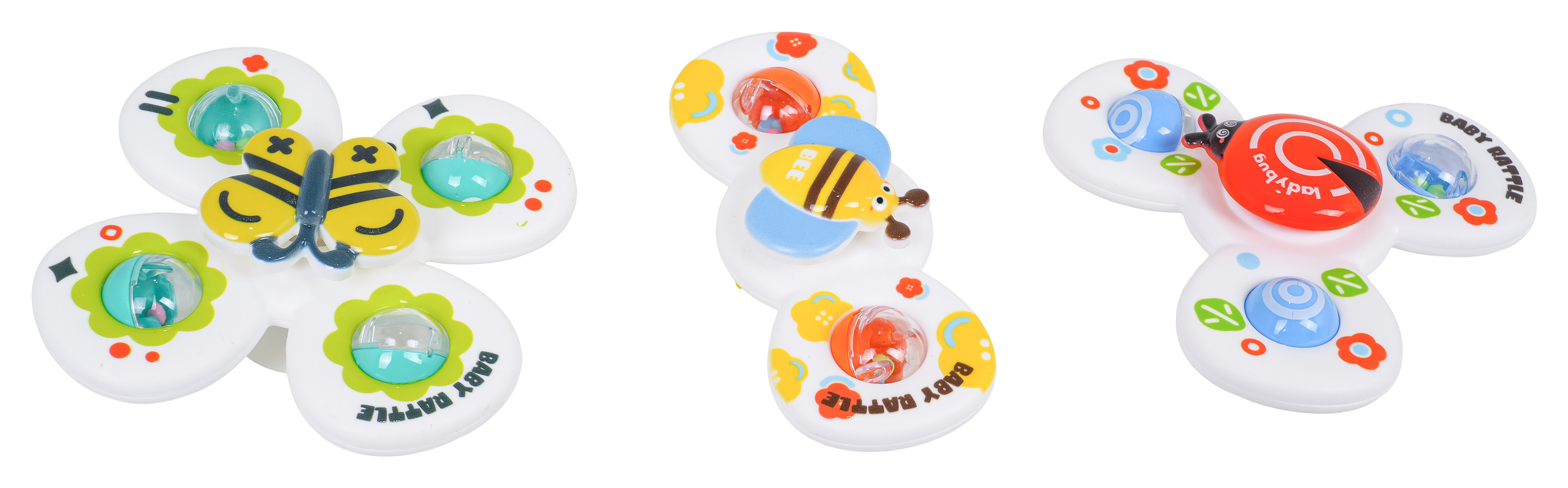 Sada 3 spinnerů s přísavkou pro děti od prvních dnů života. Spinnery při otáčení vydávají jemné zvuky. Díky přísavkám je lze připevnit na různé povrchy, jako jsou stolky, vany nebo okna v autě.