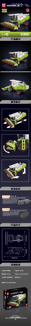 Vysoce kvalitní stavební kostky Mould King pro děti od čtrnácti let. Sada se skládá z 1347 prvků, ze kterých lze postavit dálkově ovládaný kombajn. Ovládat ho lze pomocí dálkového ovladače přiloženého k sadě nebo pomocí aplikace v telefonu. Aplikaci lze stáhnout naskenováním QR kódu umístěného na obalu. Díky aplikaci lze nejen pohybovat vozidlem, ale také navrhnout jeho pohyby. Vozidlo je napájeno akumulátorem typu 3,7V (v balení), ovladač bateriemi typu 2 x AAA 1,5V (nejsou součástí balení).
