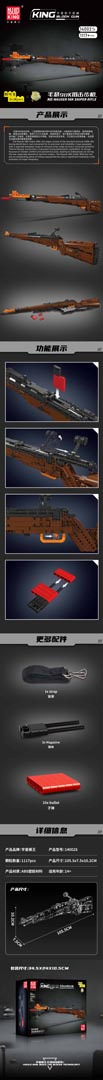 Vysoce kvalitní stavební kostky pro děti od čtrnácti let. Sada se skládá z 1117 prvků, ze kterých lze postavit pušku Mauser 98K. Karabina nejen vypadá jako skutečná, ale také střílí. V sadě se nachází 10 nábojů a dva zásobníky. Můžeme nabíjet buď celý zásobník, nebo jednotlivé náboje. Ke karabině byl připojen popruh.