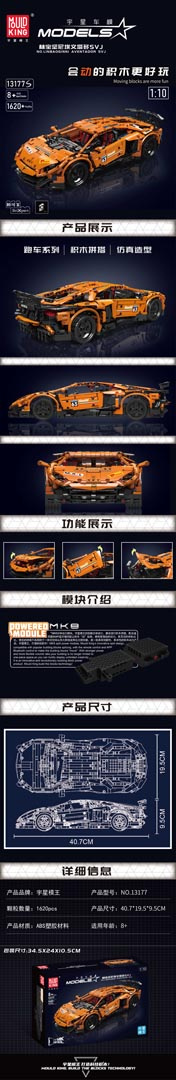 Vysoce kvalitní stavební kostky Mould King pro děti od osmi let. Sada se skládá z 1620 prvků, ze kterých lze postavit oranžové dálkově ovládané auto. Auto jezdí ve všech směrech dopředu, dozadu, doprava a doleva. Ovládat je lze pomocí dálkového ovladače přiloženého k sadě nebo pomocí aplikace v telefonu. Aplikaci lze stáhnout naskenováním QR kódu umístěného na obalu. Díky aplikaci lze nejen pohybovat vozidlem, ale také navrhnout jeho pohyby. Hračka je napájena akumulátorem typu 3,7V (v balení), ovladač bateriemi typu 2 x AA 1,5 V (nejsou v balení).