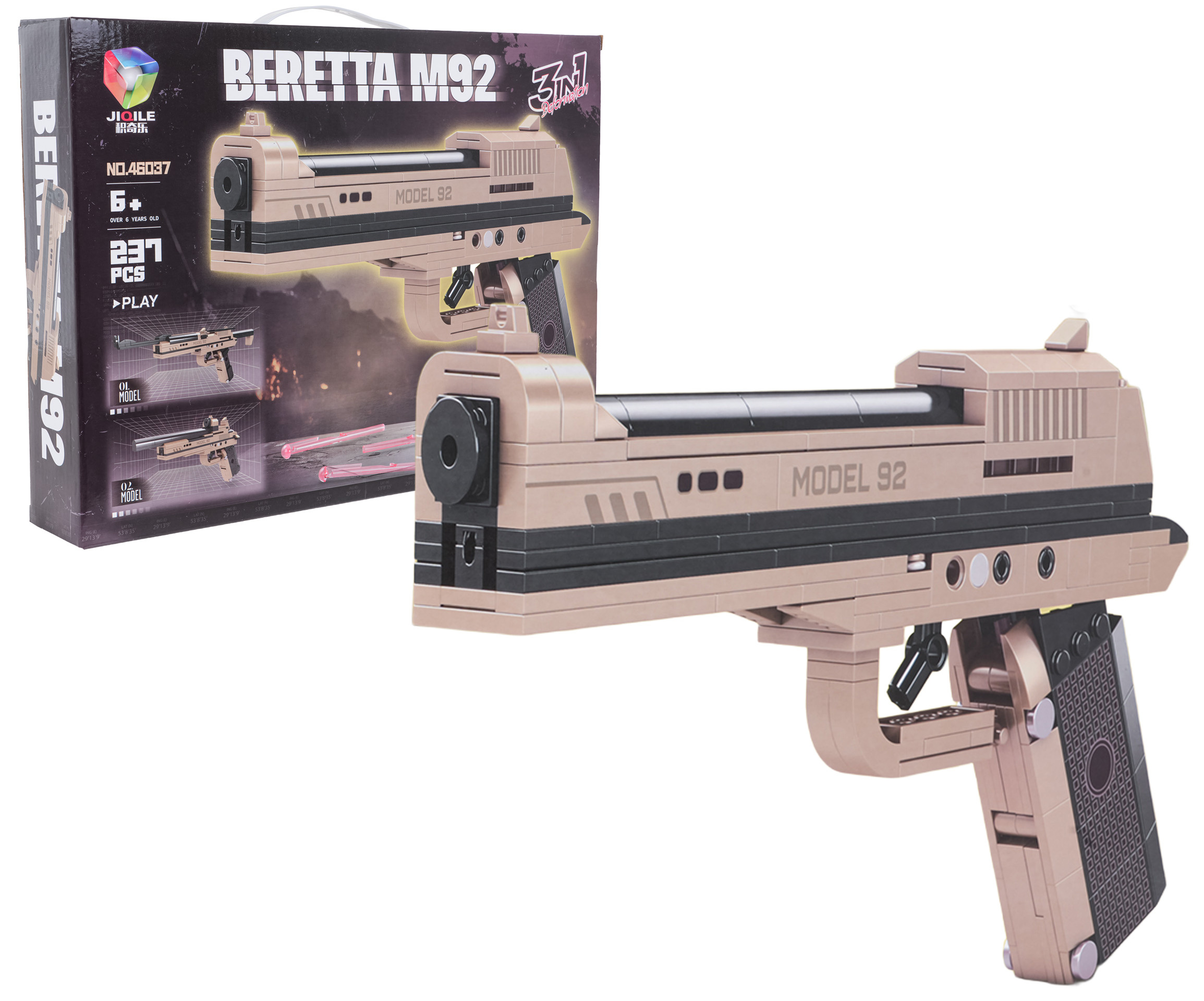 Vysoce kvalitní stavební kostky pro děti od šesti let. Sada se skládá z 237 prvků, ze kterých lze postavit 3 verze pistole. V sadě se nacházejí také náboje k vystřelování.
