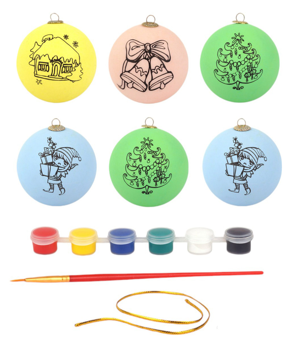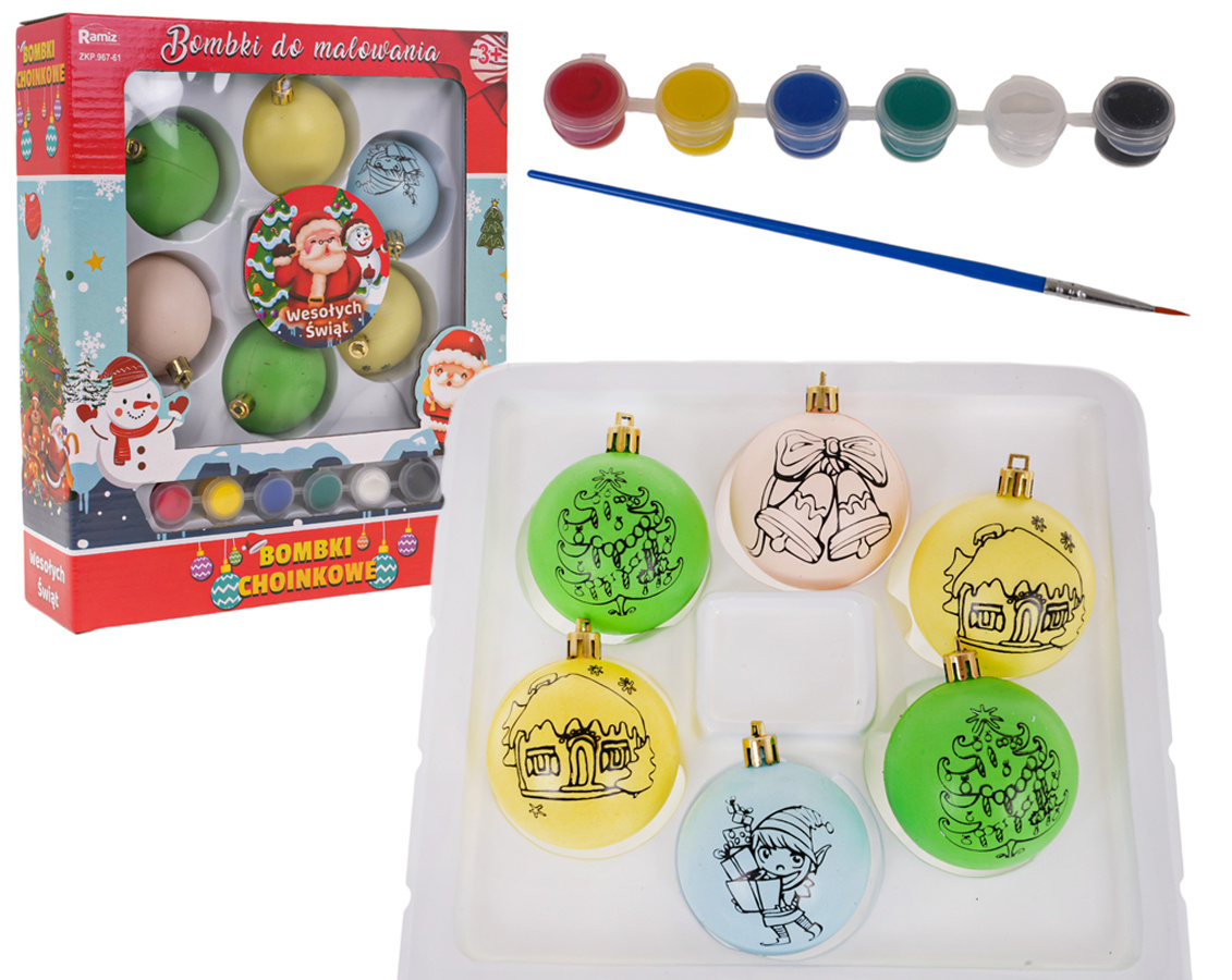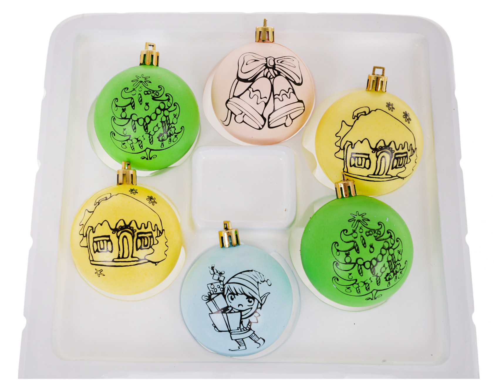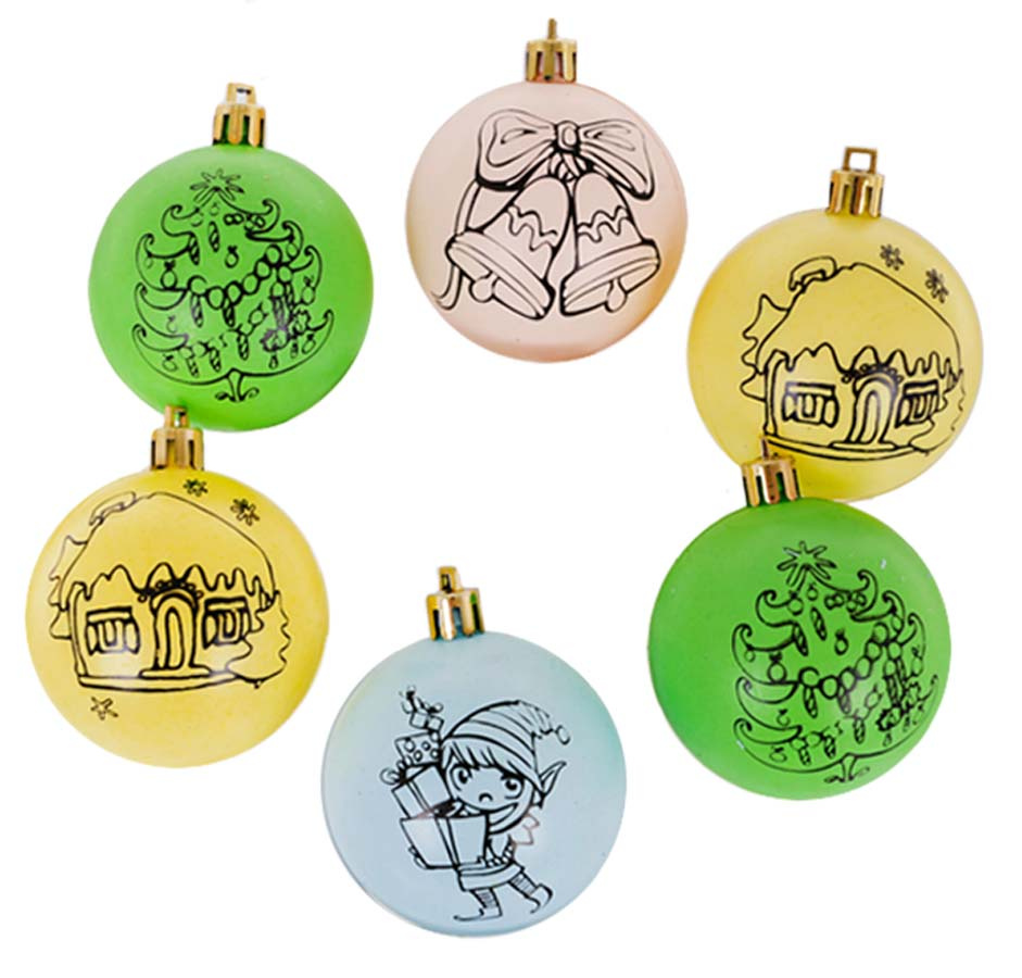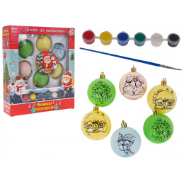 Sada 6 ozdob na malování s barvami pro děti od 3 let. Každá z ozdob je pokryta vrstvou, na které je umístěn vánoční obrázek. Kresby je třeba vyplnit barvami podle vlastního uvážení.