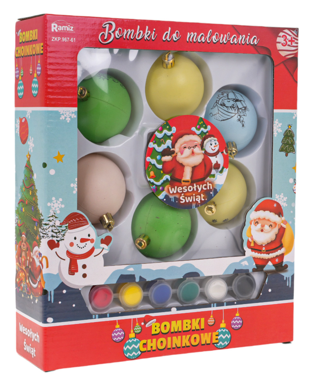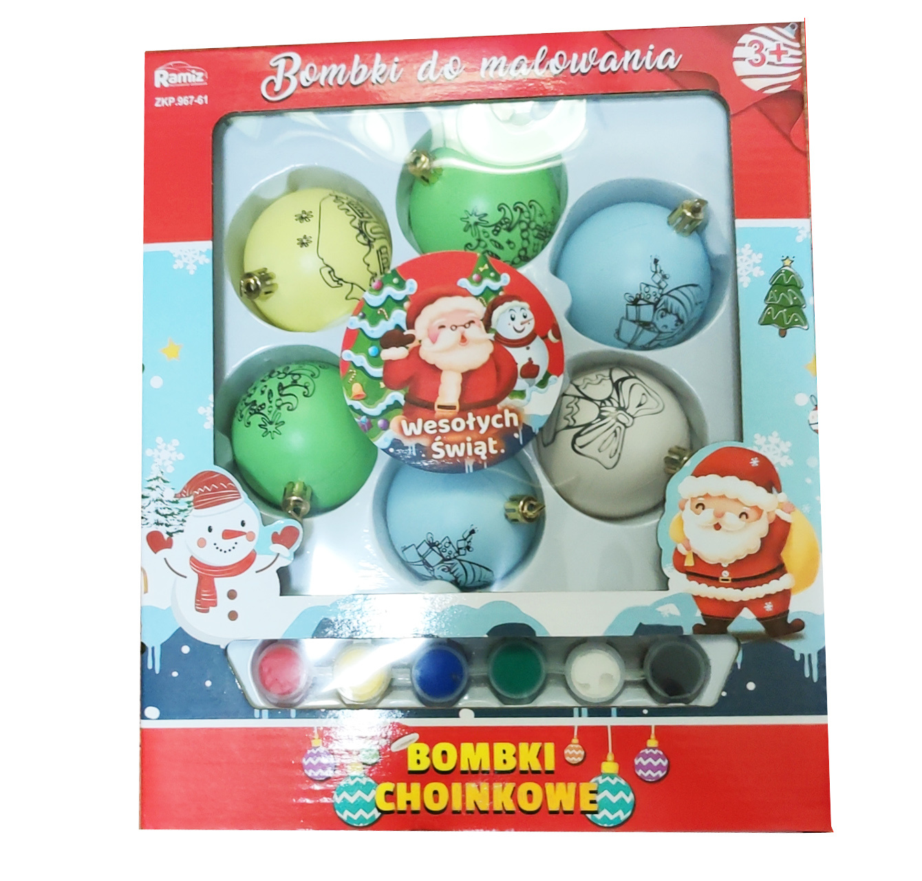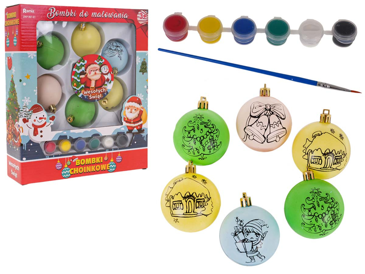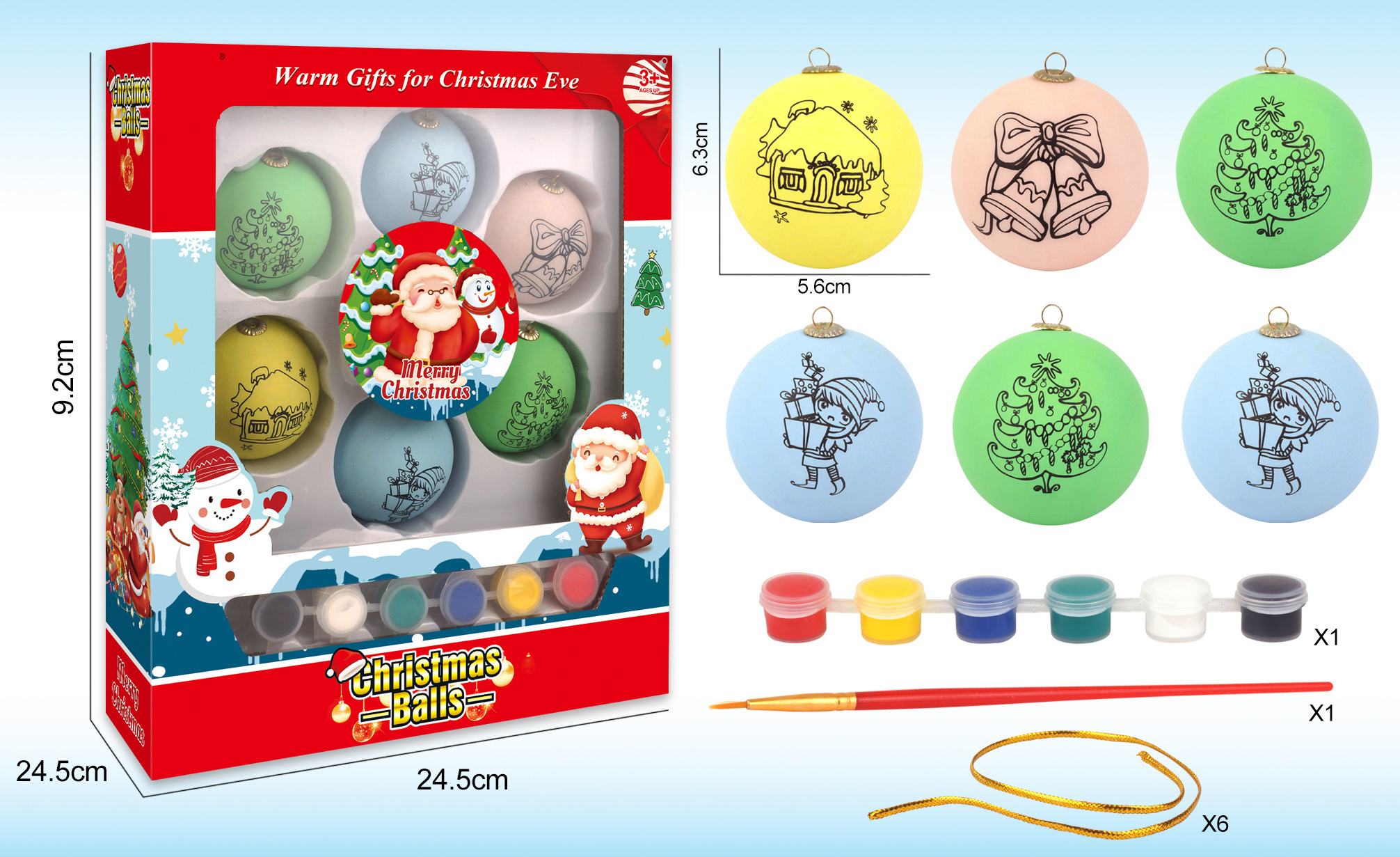 Sada 6 ozdob na malování s barvami pro děti od 3 let. Každá z ozdob je pokryta vrstvou, na které je umístěn vánoční obrázek. Kresby je třeba vyplnit barvami podle vlastního uvážení.