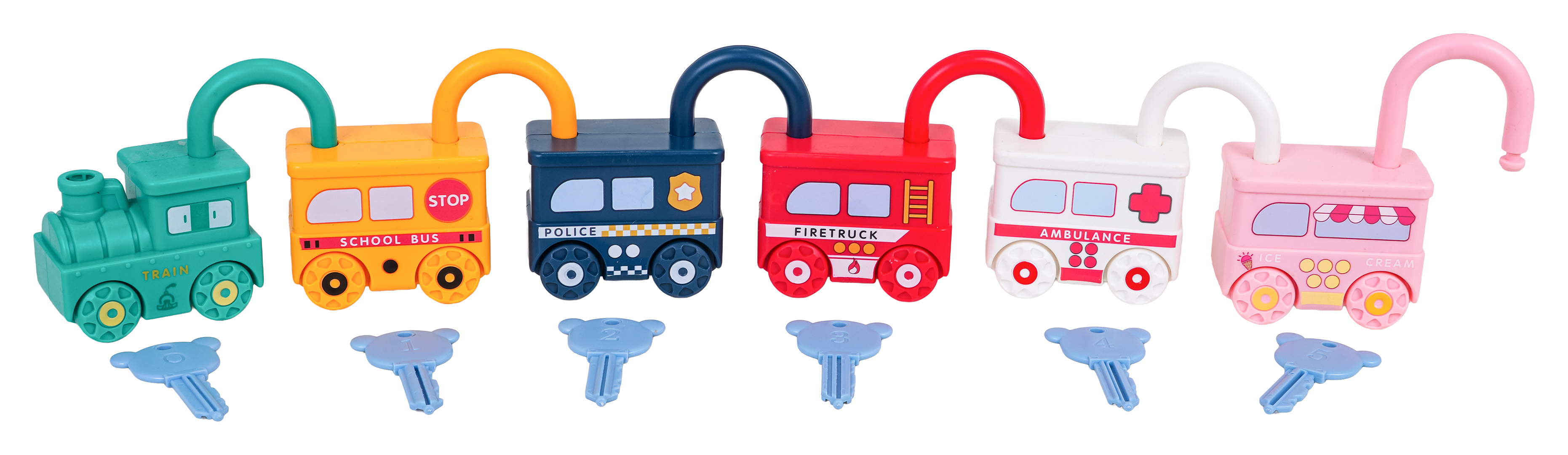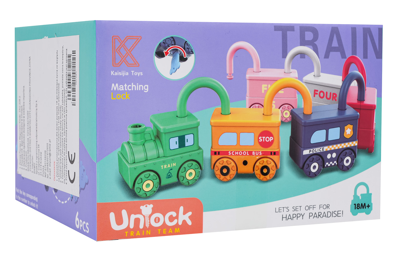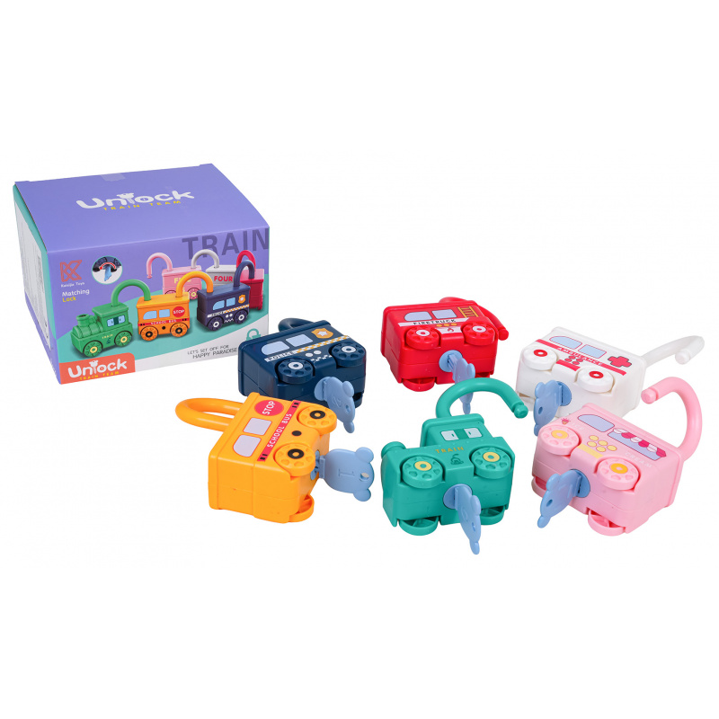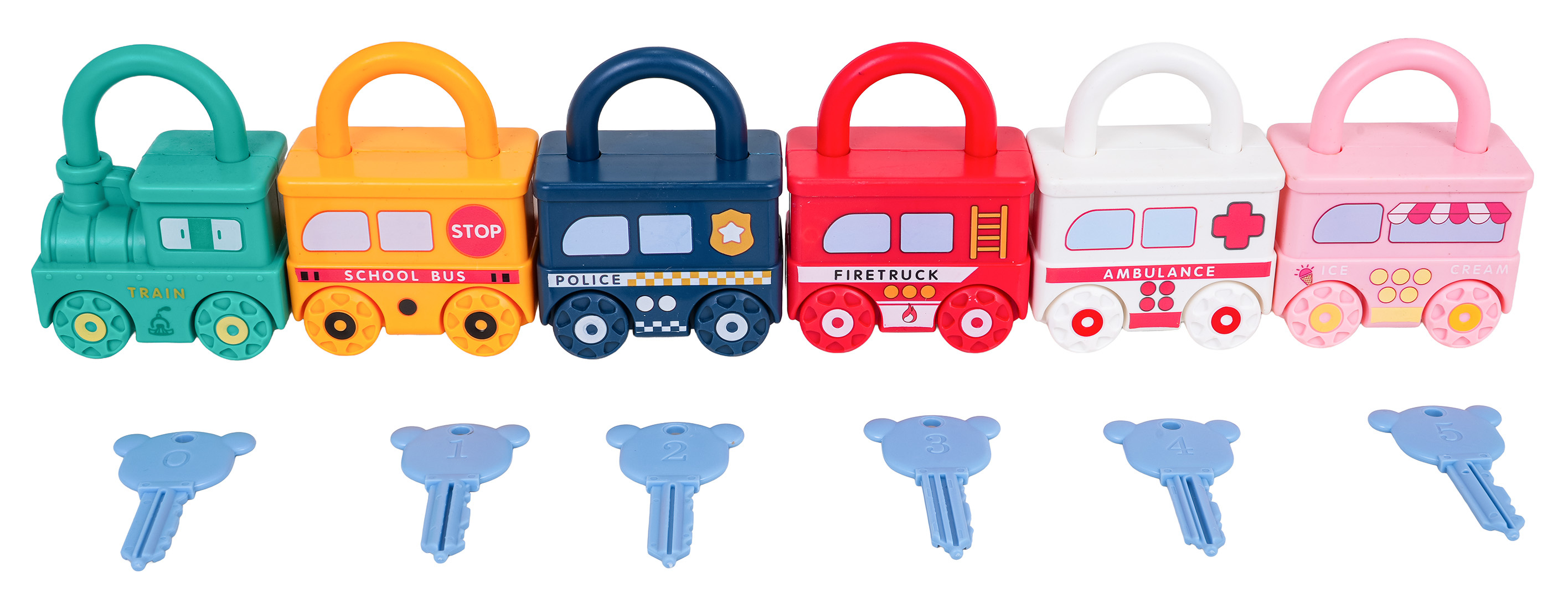 Vzdělávací, barevný vláček s vagónky ve formě barevných zámků pro děti od osmnácti měsíců. Hračka byla vyrobena z nejkvalitnějších materiálů, které jsou bezpečné pro malé děti. Tato sada spojuje zábavu a vzdělávání. Sada se skládá z 6 různých vozidel: lokomotivy, školního autobusu, policejního autíčka, hasičského vozu, sanitky, dodávky se zmrzlinou. Lokomotiva a autíčka jsou označena čísly od 0 do 5 a anglickými názvy vozidel (Train, School Bus, Police, Firetruck, Ambulance, Ice Cream). Díky tomu se dítě seznamuje s čísly a slovy v anglickém jazyce. Každé autíčko má zespodu dírku na klíček, v sadě je 7 klíčů. Jeden klíč je univerzální, otevírá všechny zámky, ostatní jsou přiřazeny ke konkrétnímu vozidlu. Klíčky jsou označeny čísly, podobně jako vozidla, což pomáhá dětem rozvíjet logické myšlení a učí je asociacím. Horní část visacího zámku lze po otevření otáčet o 360 stupňů. Díky tomu lze autíčka spojovat a vytvářet barevný vláček.