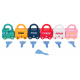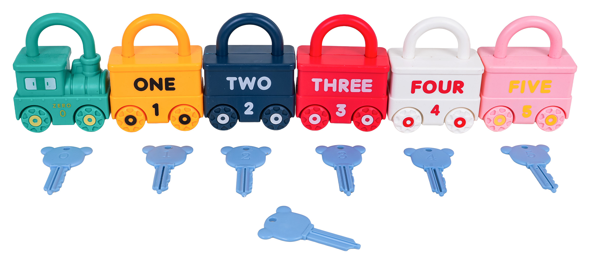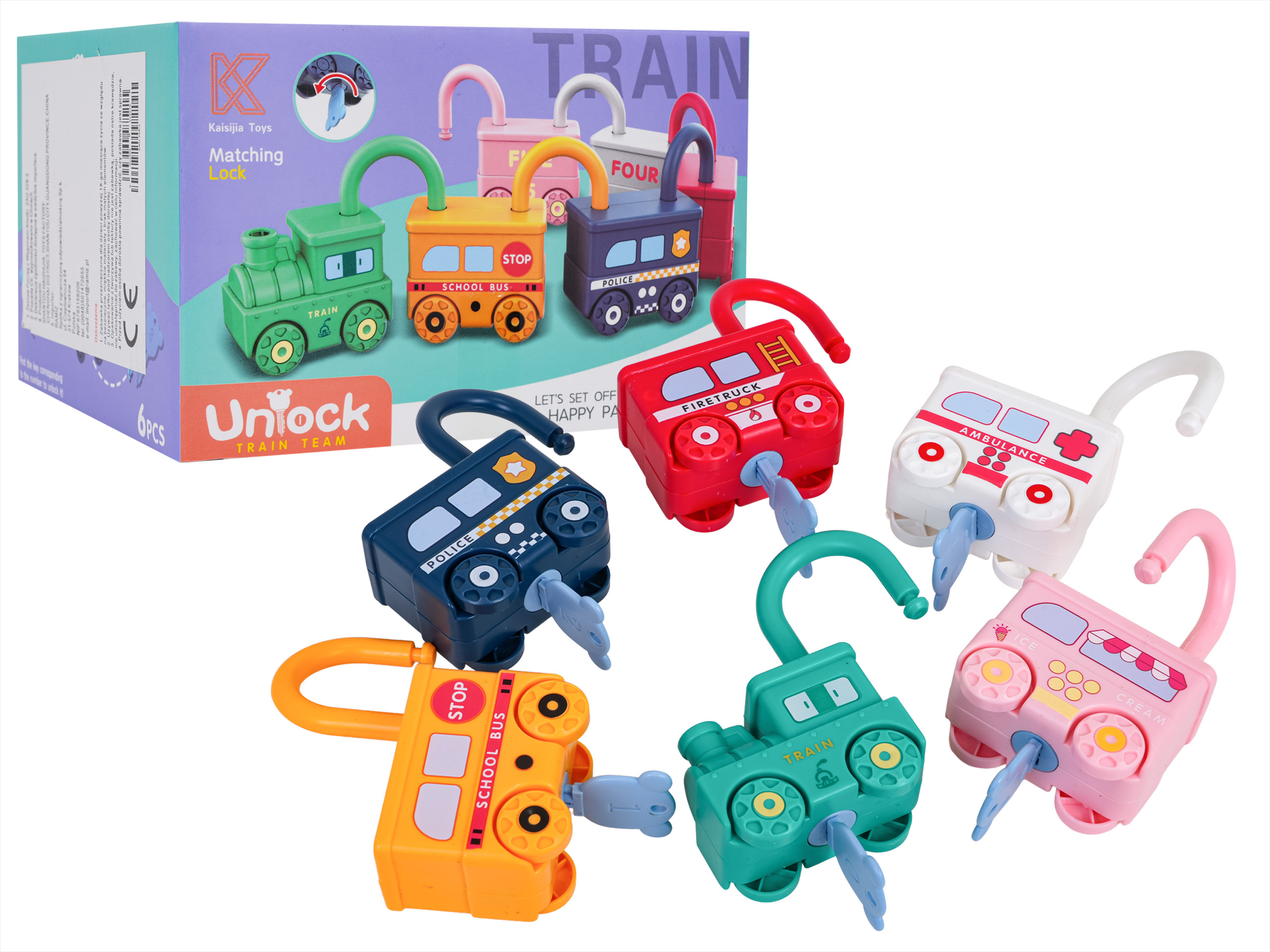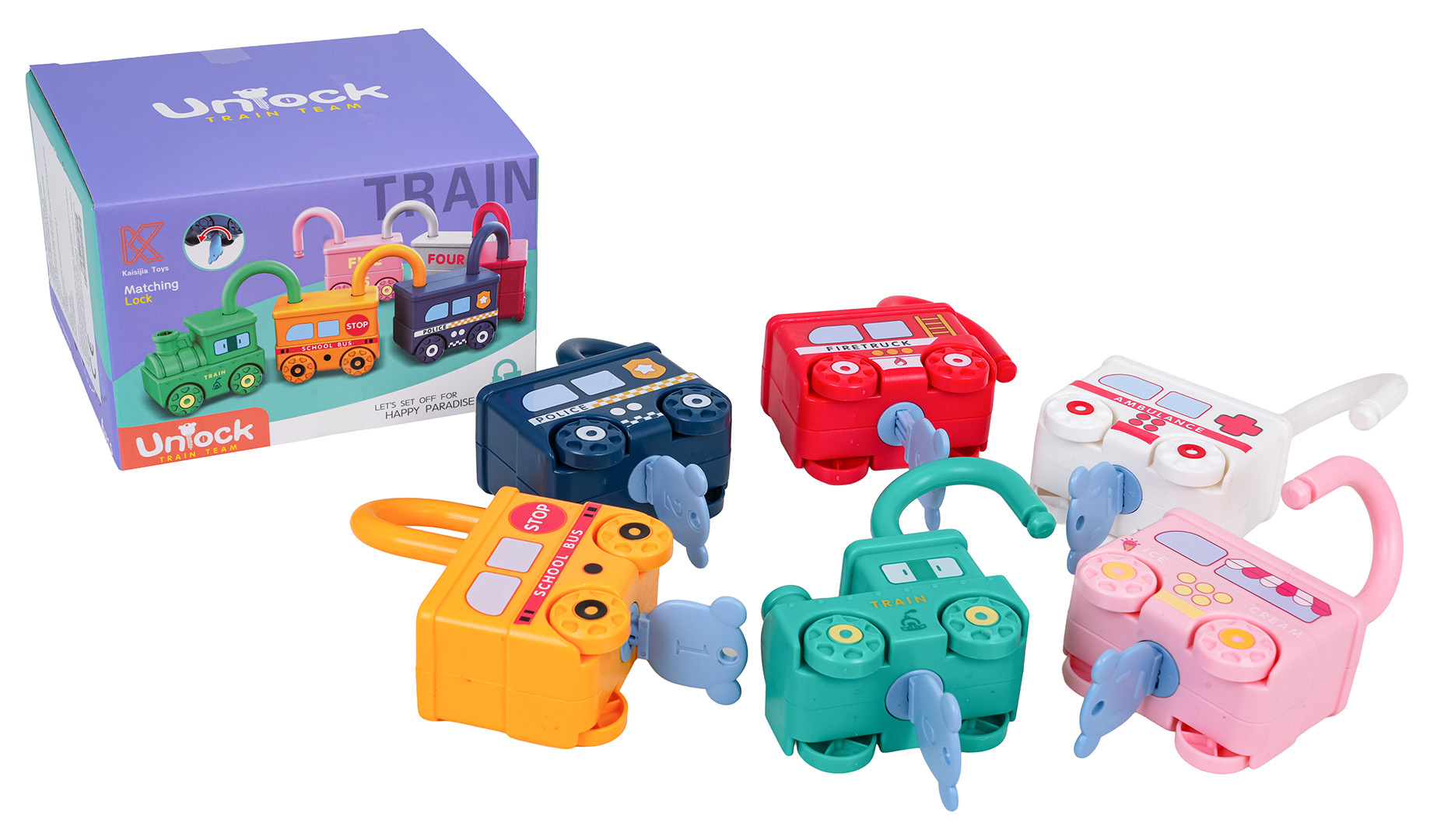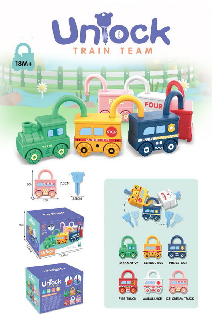 Vzdělávací, barevný vláček s vagónky ve formě barevných zámků pro děti od osmnácti měsíců. Hračka byla vyrobena z nejkvalitnějších materiálů, které jsou bezpečné pro malé děti. Tato sada spojuje zábavu a vzdělávání. Sada se skládá z 6 různých vozidel: lokomotivy, školního autobusu, policejního autíčka, hasičského vozu, sanitky, dodávky se zmrzlinou. Lokomotiva a autíčka jsou označena čísly od 0 do 5 a anglickými názvy vozidel (Train, School Bus, Police, Firetruck, Ambulance, Ice Cream). Díky tomu se dítě seznamuje s čísly a slovy v anglickém jazyce. Každé autíčko má zespodu dírku na klíček, v sadě je 7 klíčů. Jeden klíč je univerzální, otevírá všechny zámky, ostatní jsou přiřazeny ke konkrétnímu vozidlu. Klíčky jsou označeny čísly, podobně jako vozidla, což pomáhá dětem rozvíjet logické myšlení a učí je asociacím. Horní část visacího zámku lze po otevření otáčet o 360 stupňů. Díky tomu lze autíčka spojovat a vytvářet barevný vláček.