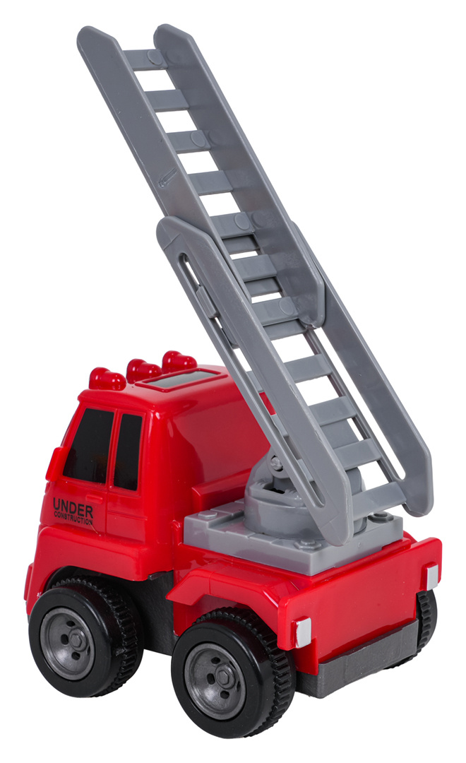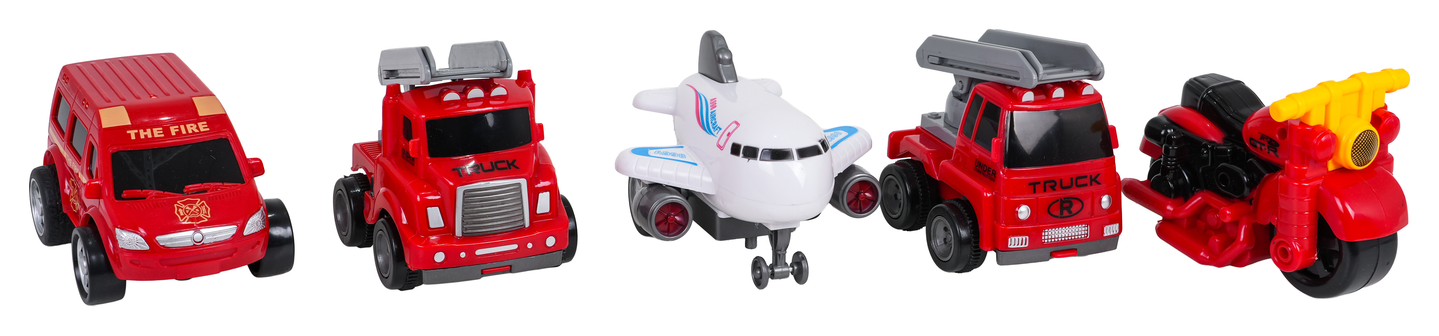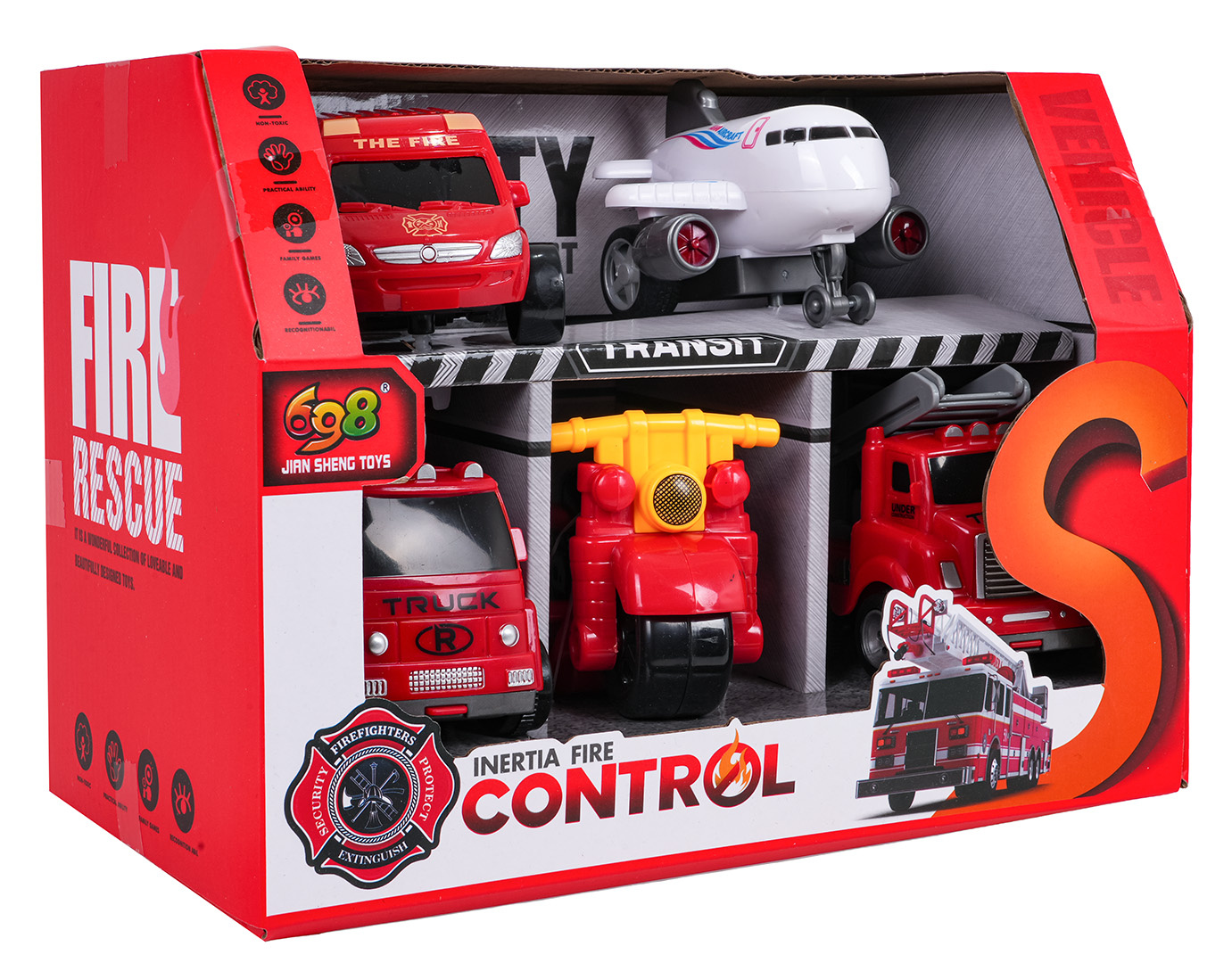Sada hasičských vozidel s pohonem pro děti od tří let. Autíčka nevyžadují použití baterií, pohánějí se tahem dozadu nebo dopředu. Dodatečně může být balení využito jako parkoviště pro vozidla.
