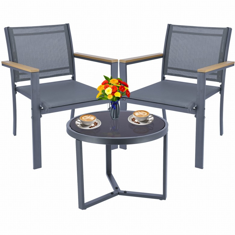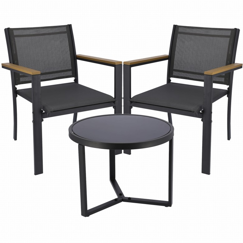 Tato sada: kombinuje vynikající funkčnost s moderním designem. Jedná se o zahradní nábytek, který se snadno udržuje. Zajišťuje stabilitu a významně přispívá k pohodlí při sezení. Velmi snadno se čistí, což znamená, že s trochou času a peněz bude váš nábytek stále zářit jako nový. Zaručuje pohodlné sezení Specifikace stolu: Hlavní materiál: ocel a sklo Maximální nosnost: 100 kg Specifikace židle: Hlavní materiál: ocel, textilén Maximální nosnost: 120 kg