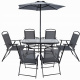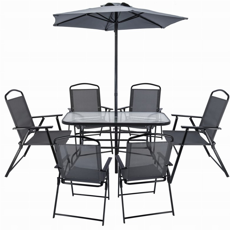 Sada zahradního nábytku se skládá ze 6 skládacích židlí z kovu a textilní tkaniny a stolu se skleněnou deskou a slunečníkem. Židle jsou stabilní, snadno se čistí a jejich skládací konstrukce usnadňuje skladování. Stůl má elegantní skleněnou desku a slunečník poskytuje ochranu před sluncem při odpočinku venku.