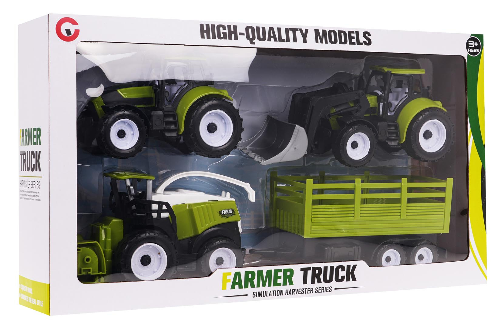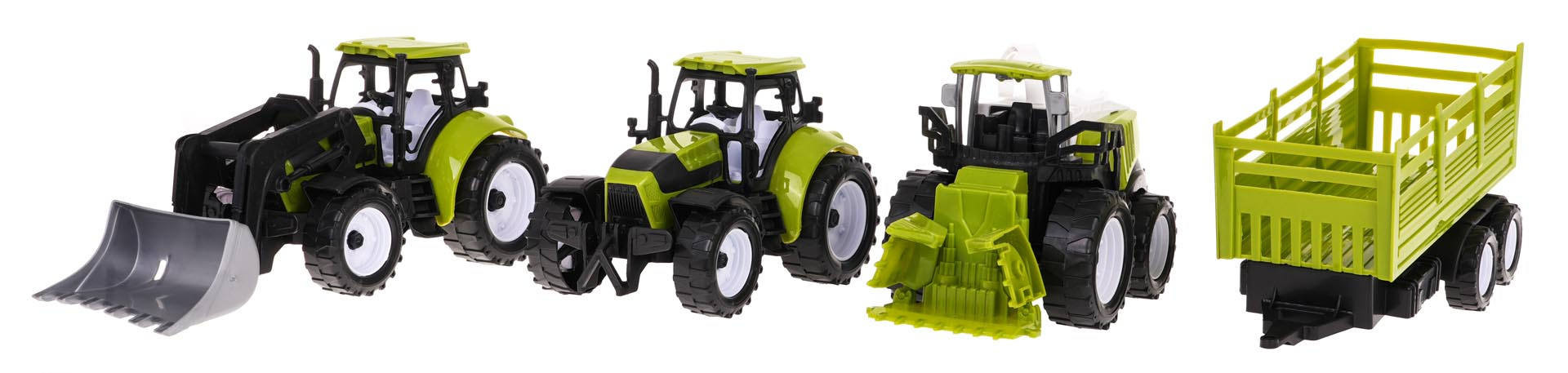 Sada zemědělských vozidel pro děti od 3 let. Sada je vyrobena z nejkvalitnějšího plastu. V sadě můžeme najít dva traktory, kombajn a přívěs. Traktory a kombajn byly zpracovány velmi realisticky s důrazem na detaily. Přívěs můžeme připojit jak k traktoru, tak ke kombajnu.