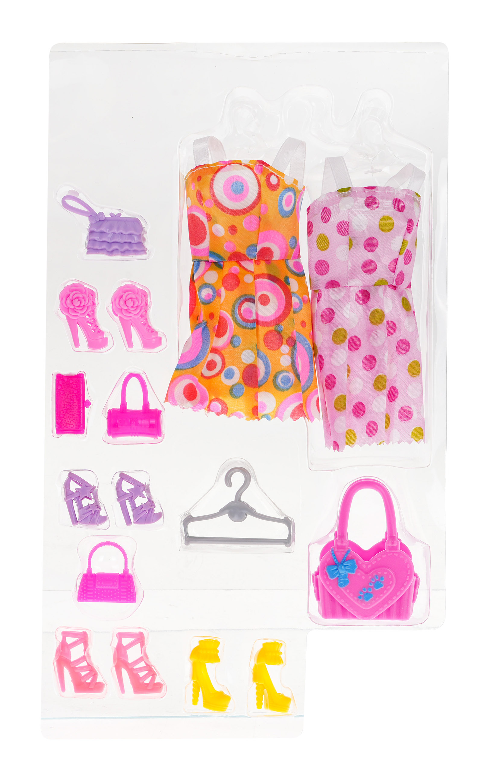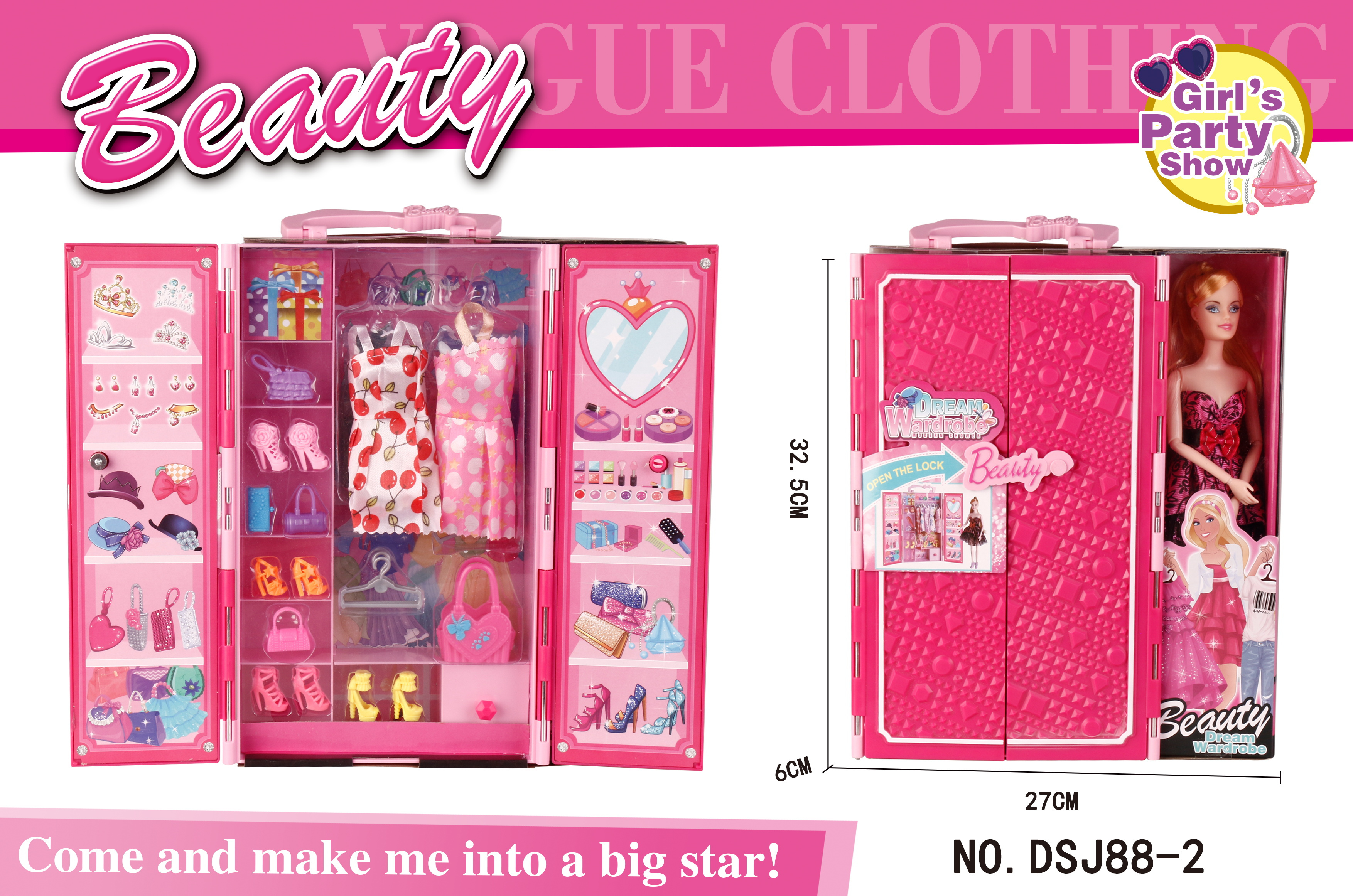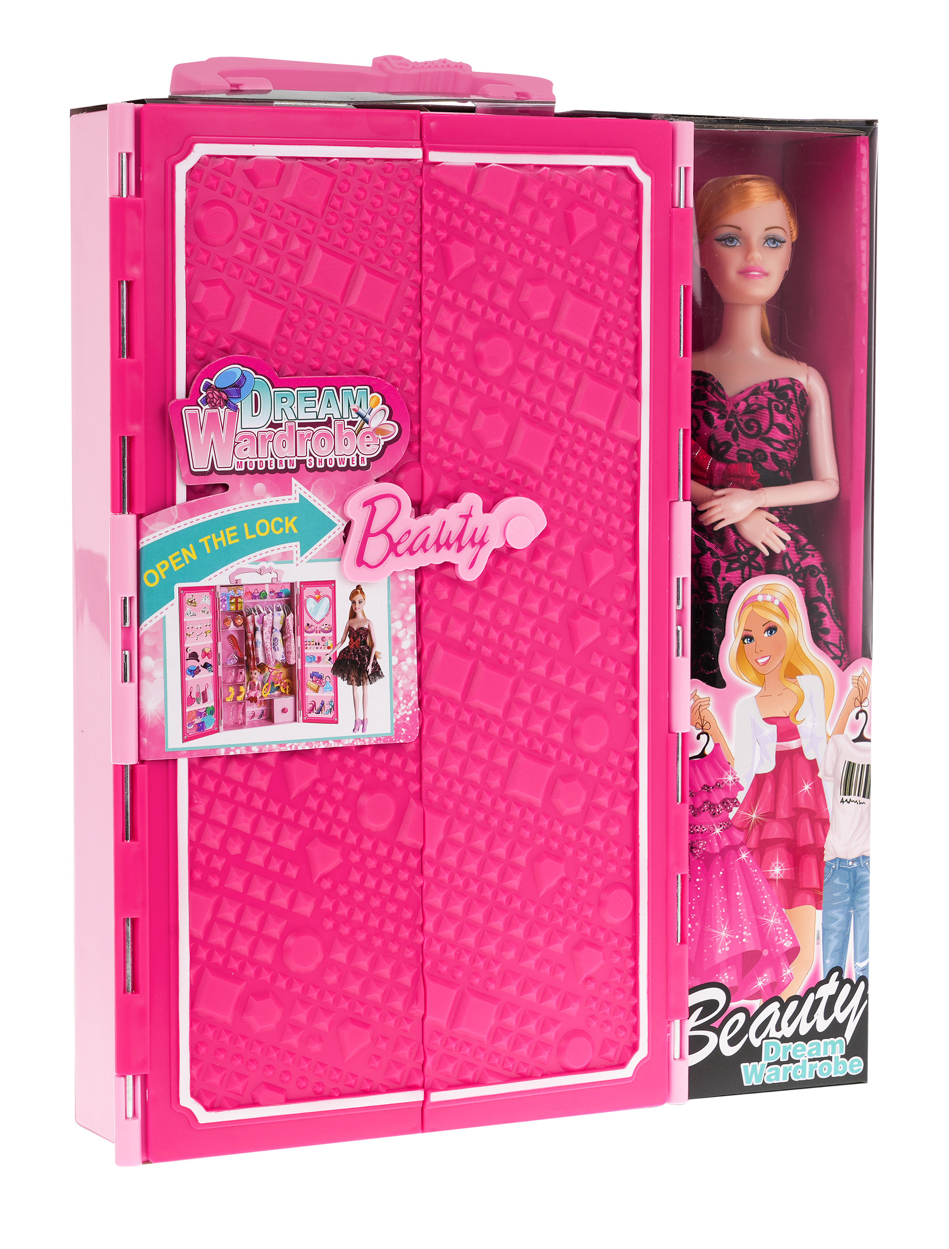Sada se skládá ze skříně vybavené dvěma šaty, kabelkami, botami a panenkou s pohyblivou hlavou, rukama a nohama.