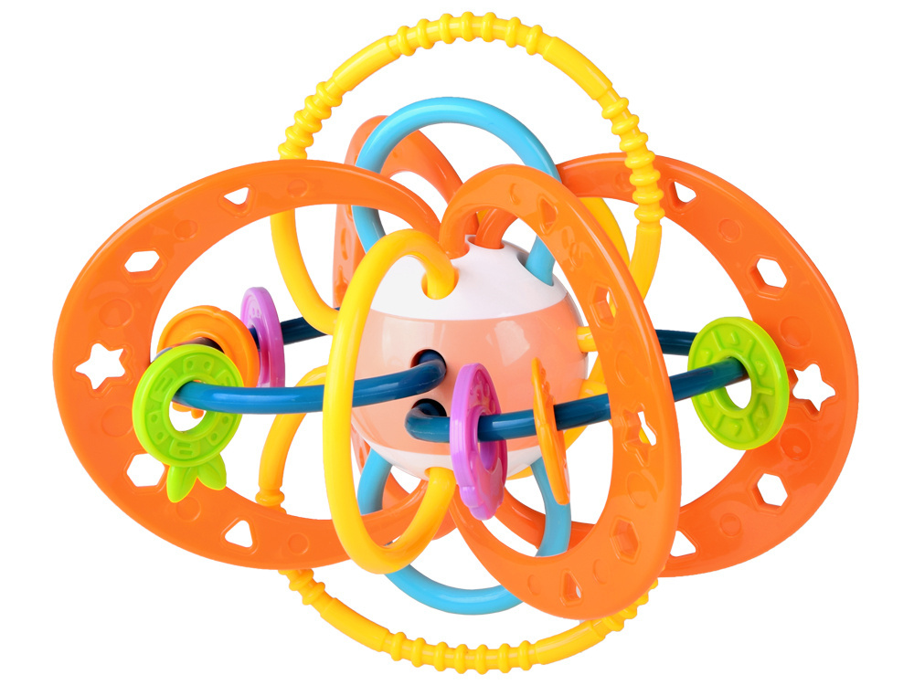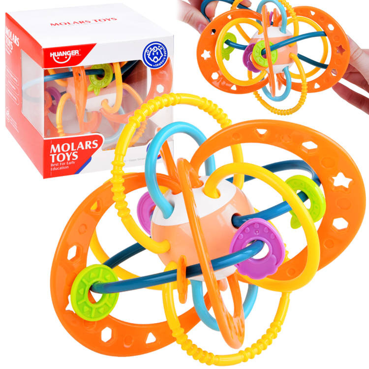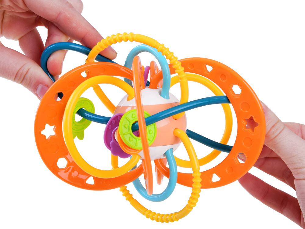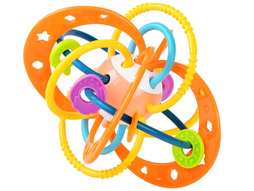 Díky ohebným prvkům bude moci dítě hračku bez problémů držet v rukou. Hladký a měkký povrch pružných válců skvěle masíruje dásně vašeho dítěte. Barevné dílky umístěné na pružných vírech snadno kloužou po hračce.