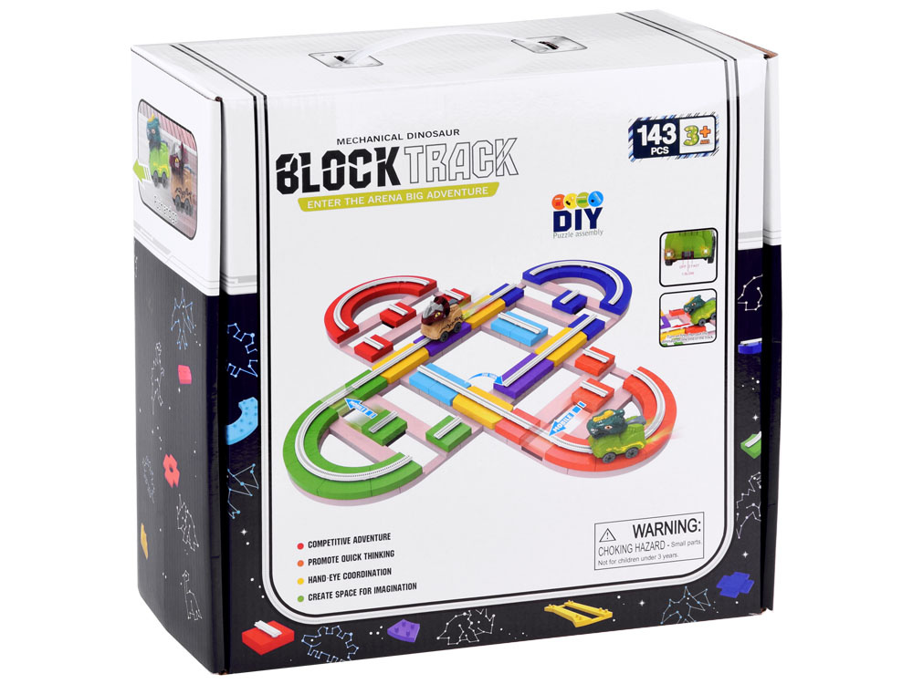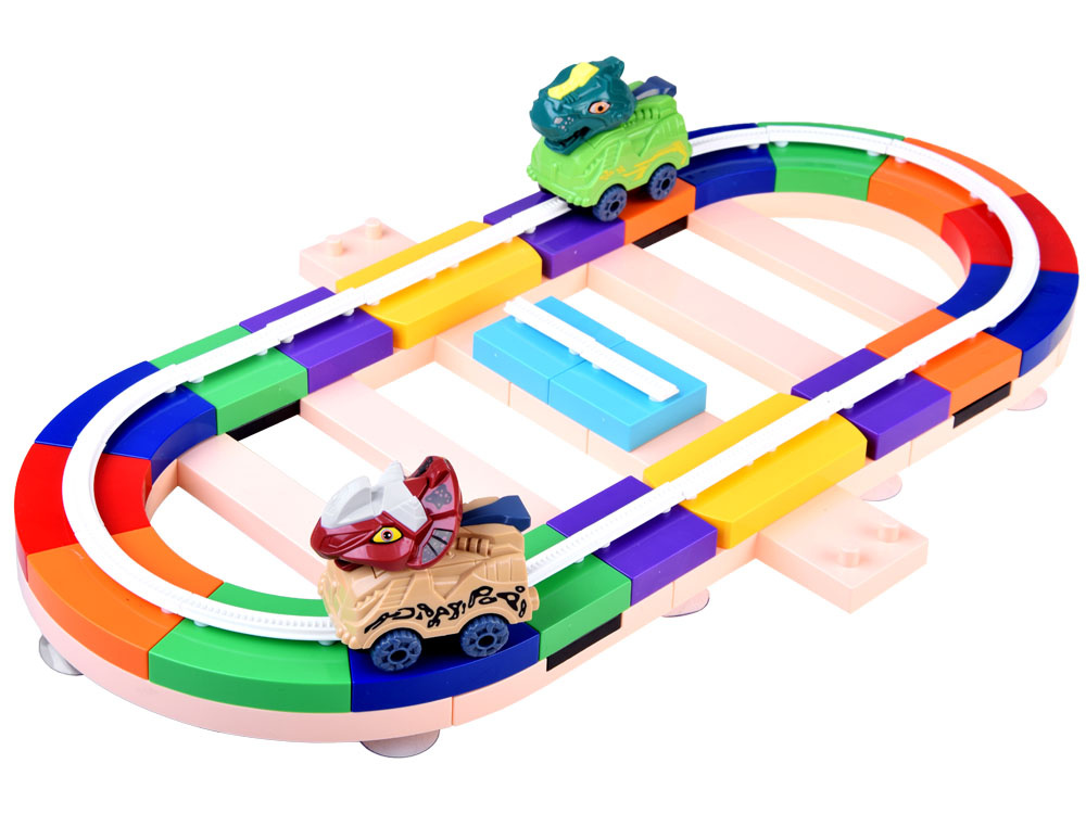 Autodráha s dinosaury je kreativní sada pro malé stavitele. Sada se skládá ze 143 dílků k sestavení dráhy a 2 autíček s hlavami dinosaurů. Vynikající zábava zaručena. Hračku lze umístit na rovný povrch v libovolné konfiguraci tak, aby byla zajištěna plynulá jízda, ale lze ji také připevnit ke svislé, hladké, rovné stěně pomocí přísavek.