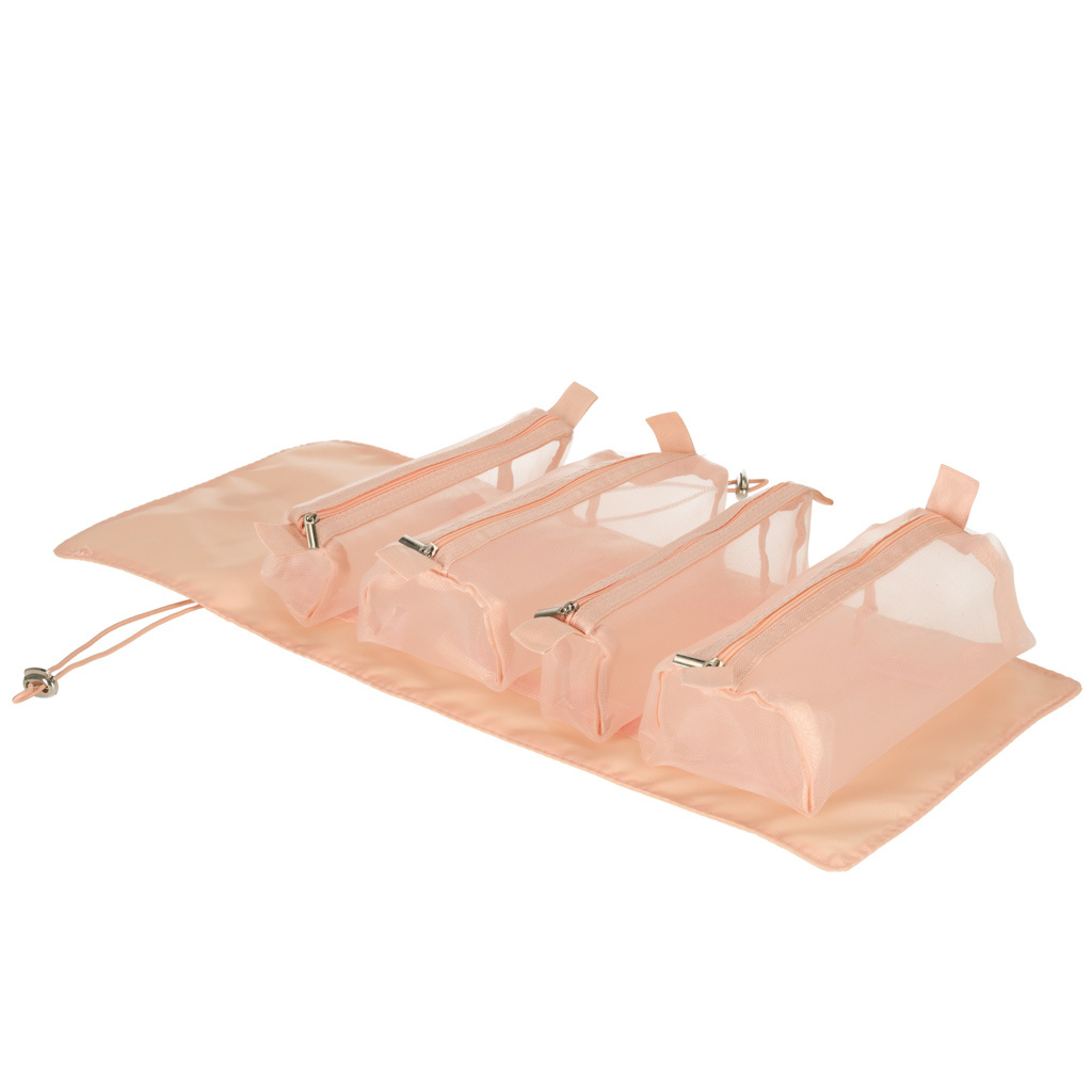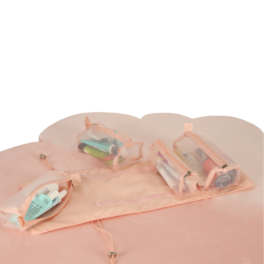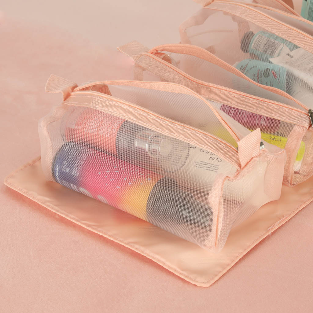Růžová kosmetická taštička na cesty - lze srolovat, aby v zavazadle zabírala méně místa. Má čtyři přihrádky, které lze vyjmout. Stěny přihrádek jsou vyrobeny ze síťoviny, která usnadňuje hledání výrobků a také zajišťuje dobré odvětrávání mokrých obalů.