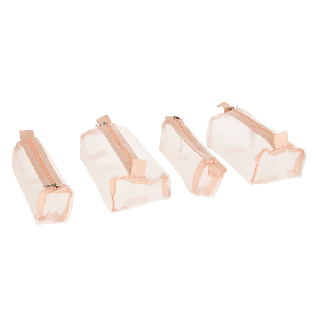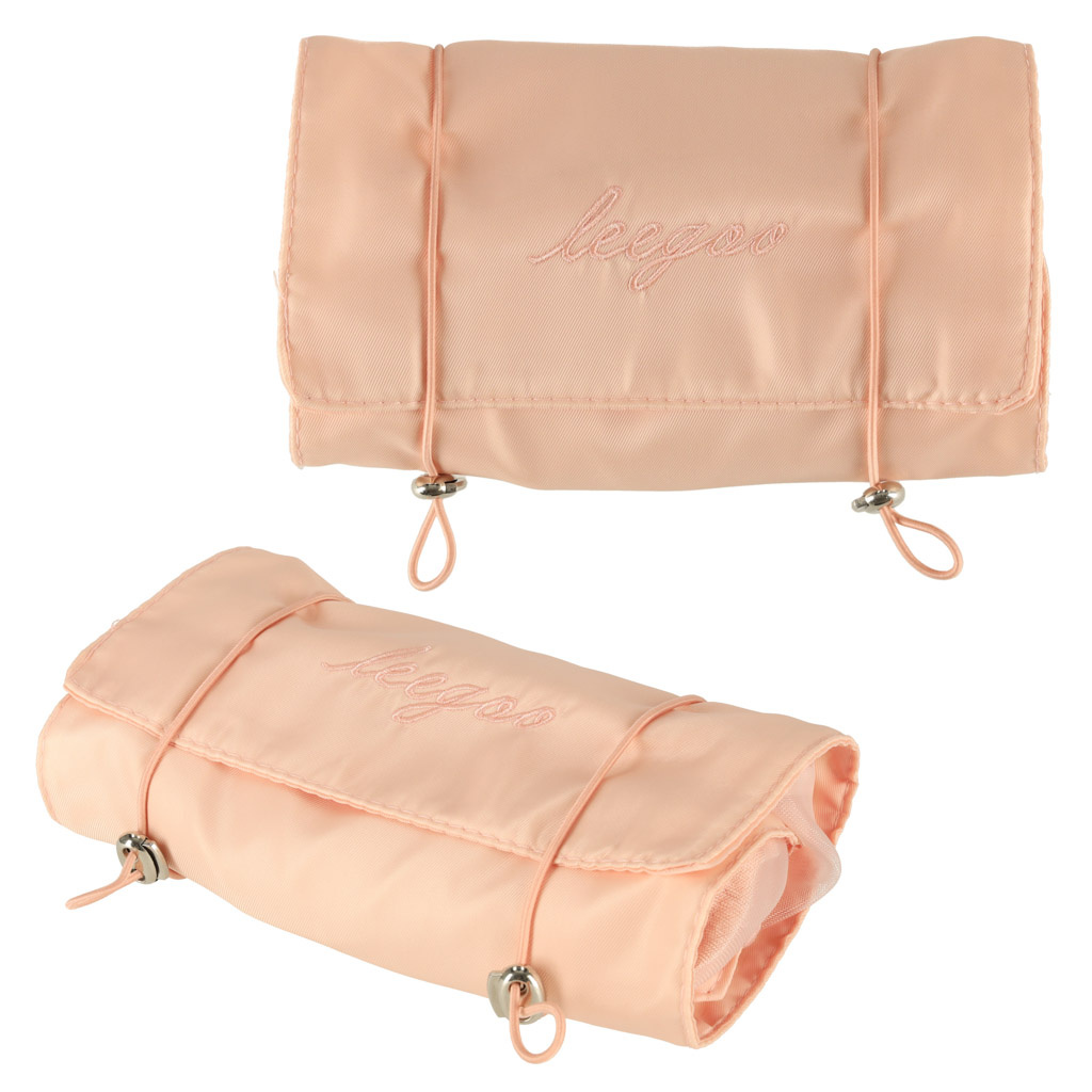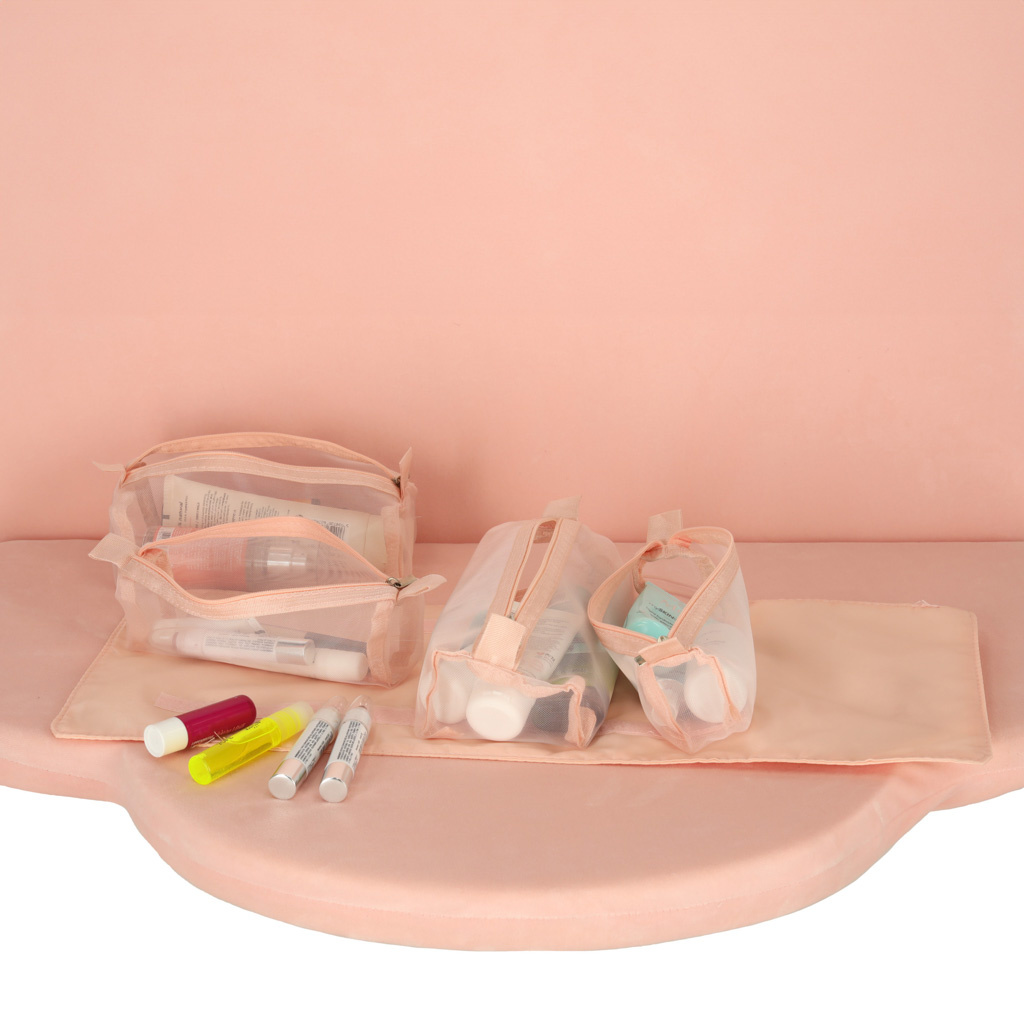 Růžová kosmetická taštička na cesty - lze srolovat, aby v zavazadle zabírala méně místa. Má čtyři přihrádky, které lze vyjmout. Stěny přihrádek jsou vyrobeny ze síťoviny, která usnadňuje hledání výrobků a také zajišťuje dobré odvětrávání mokrých obalů.