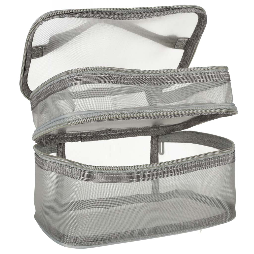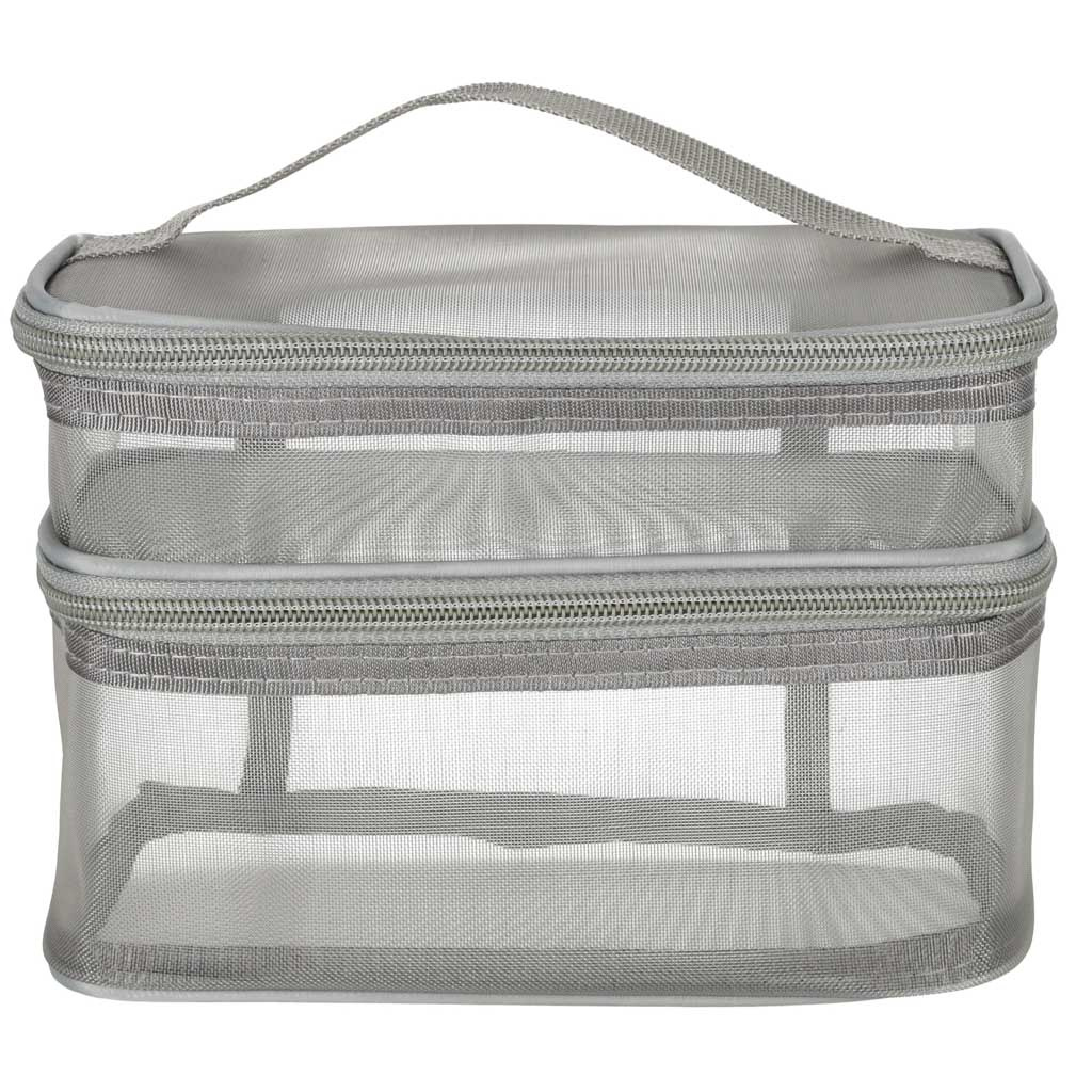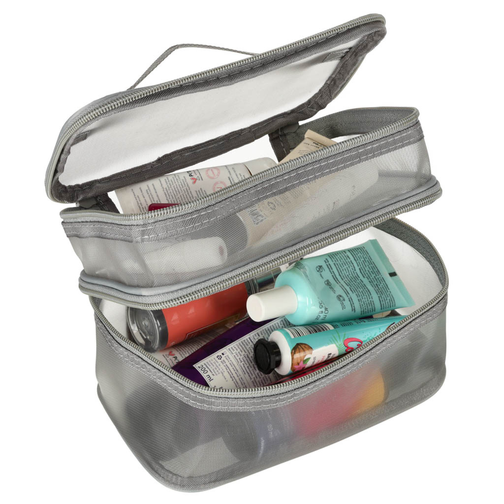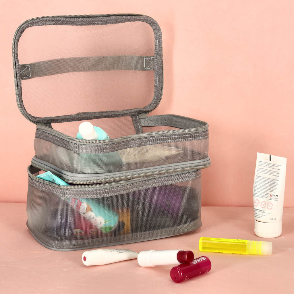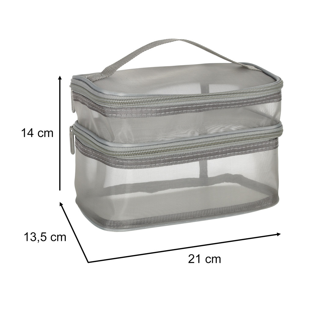 Praktická cestovní kosmetická taška - je nezbytnou výbavou na každé cestě. Díky svému dvouúrovňovému designu umožňuje uspořádat vaši kosmetiku. Zapíná se na oboustranný zip. Je vyrobena ze síťovaného materiálu, který usnadňuje hledání ukrytých produktů. Má praktickou rukojeť pro pohodlné přenášení.