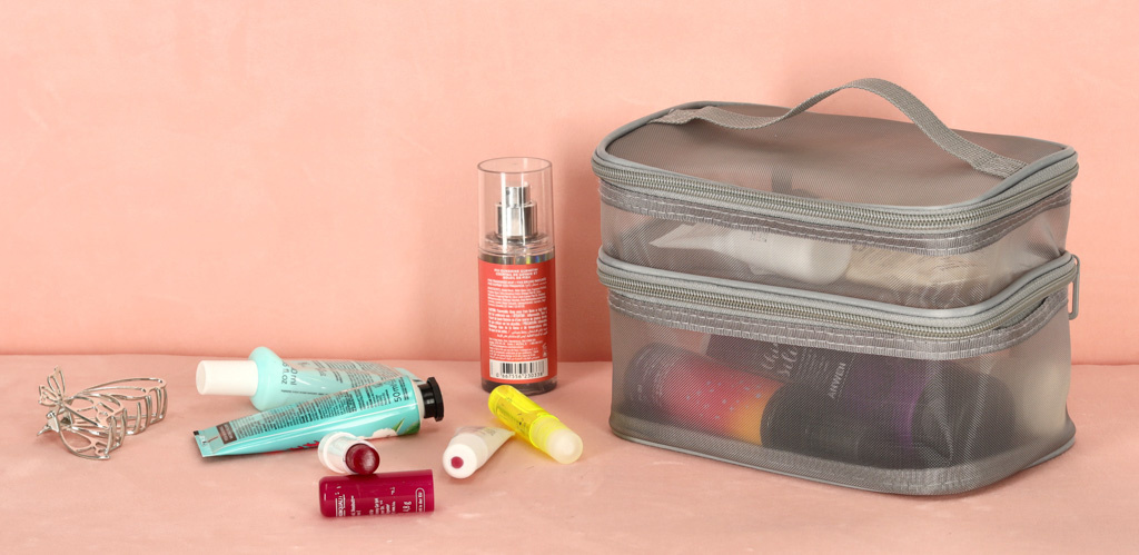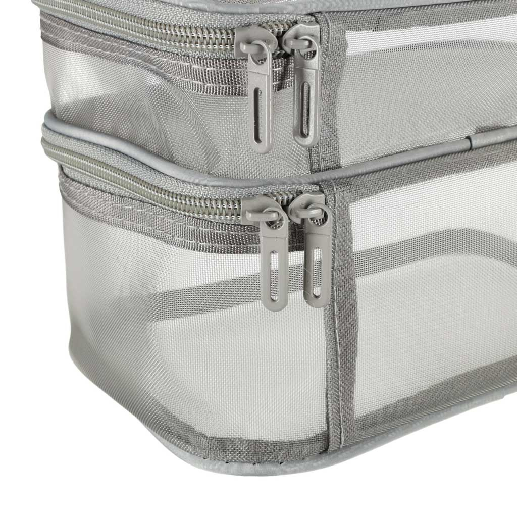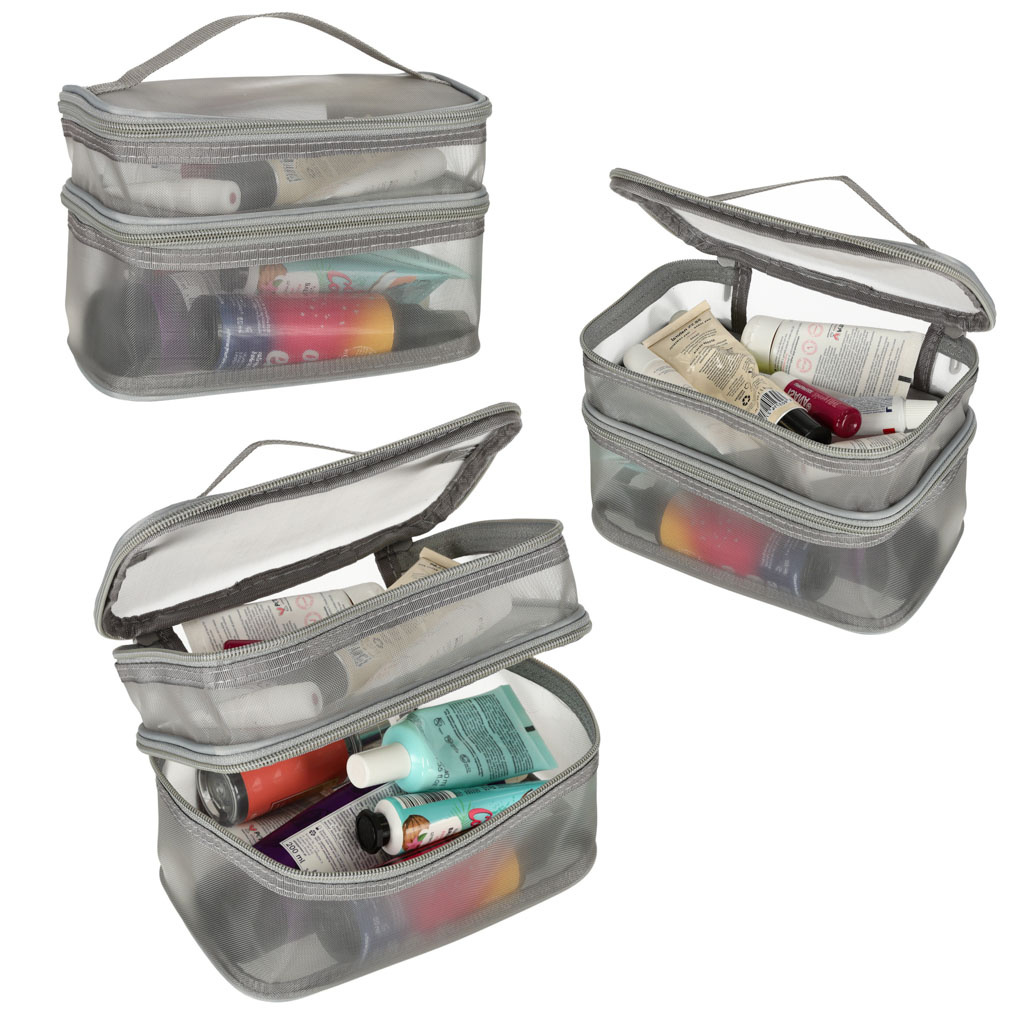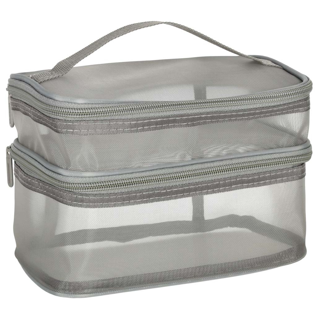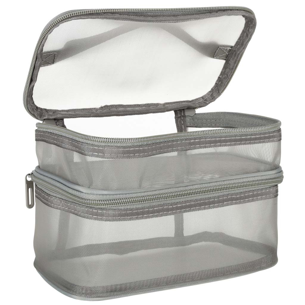 Praktická cestovní kosmetická taška - je nezbytnou výbavou na každé cestě. Díky svému dvouúrovňovému designu umožňuje uspořádat vaši kosmetiku. Zapíná se na oboustranný zip. Je vyrobena ze síťovaného materiálu, který usnadňuje hledání ukrytých produktů. Má praktickou rukojeť pro pohodlné přenášení.