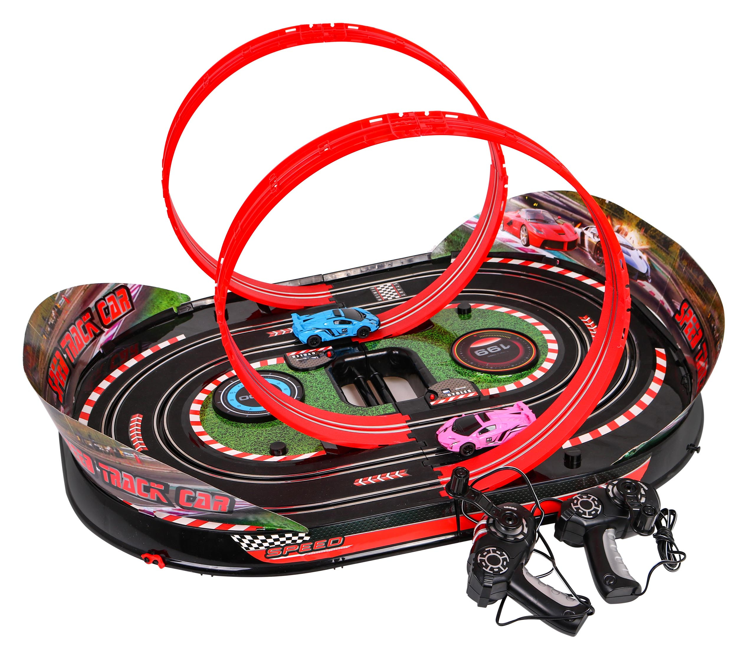Úžasná závodní dráha Speed Track se dvěma smyčkami pro děti od 6 let. Hračka má zvukové efekty (zvuk závodního auta) a světelné efekty (přední světla auta, rychloměry na trati). Sada nevyžaduje žádné baterie a ovládá se ručně, stačí otočit klikou na ovladači a vozidlo se dá do pohybu. Čím rychleji se budete otáčet, tím rychleji bude vaše vozidlo klouzat po dráze. Po zakoupení dálkových ovladačů a napájecího zdroje je možné dráhu přestavět na R/C verzi.
