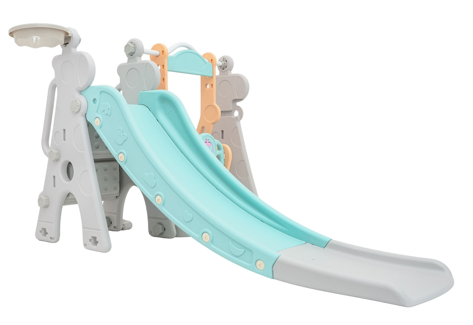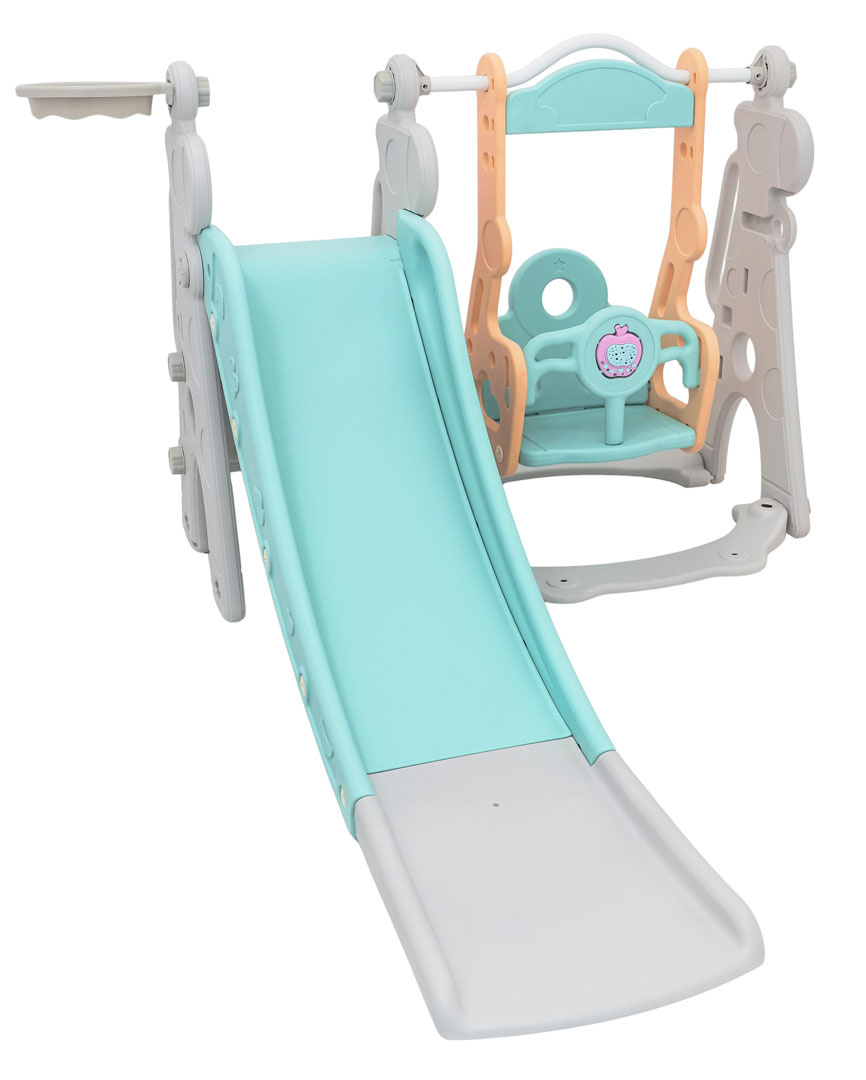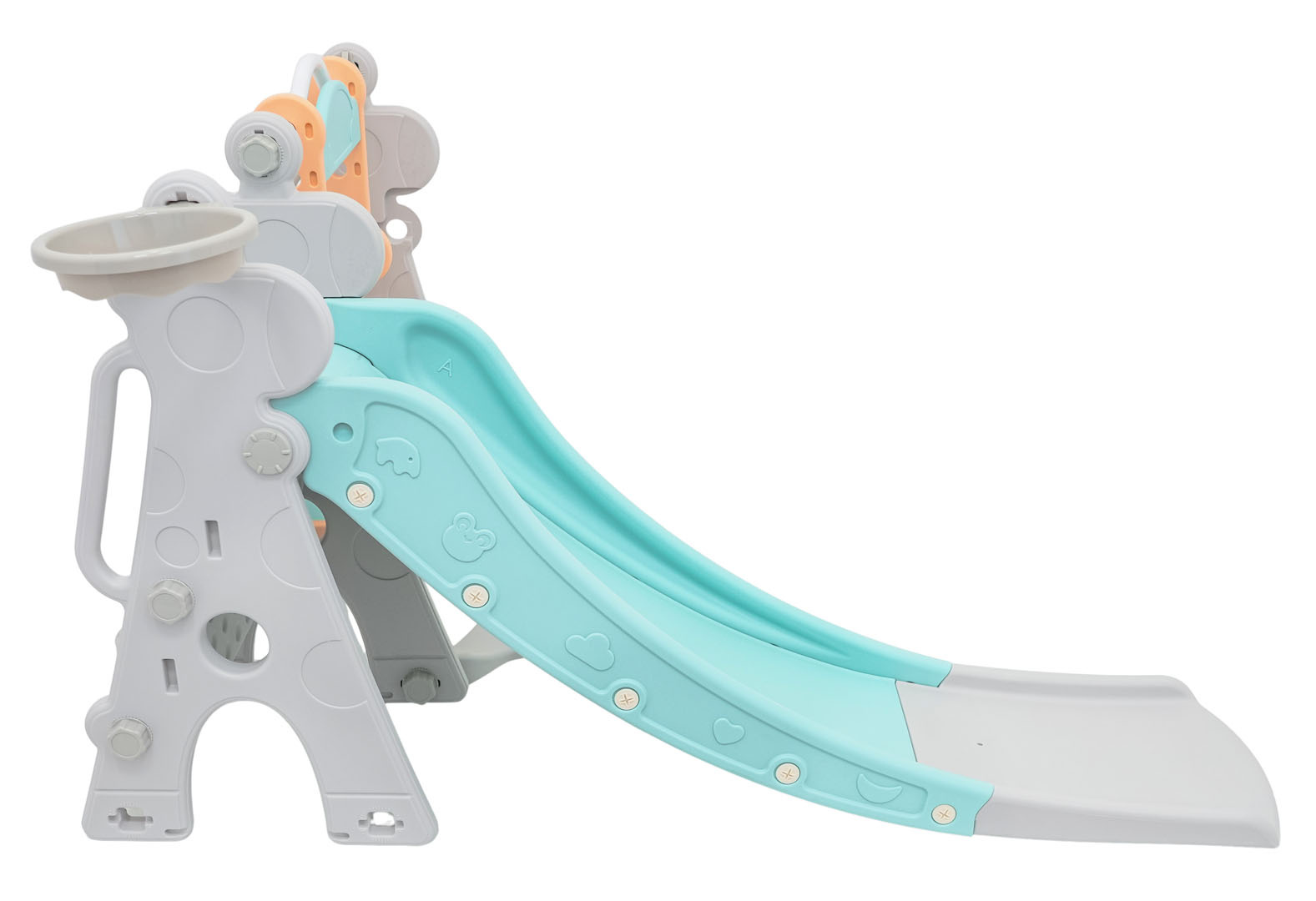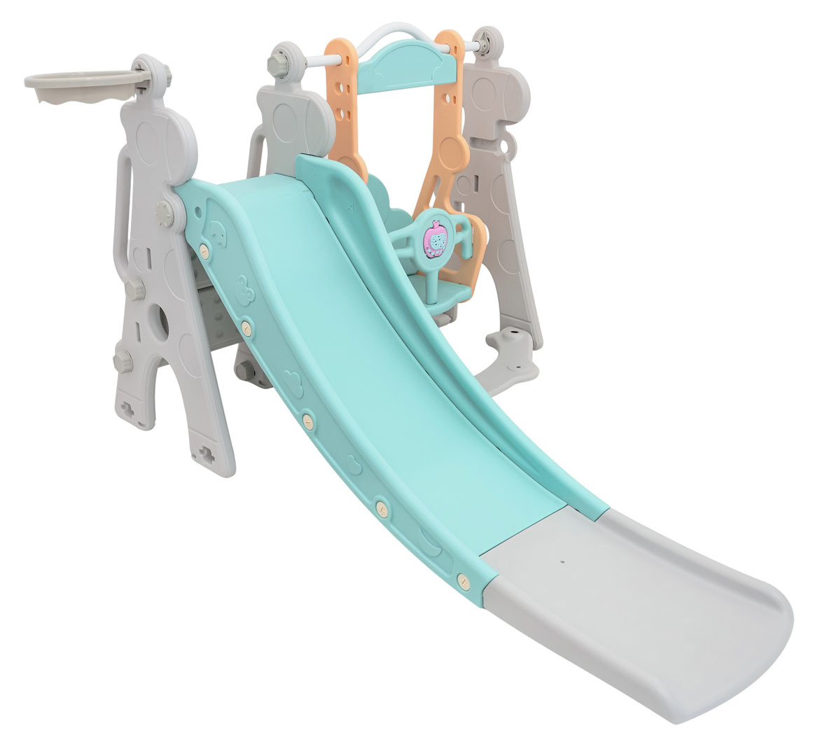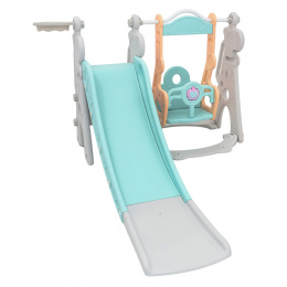 Sada 3v1, skluzavka, houpačka, basketbal pro děti od 1 roku. Všechny prvky sady jsou vyrobeny z vysoce kvalitního materiálu HDPE, který je pružnější a odolnější vůči mechanickému poškození ve srovnání s materiály používanými v jiných konstrukcích tohoto typu. Velké komponenty usnadňují montáž. Sada se ideálně hodí pro venkovní i vnitřní použití.