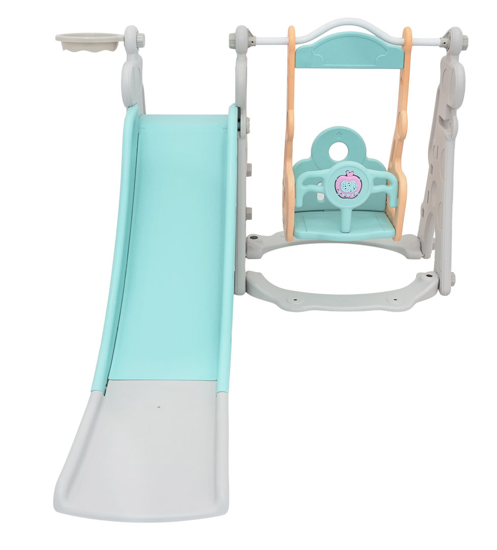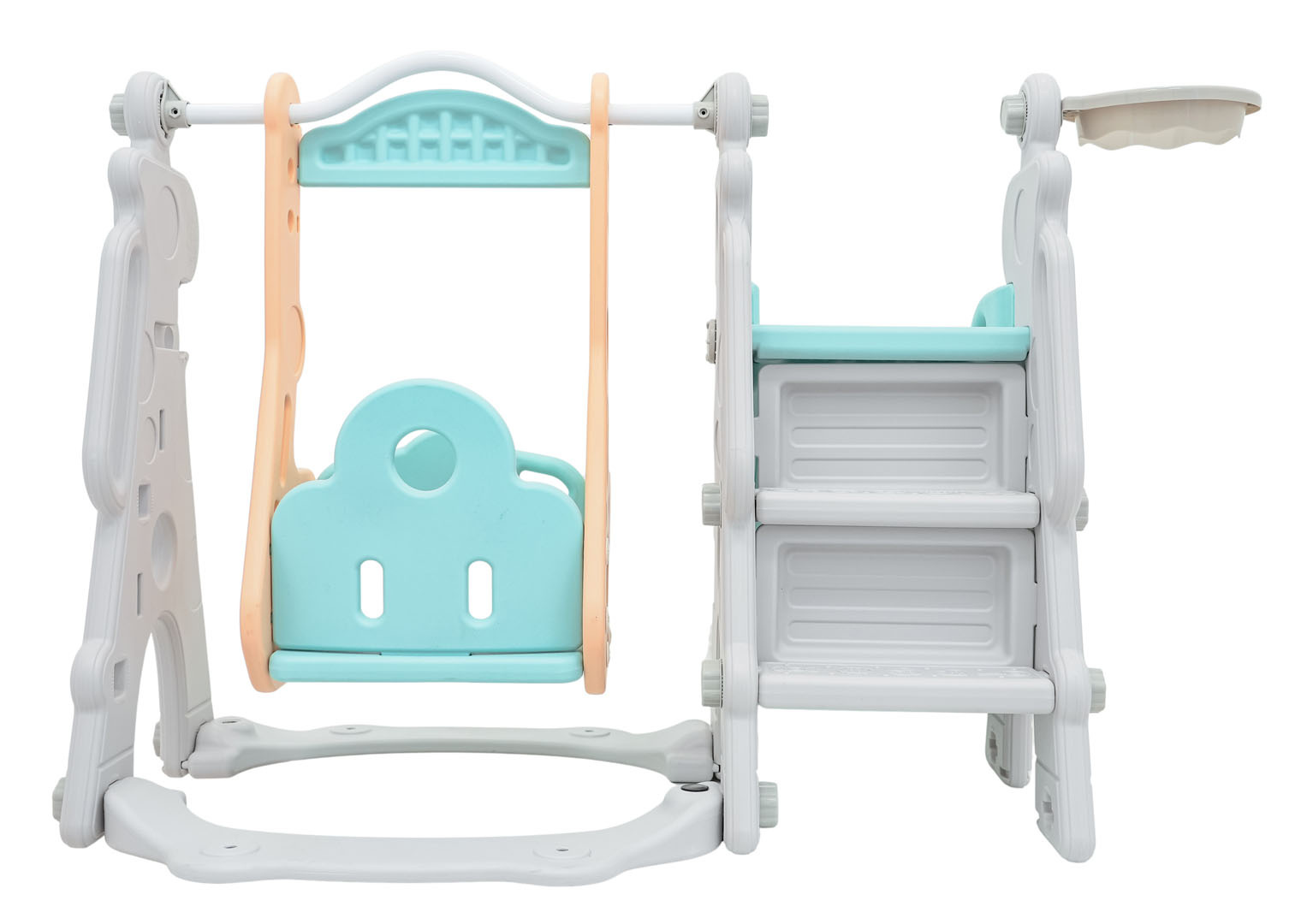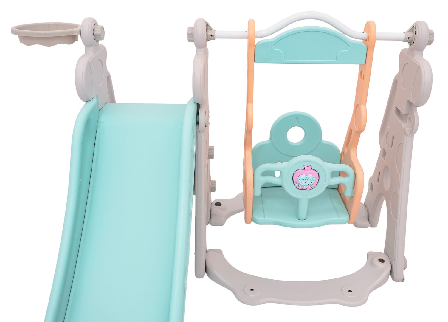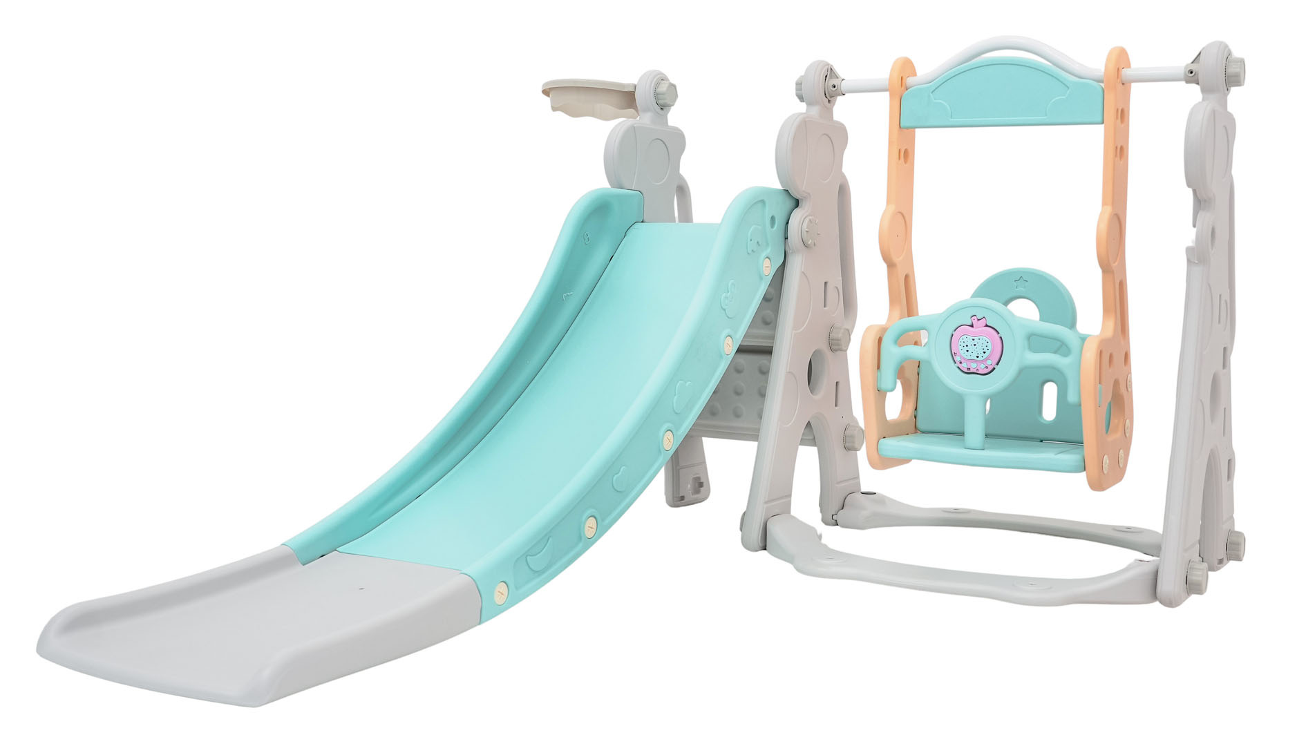 Sada 3v1, skluzavka, houpačka, basketbal pro děti od 1 roku. Všechny prvky sady jsou vyrobeny z vysoce kvalitního materiálu HDPE, který je pružnější a odolnější vůči mechanickému poškození ve srovnání s materiály používanými v jiných konstrukcích tohoto typu. Velké komponenty usnadňují montáž. Sada se ideálně hodí pro venkovní i vnitřní použití.