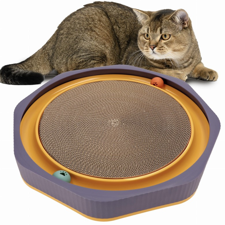 Střed je vyroben z lepenky.Jako dodatek do sady byla přidána přírodní šanta kočičí pro další atrakce. Lze ji nasypat do štěrbin škrabadla, díky čemuž se k němu kočka bude raději vracet. Barvy hračky přitahují pozornost a povzbuzují k zájmu o ni.Taková hračka odrazuje kočku od škrábání nábytku a osobních věcí. Je pevná a má širší základnu, díky čemuž se při intenzivní hře neklouže po podlaze.Do boků základny jsou zabudovány dvě kuličky, které jsou dalším lákadlem celé hračky. Její velikost umožňuje zvířeti lehnout si na ni a odpočívat.
