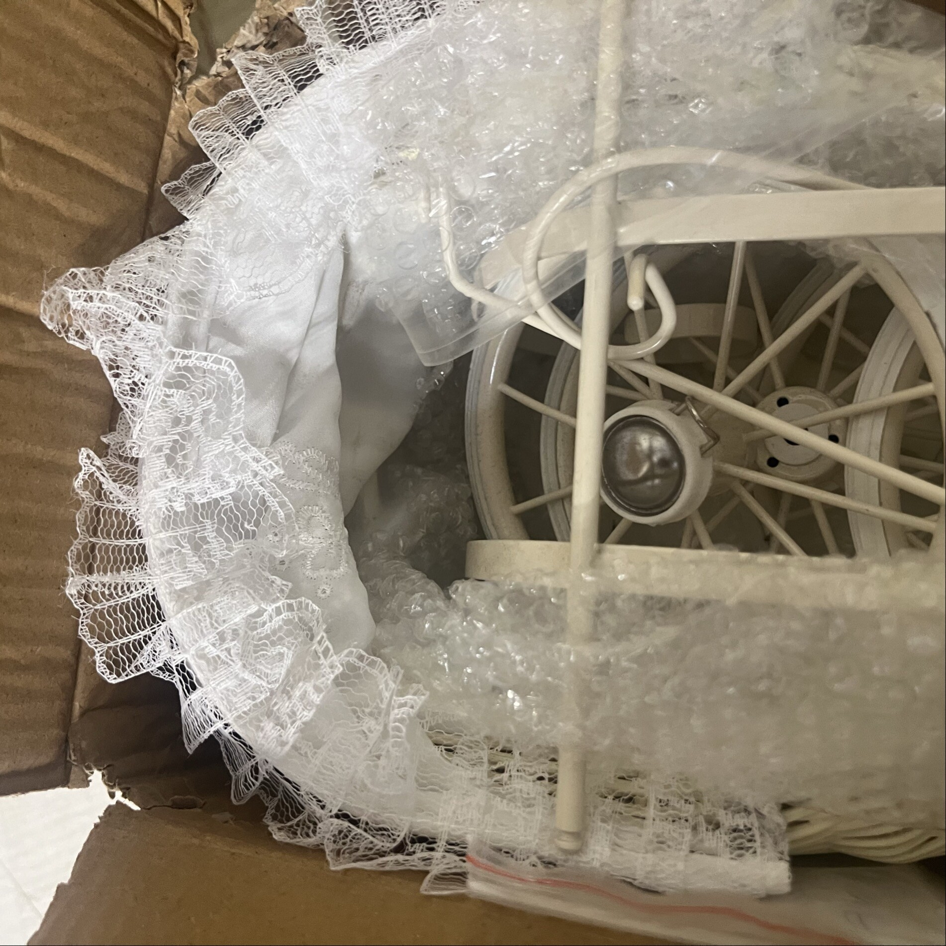 Tento bílý proutěný kočárek na kovovém rámu je současně stylovou hračkou a kouzelnou dekorací. Krásná kola s drátěným výpletem potažená gumou zaručují tichou jízdu. Stříška z jemného textilu zdobena bílou krajkou a drobnými výšivkami se dá sklápět. Výrobek vyžaduje montáž, dodáváno s obrázkovým návodem k sestavení. Hlavní vlastnosti: pogumovaná kola - tichá jízda, sklápěcí stříška a atraktivní provedení z dřevěného proutí.