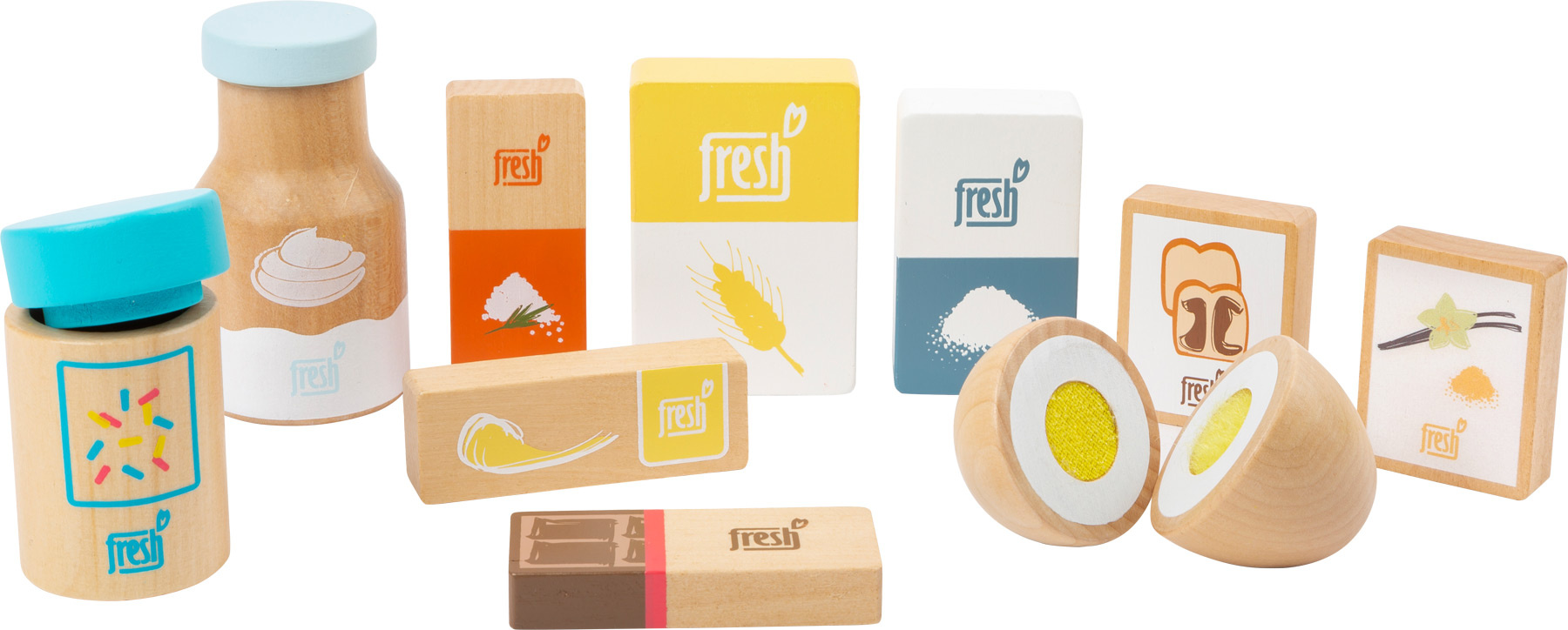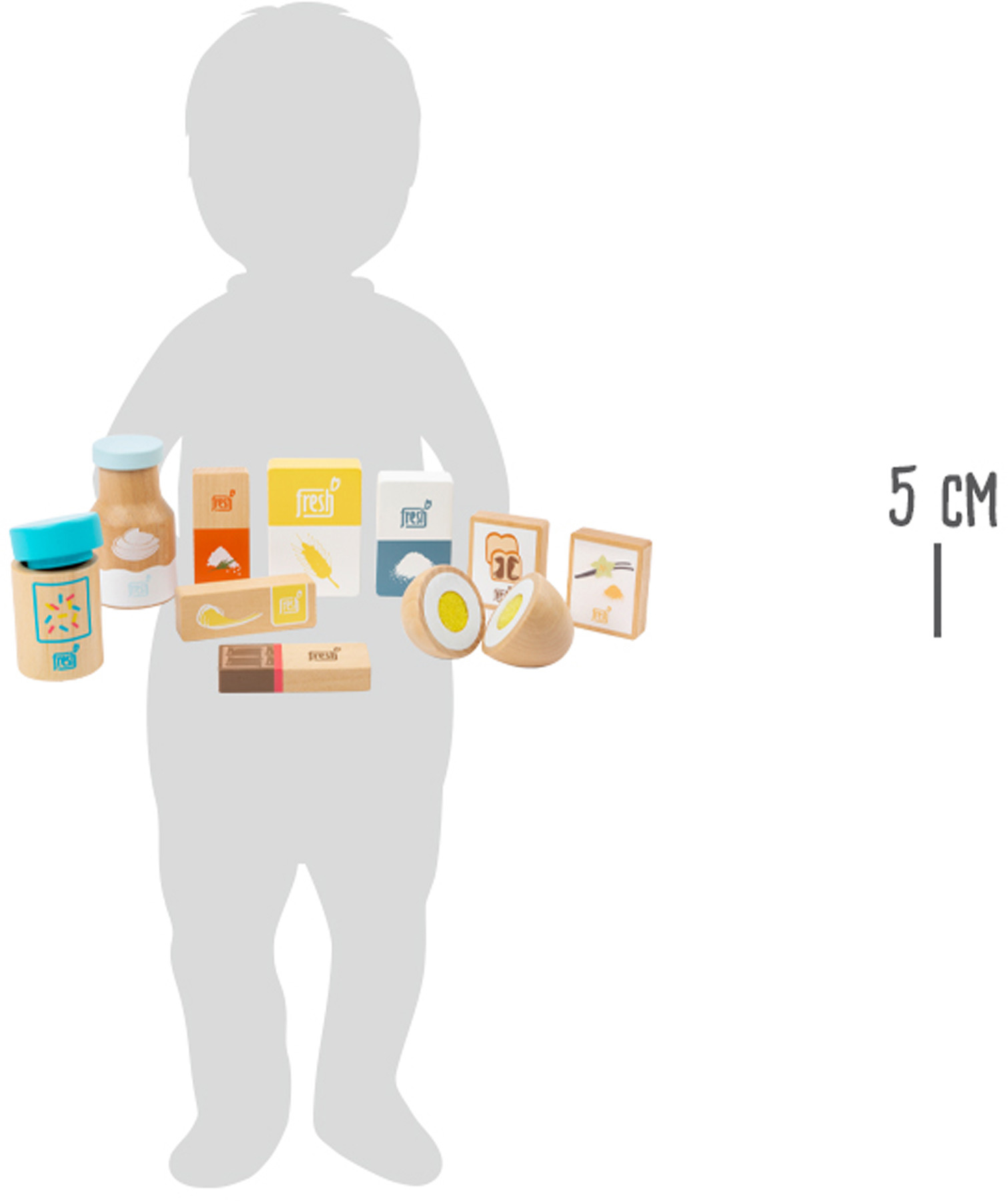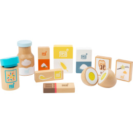 Pozor, všichni pekaři a cukráři! Tato 10dílná sada dřevěných ingrediencí k pečení nabízí vše, co si srdce mladých pekařů žádá. Kromě mouky zde naleznete cukr, smetanu, sůl a prášek do pečiva, také balení vanilkového cukru a rozložitelné vajíčko. To je to nejdůležitější na pečení v domácí kuchyňce. Hotový produkt posypeme čokoládou a zdobením a můžeme podávat! Hlavní vlastnosti: obsahuje 10 ingrediencí podporuje hraní rolí a učí o jídle v domácnostirozvíjí motoriku dětí.