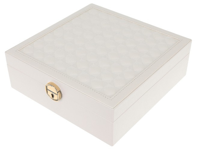 PROSTORNÝ - truhla se skládá z: snímatelného krytu se 2 přihrádkami s válečky na prsteny, 4 přihrádek na další šperky, snímatelné kazety. Ve spodní části je 6 dalších přihrádek, 2 vložky na hodinky nebo náramky a 1 velká, obdélníková přihrádka na větší předměty. Přihrádky jsou vystlány měkkým materiálem pro ochranu jemných šperků proti poškrábání.