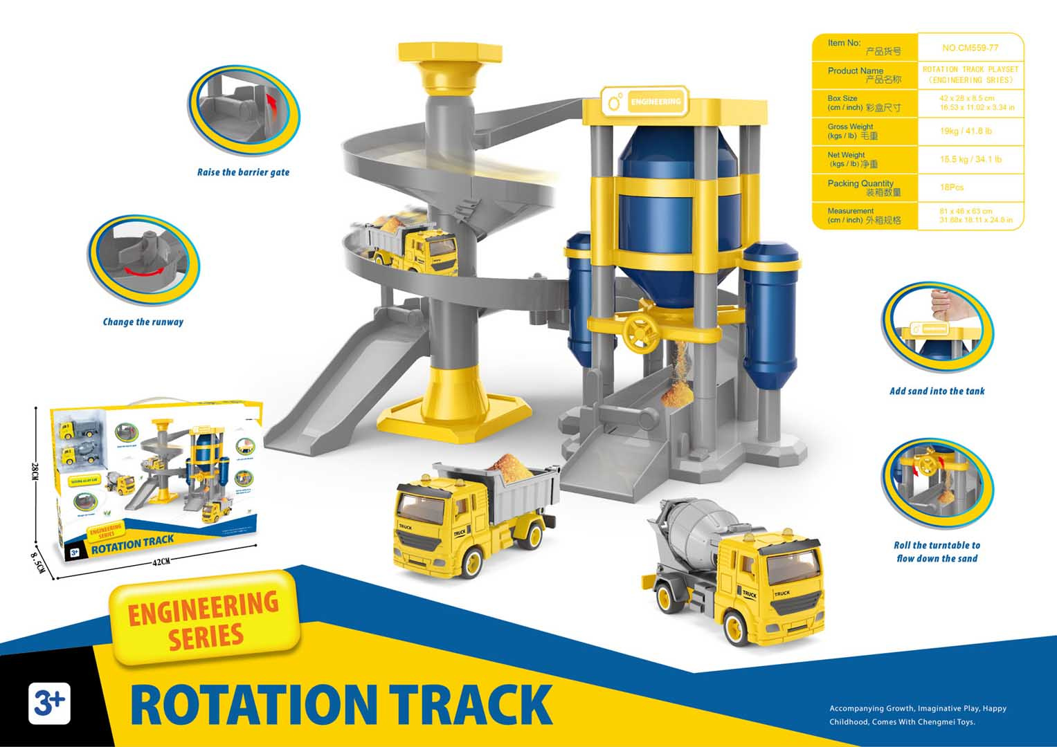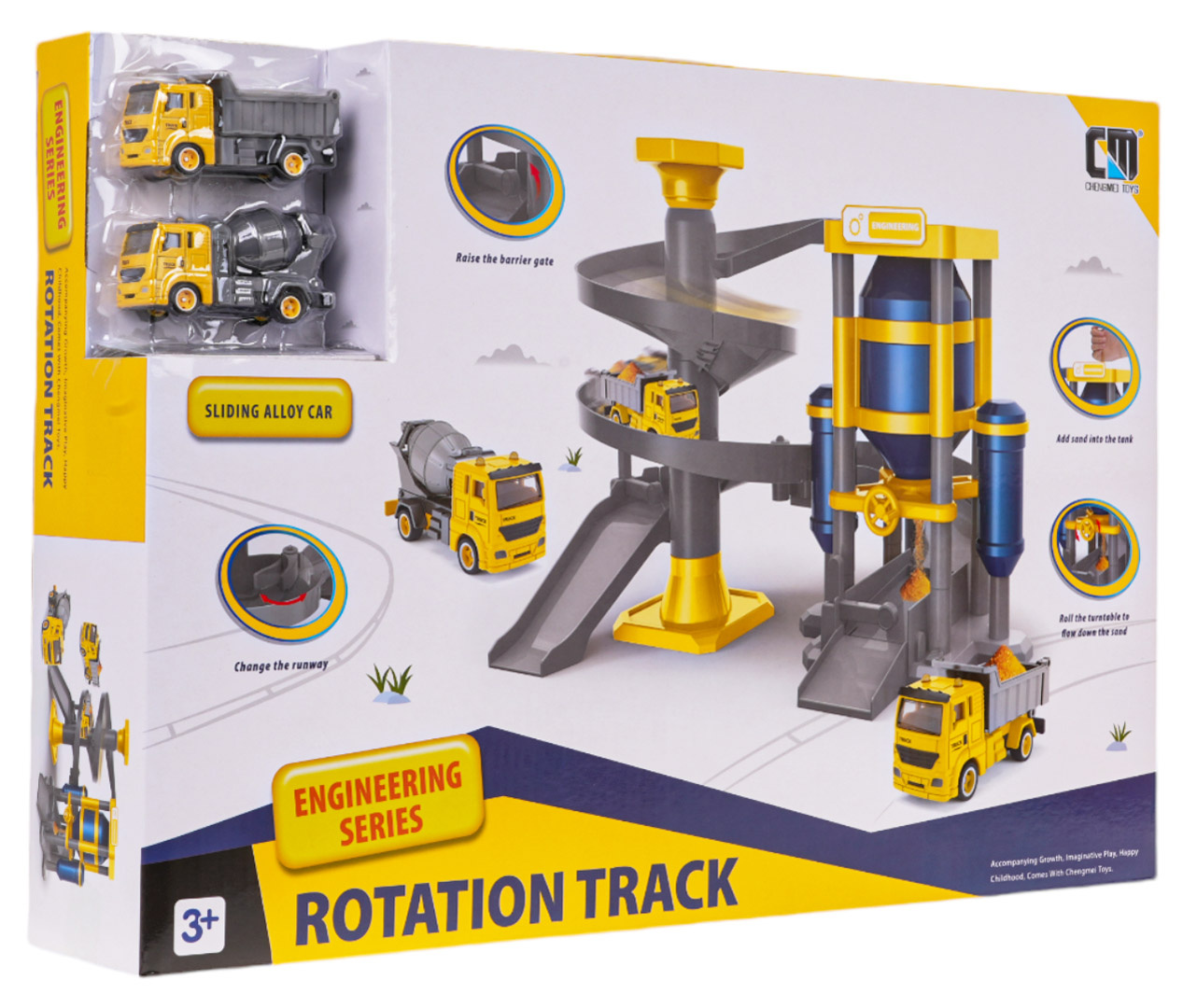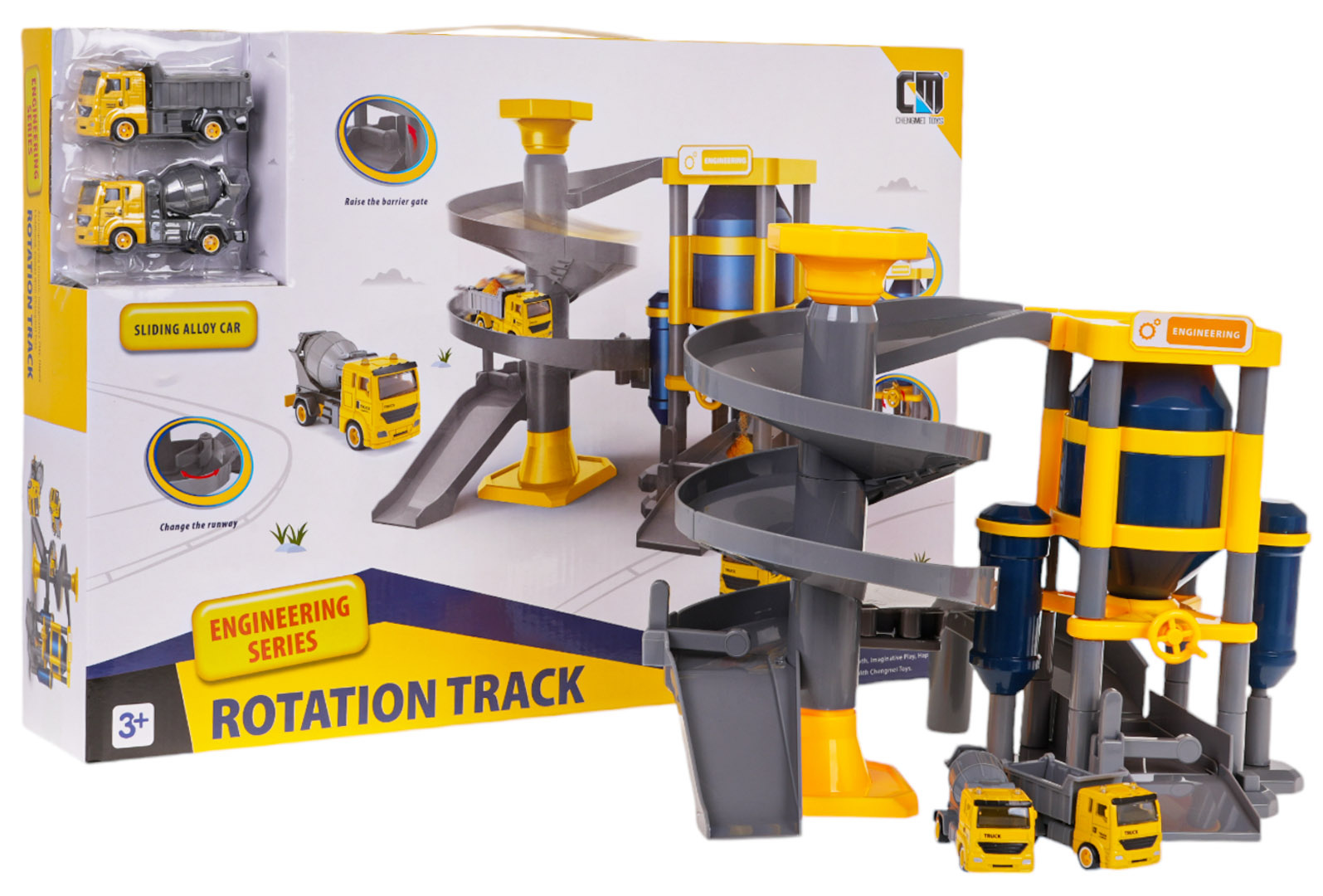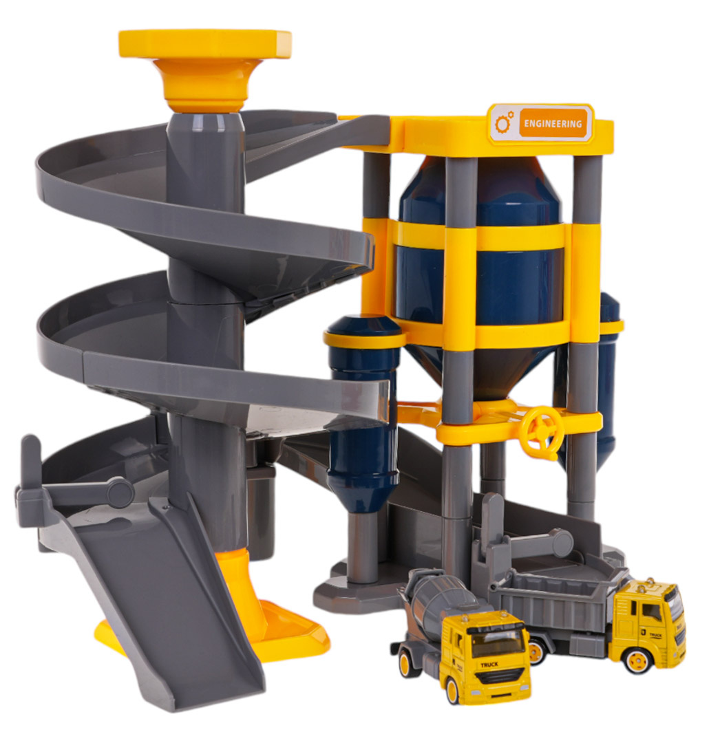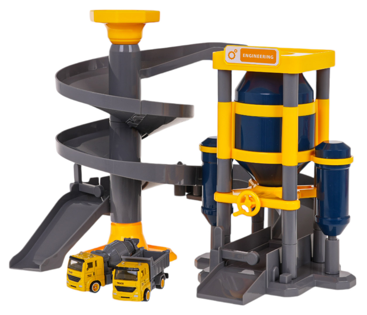 Staveniště se silem, skluzavkami a autíčky pro děti od 3 let. Sada byla vyrobena z plastu nejvyšší kvality, s důrazem na detaily. Staveniště se skládá z části se silem, do kterého můžeme nasypat písek, a poté otočit klikou a odsypat potřebné množství, a části se skluzavkami, po kterých se mohou pohybovat stavební vozidla přiložená k sadě. V sadě najdeme sklápěčku a míchačku na beton.