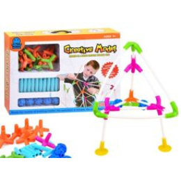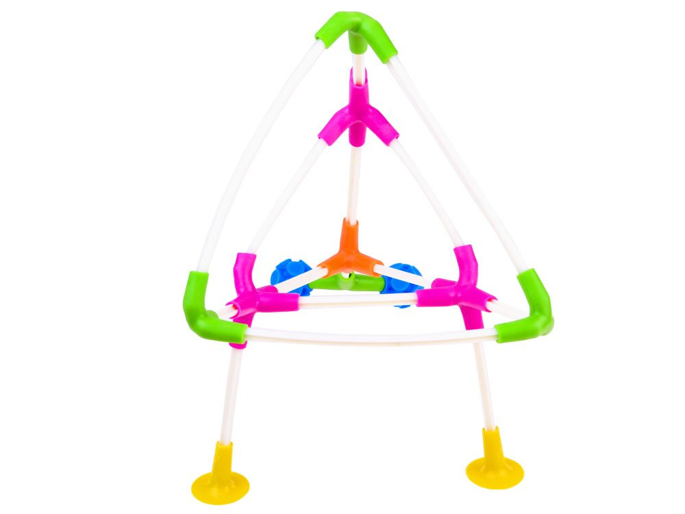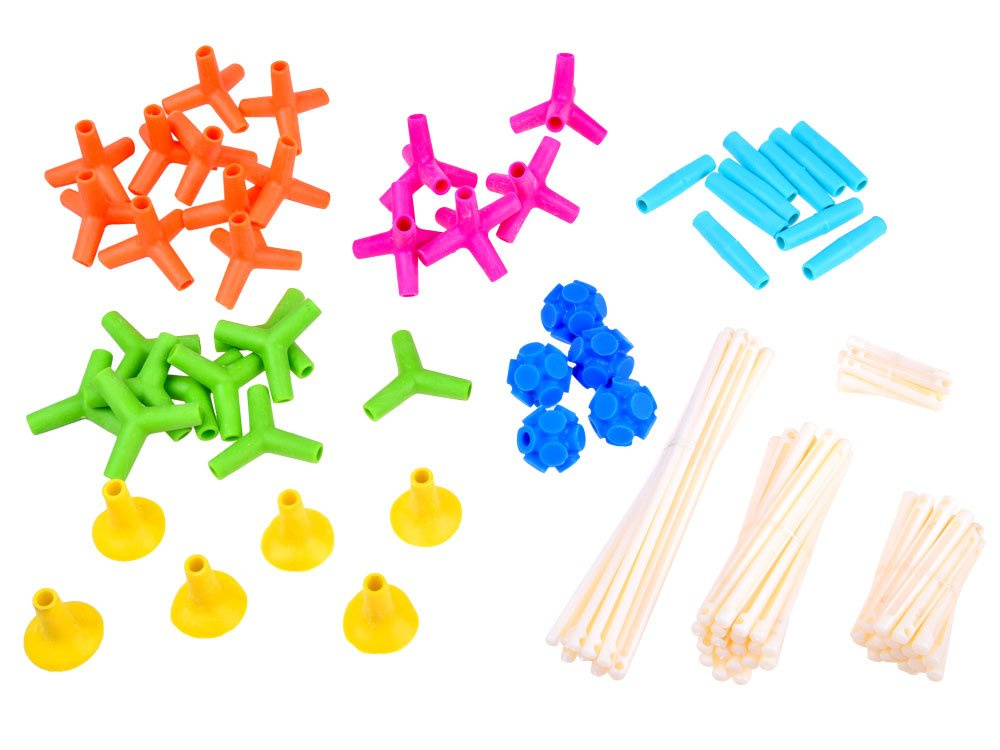 Plastové tyčinky různých délek, gumové spojky a přísavky vám umožní stavět skutečně trojrozměrné stavby.