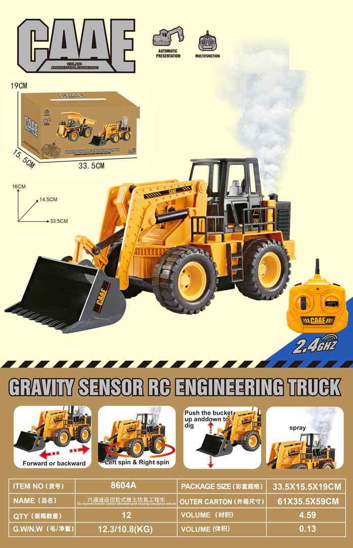 Dálkově ovládané stavební vozidlo s funkcí kouře pro děti od 3 let. Vozidlo jezdí všemi směry, má pohyblivé prvky jako zvedací a spouštěcí lžíci a funkci kouře. Po naplnění nádržky umístěné na zadní straně buldozeru se bude uvolňovat kouř. Vozidlo je napájeno bateriemi typu 4 x AA 1,5 V (nejsou součástí balení), ovladač bateriemi typu 2 x AA 1,5 V (nejsou součástí balení).