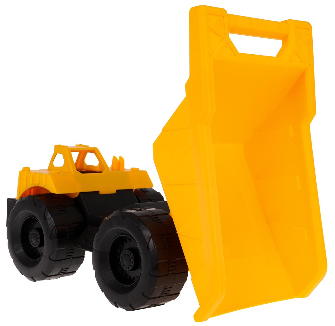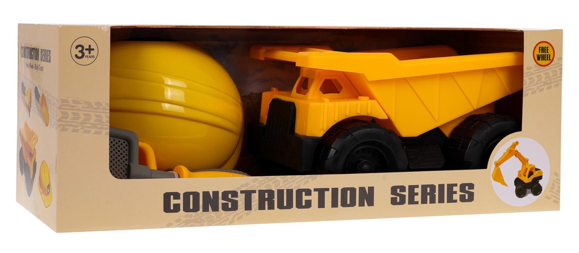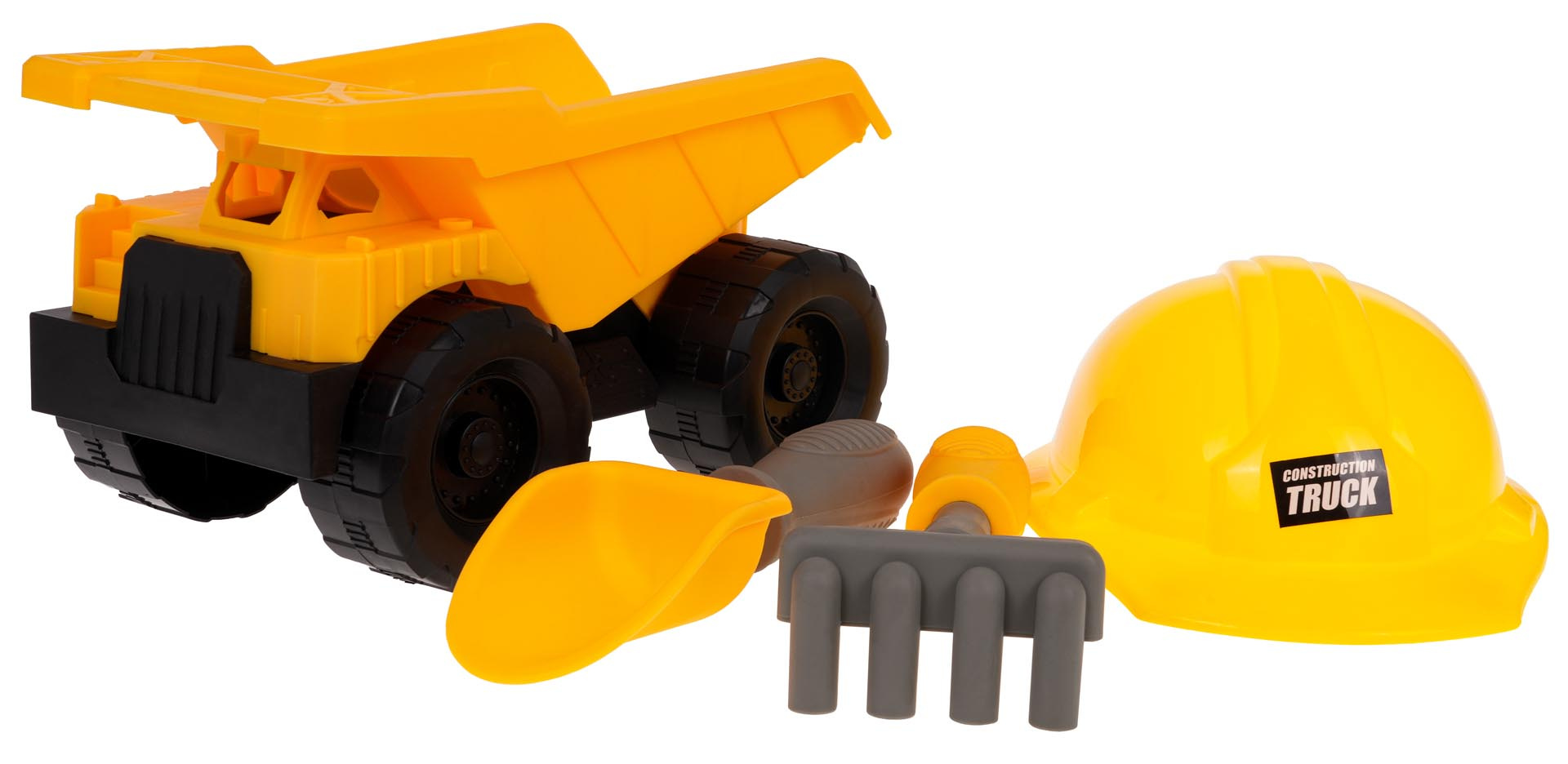 Sada, stavební vozidlo s helmou a příslušenstvím je určena pro děti od 3 let. Tato sada je ideální pro zábavu na čerstvém vzduchu. Vozidlo má pohyblivé prvky a velká otočná kola. Byl vyroben z vysoce kvalitních materiálů, odolných vůči poškození. V sadě můžeme také najít hrábě a lopatku.