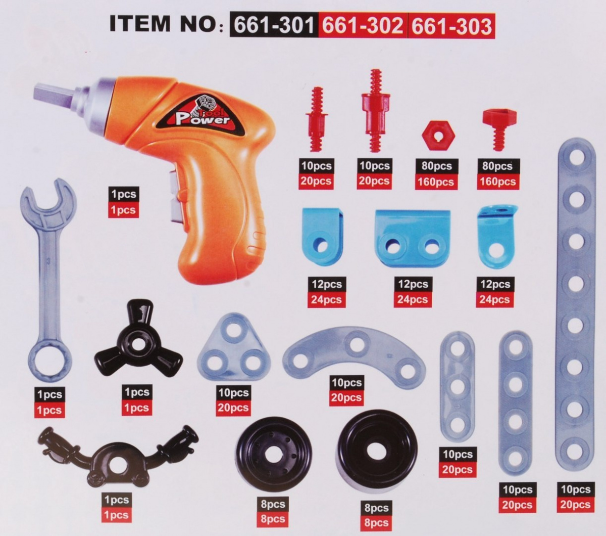 - akumulátorová vrtačka (napájená 2 bateriemi AA - 2 x 1,5 V - nejsou součástí dodávky),