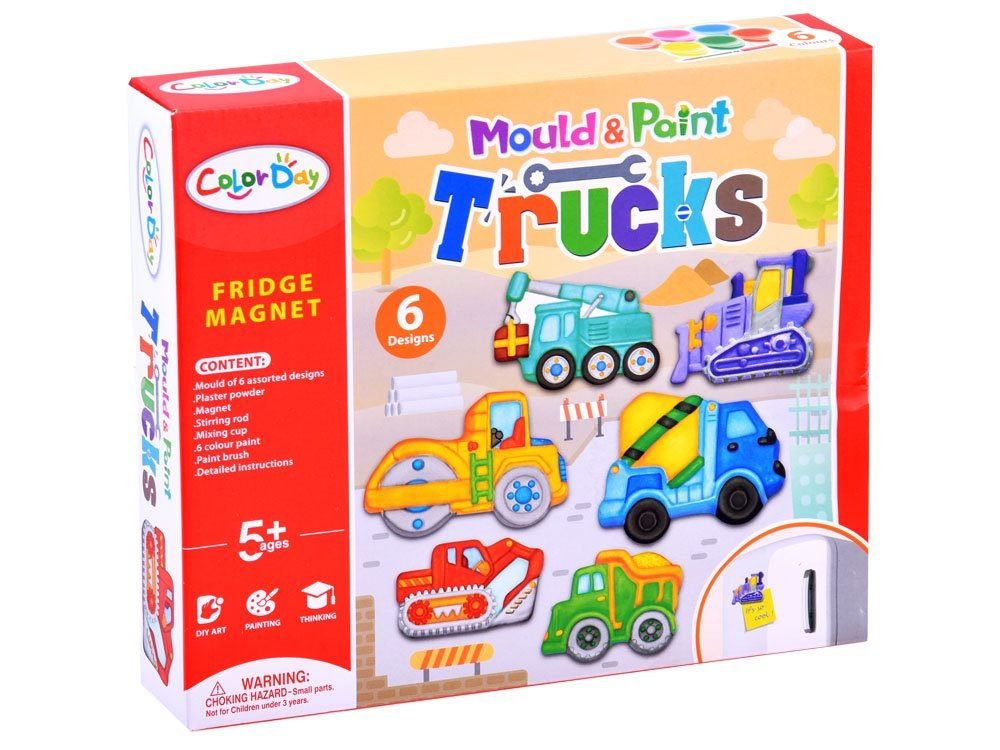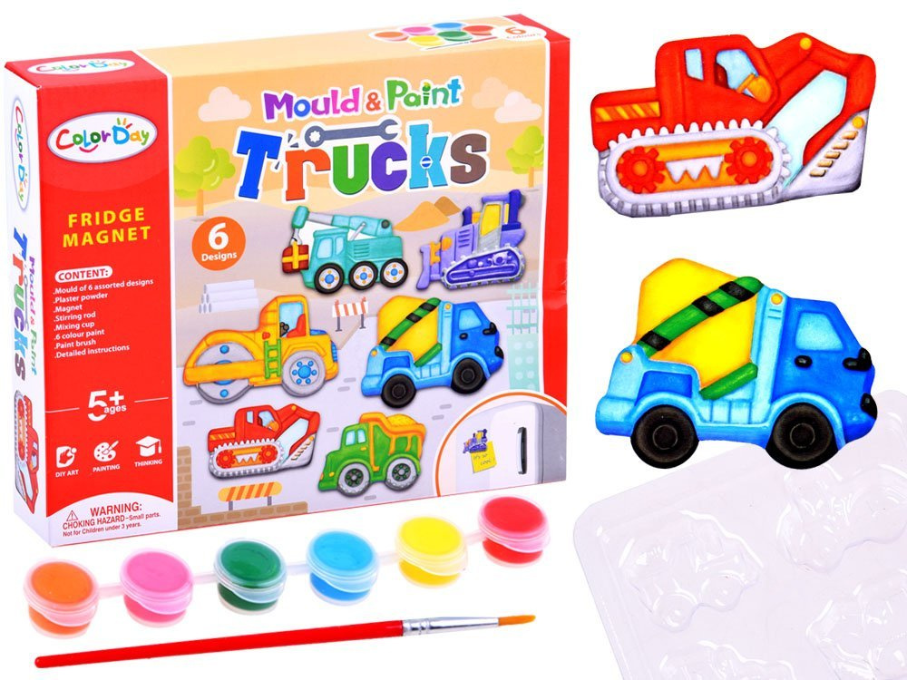Jedná se o skvělou sadu pro kreativní hru, ze které si můžete vyrobit magnetky na ledničku ve tvaru stavebních vozidel: buldozeru, jeřábu, míchačky na beton, válce, bagru a nákladního auta.