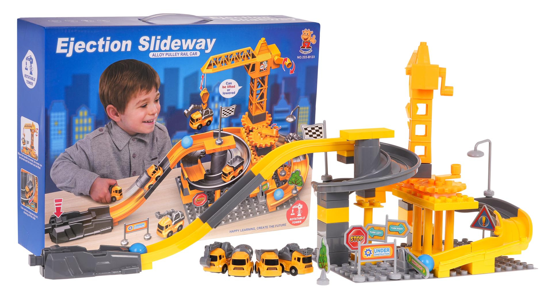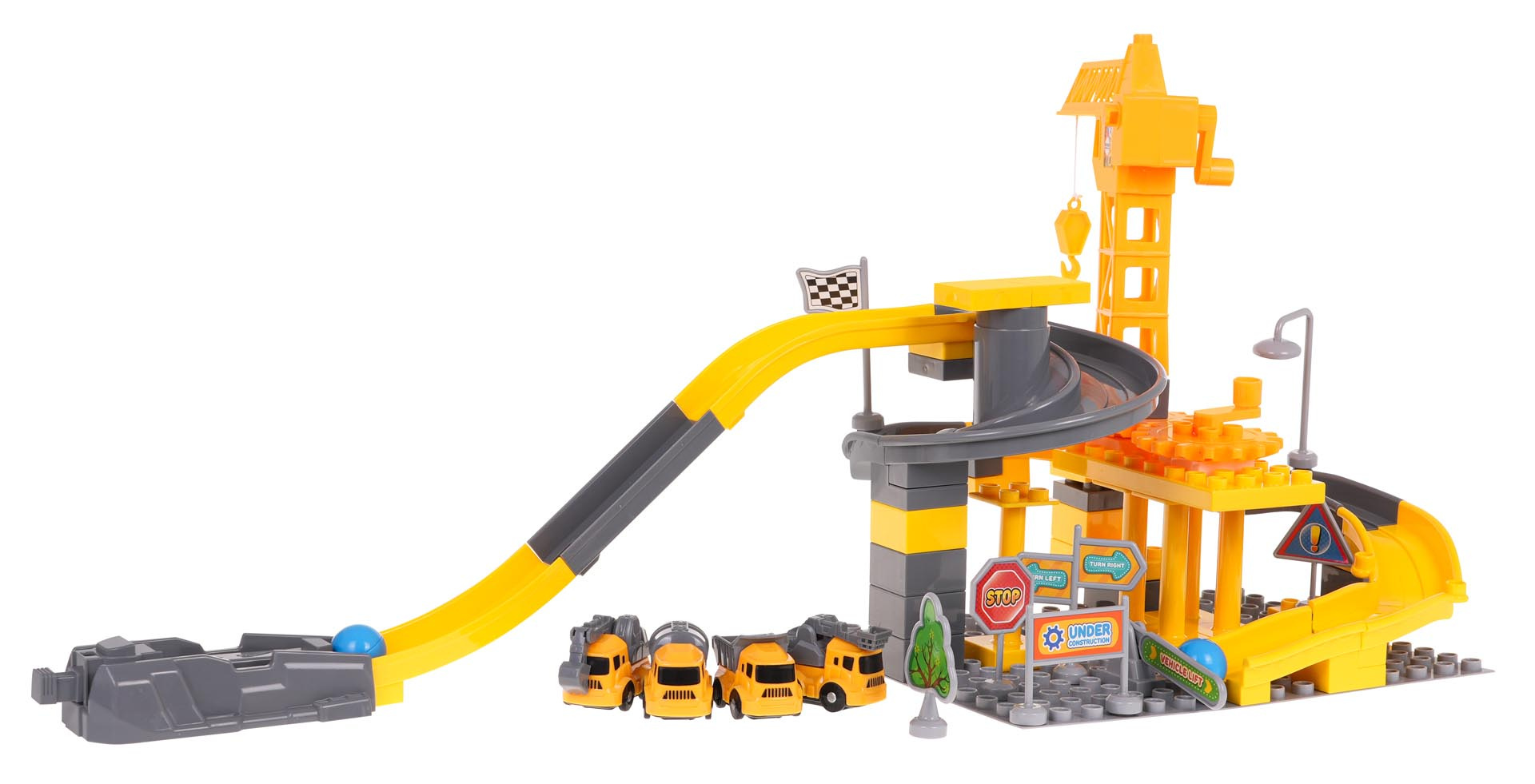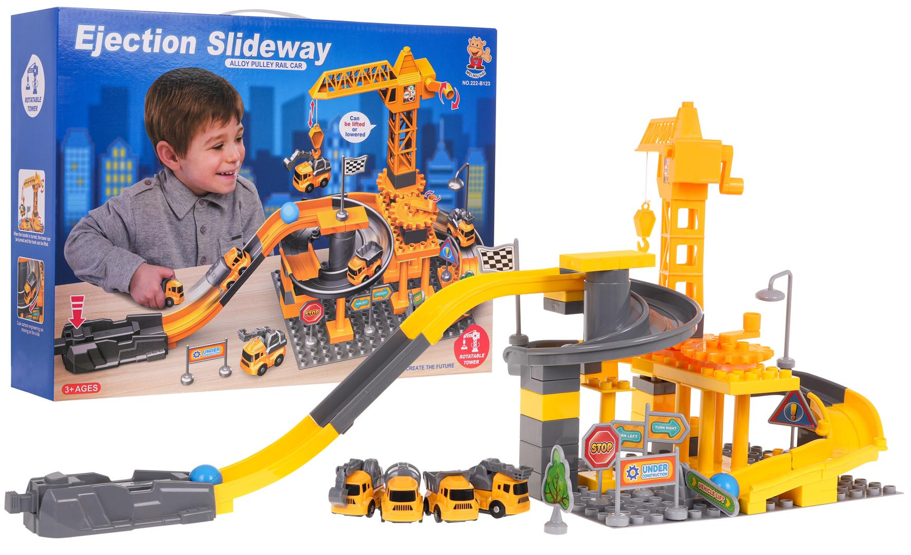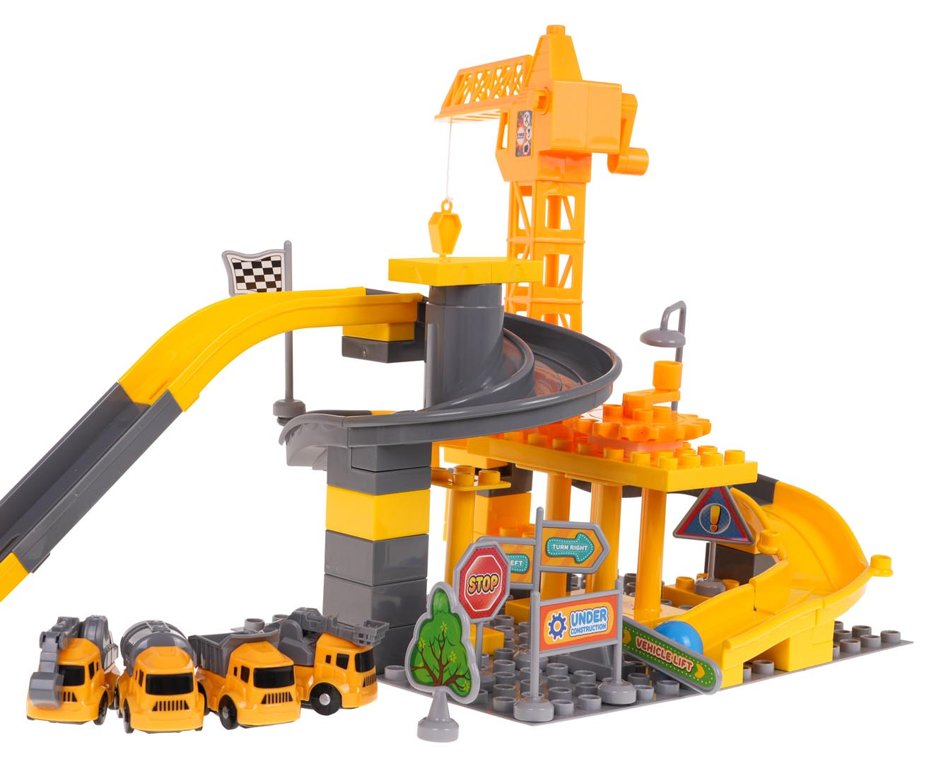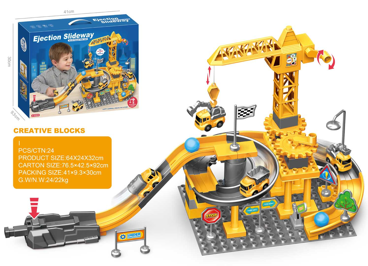 Stavebnice pro děti od 3 let. Sada se skládá z 55 prvků, ze kterých můžeme postavit staveniště se stavebními autíčky, skluzavkou, vystřelovačem pro vozidla a pohyblivým jeřábem. Kostky byly vyrobeny z nejkvalitnějšího plastu v živých barvách, které přitahují pozornost dítěte. Autíčko umístíme na odpalovací rampu a poté ji stiskneme. Vozidlo sjede po skluzavce. V sadě jsou také dvě koule, které se mohou kutálet po drahách. Jeřáb má pohyblivé části. Může se otáčet kolem vlastní osy pomocí kliky umístěné u jeho základny a má spouštěcí a zvedací hák.