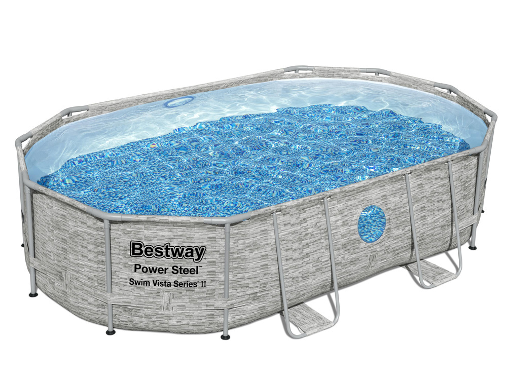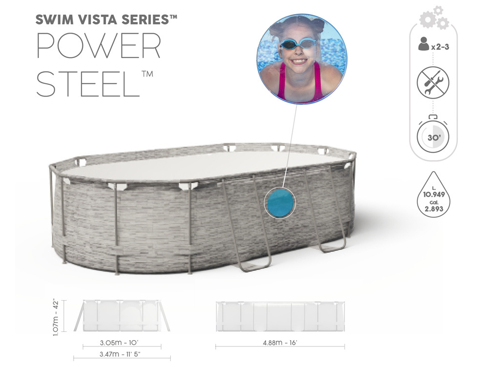 stojanový bazén Bestway Power Steel™ Swim Vista Series™ II s rozměry 488 x 305 x 107 cm a objemem 10 949 litrů vám v horkém dni poskytne blahodárné ochlazení. Netradiční design bazénu, který imituje kamennou zeď, dokonale zapadá do zahrady. Bazén je navíc vybaven dvěma okny, která umožňují pozorovat vlastní zahradu z podvodní perspektivy.