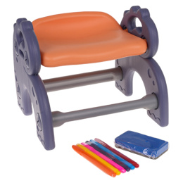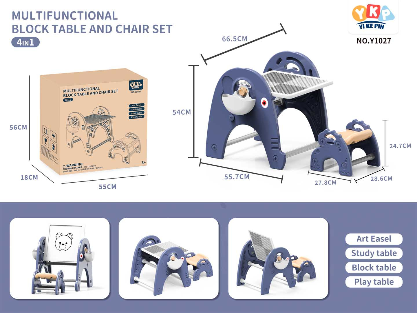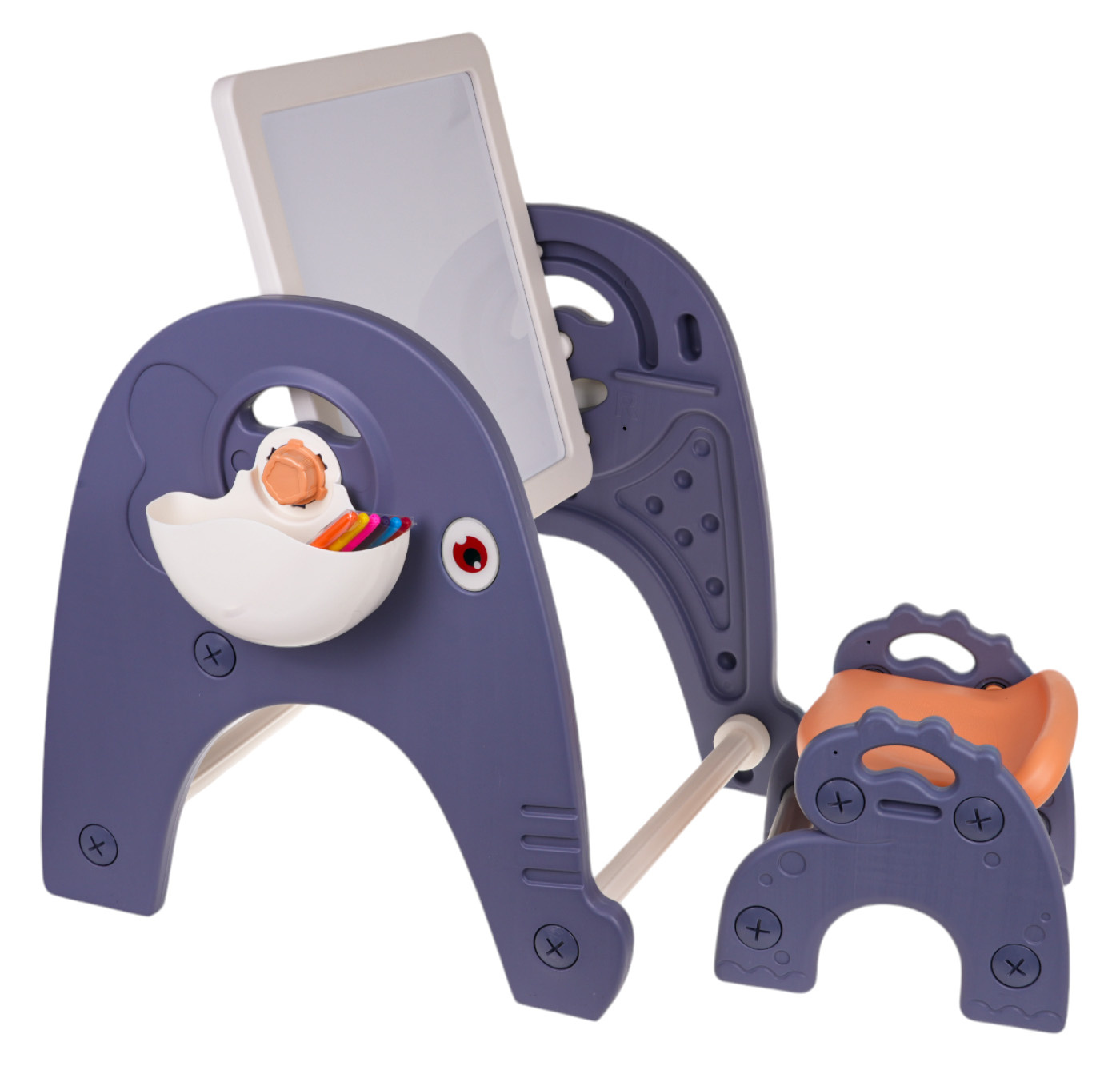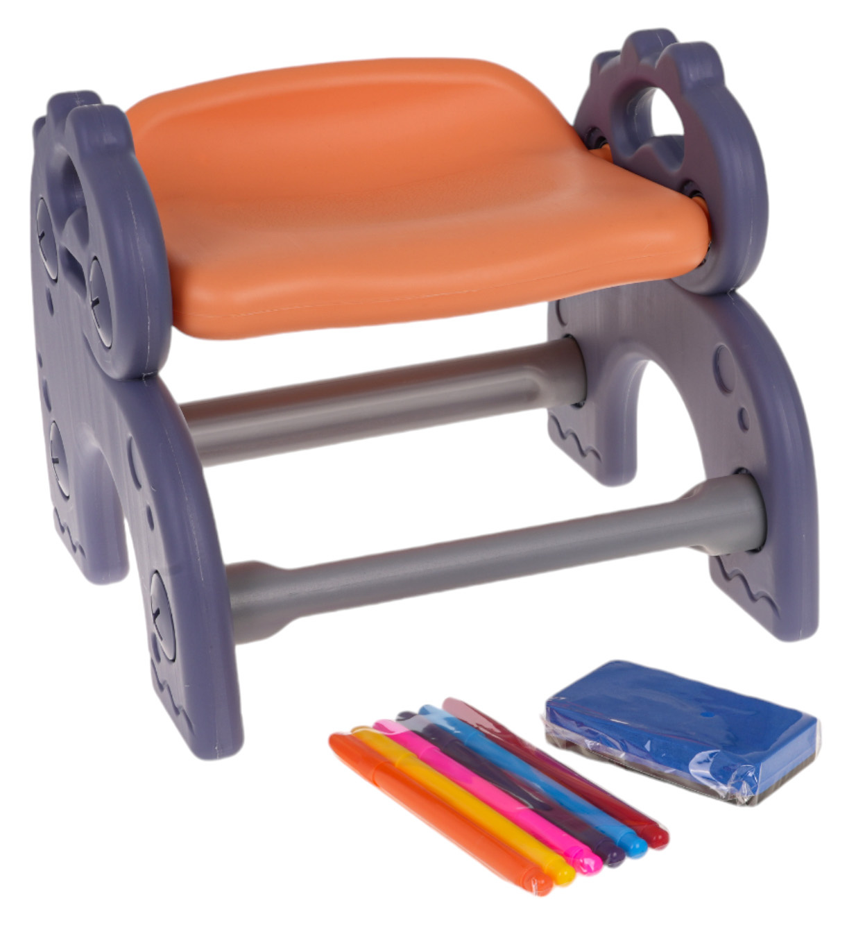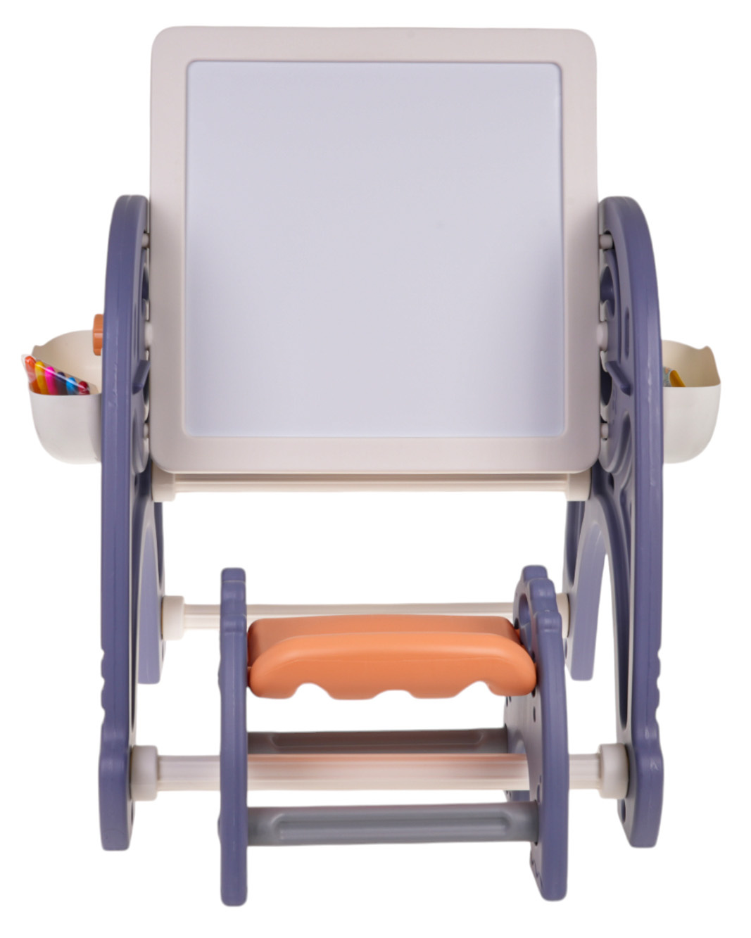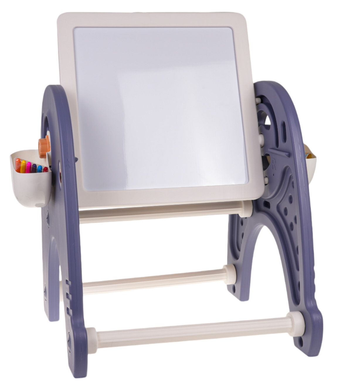 Sada 4 v 1, tabule, stolek, podložka na skládání kostek a židlička pro děti od 3 let. Sada je vyrobena z nejkvalitnějšího plastu, nemá ostré hrany a je stabilní. Na plastových nožkách je umístěna tabule, kterou lze naklánět pod libovolným úhlem a otáčet. Z jedné strany máme tabuli na malování a z druhé podložku na skládání kostek. Z tabulky a podložky můžeme využívat ve svislé nebo vodorovné poloze. V horizontální poloze můžeme sadu používat jako stolek na malování, učení nebo jídlo, nebo jako podstavec na kostky. Do sady je přiložena houbička a 6 fixů. Na stranách sady se nacházejí také dva koše na malířské potřeby. Sada rozvíjí představivost a kognitivní schopnosti dětí.